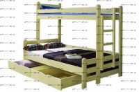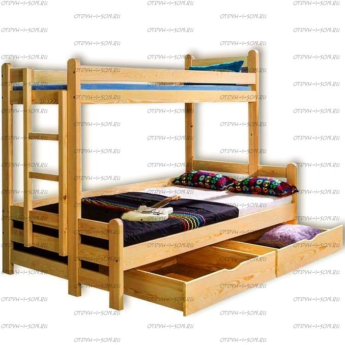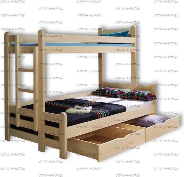 Кровать двухъярусная Бридж Комплектация модели: Спинки 2 штуки, Царга 4 штуки, Планки 2 штуки, Лестница 1 штука, Подматрасники 2 комплекта, ДВП 2 штуки, ящики 2 штуки Характеристики: Размер спального места: Длина спального места: 160 см., 170 см., 180 см., 190 см., 200 см. Ширина верхнего спального места: 80 см., 90 см. Ширина нижнего спального места: 120 см., 140 см. Изголовье: 180 см. Изножье: 180 см. Высота спального места: 43/153 см. Расстояние между ярусами: 87 см. Ширина лестницы: 45 см. Спинка: массив сосны, березовая мебельная фанера 12 мм. Каркас: массив сосны Основание: поперечные брусья массив, ДВП 4-5 мм. Ящики каркас: березовая фанера 12 мм, дно ДВП 4-5 мм, выкатная система (4 колесика) - к кровати не фиксируется Ящики фасад: березовая мебельная фанера 12-16 мм, массив сосны Покрытие: Sayerlack (Италия), Renner (Италия) Внимание: для любой модели кровати возможно увеличение высоты бортиков кровати! Цвет: орех, бук, венге, груша, дуб, каштан, клен, красное дерево, махагон, ольха, сосна, белый (эмаль), слоновая кость (эмаль)