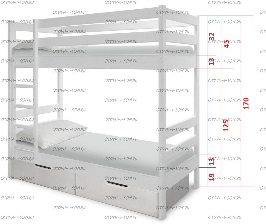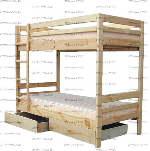 Кровать двухъярусная Модуль №2 Комплектация модели: Спинки 2 штуки, Царга 4 штуки, Планки 4 штуки, Лестница 1 штука, Подматрасники 2 комплекта, ДВП 2 штуки, ящики 2 штуки Характеристики: Размер спального места: Длина спального места: 160 см., 170 см., 180 см., 190 см., 200 см. Ширина верхнего спального места: 70 см., 80 см., 90 см. Ширина нижнего спального места: 70 см., 80 см., 90 см. Изголовье: 170 см. Изножье: 170 см. Высота спального места: 43/148 см. Расстояние между ярусами: 85-88 см. Ширина лестницы: 45 см. Спинка: массив сосны, березовая мебельная фанера 12 мм. Каркас: массив сосны Основание: поперечные брусья массив, ДВП 4-5 мм. Ящики каркас: березовая фанера 12 мм, дно ДВП 4-5 мм, выкатная система (4 колесика) - к кровати не фиксируется Ящики фасад: березовая мебельная фанера 12-16 мм, массив сосны Покрытие: Sayerlack (Италия), Renner (Италия) Внимание: возможно увеличение высоты бортиков кровати! Цвет: орех, бук, венге, груша, дуб, каштан, клен, красное дерево, махагон, ольха, сосна, белый (эмаль), слоновая кость (эмаль)