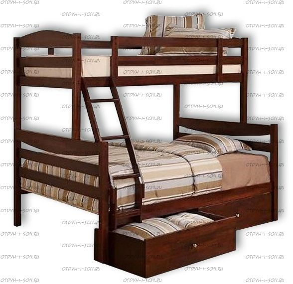Кровать двухъярусная Алина с ящиками Комплектация модели: Спинка 4 штуки, Царга 4 штуки, Планка 4 штуки, Лестница 1 штука, Подматрасники 2 комплекта, ДВП 2 штуки, Ящики 1 комплект Характеристики: Размер спального места: Длина спального места: 160 см., 170 см., 180 см., 190 см., 200 см. Ширина верхнего спального места: 80 см., 90 см. Ширина нижнего спального места: 120 см., 140 см. Изголовье: 180/90 см. Изножье: 180/90 см. Высота спального места: 43/148 см. Расстояние между ярусами: 85-87 см. Ширина лестницы: 45 см. Спинка: массив сосны, березовая мебельная фанера 12 мм. Каркас: массив сосны Основание: поперечные брусья массив, ДВП 4-5 мм. Ящики каркас: березовая фанера 12 мм, дно ДВП 4-5 мм, выкатная система (4 колесика) - к кровати не фиксируется Ящики фасад: березовая мебельная фанера 12-16 мм, массив сосны Покрытие: Sayerlack (Италия), Renner (Италия) Внимание: для любой модели кровати ВМК Шале возможно увеличение высоты бортиков кровати! Цвет: орех, бук, венге, груша, дуб, каштан, клен, красное дерево, махагон, ольха, сосна, белый (эмаль), слоновая кость (эмаль)