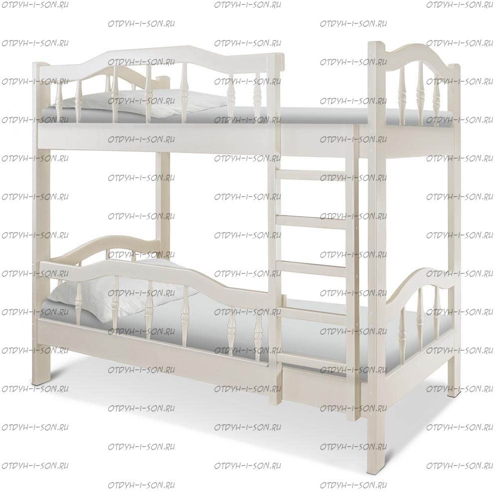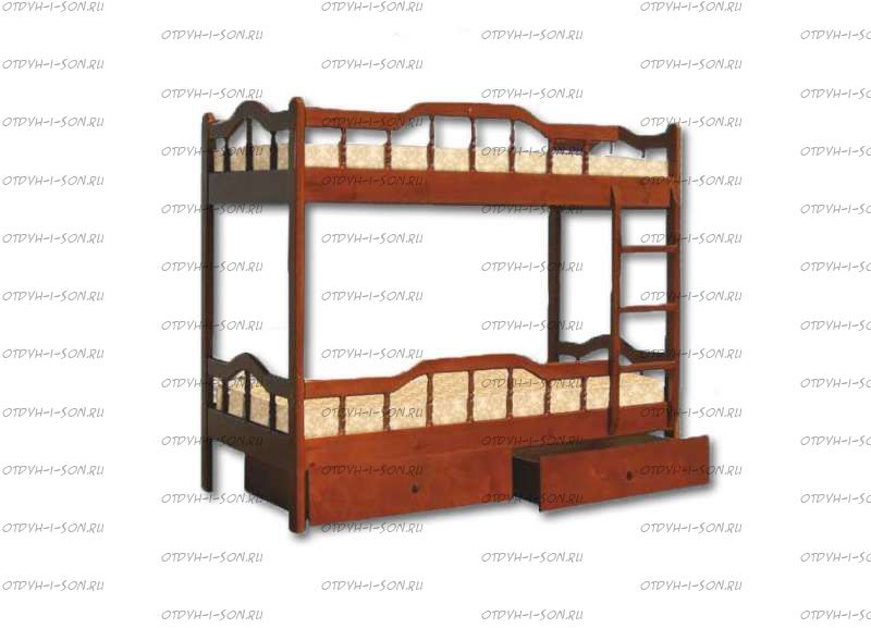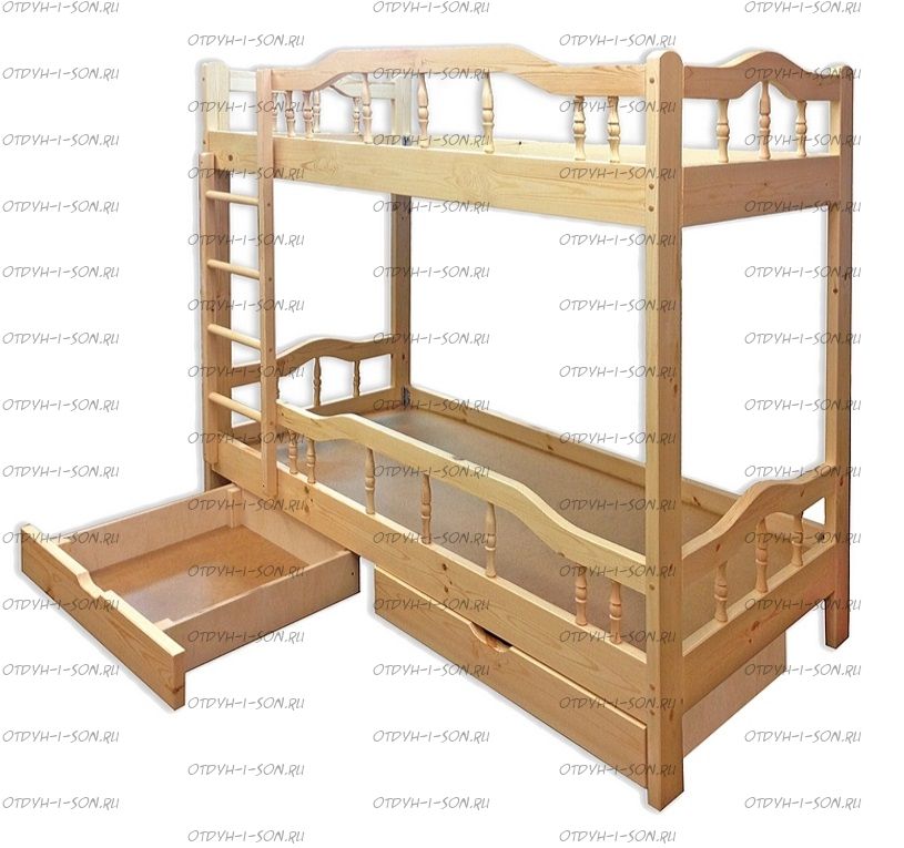 Кровать двухъярусная Джерри Комплектация модели: Спинки 2 штуки, Царга 4 штуки, Борт 2 штуки, Лестница 1 штука, Подматрасники 2 комплекта, ДВП 2 штуки, ящики 2 штуки Характеристики: Размер спального места: Длина спального места: 160 см., 170 см., 180 см., 190 см., 200 см. Ширина верхнего спального места: 70 см., 80 см., 90 см. Ширина нижнего спального места: 70 см., 80 см., 90 см. Изголовье: 170 см. Изножье: 170 см. Высота спального места: 43/148 см. Расстояние между ярусами: 83-85 см. Ширина лестницы: 45 см. Спинка: массив сосны, березовая мебельная фанера 12 мм. Каркас: массив сосны Основание: поперечные брусья массив, ДВП 4-5 мм. Ящики каркас: березовая фанера 12 мм, дно ДВП 4-5 мм, выкатная система (4 колесика) - к кровати не фиксируется Ящики фасад: березовая мебельная фанера 12-16 мм, массив сосны Покрытие: Sayerlack (Италия), Renner (Италия) Внимание: возможно увеличение высоты бортиков кровати! Цвет: орех, бук, венге, груша, дуб, каштан, клен, красное дерево, махагон, ольха, сосна, белый (эмаль), слоновая кость (эмаль)