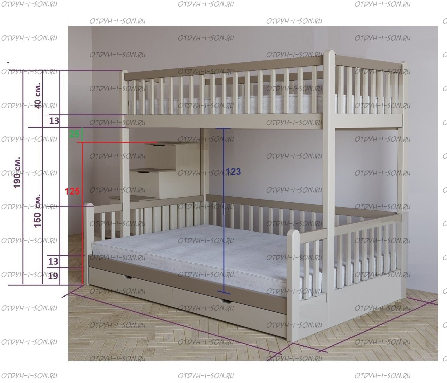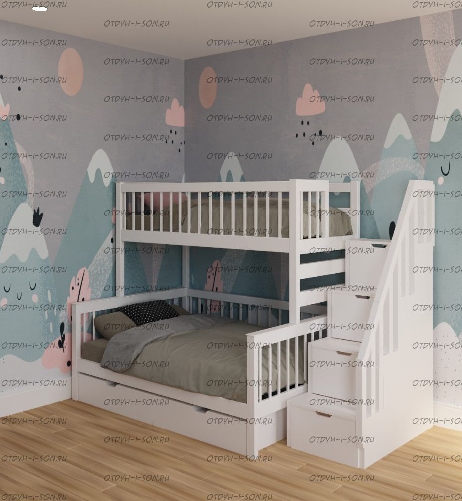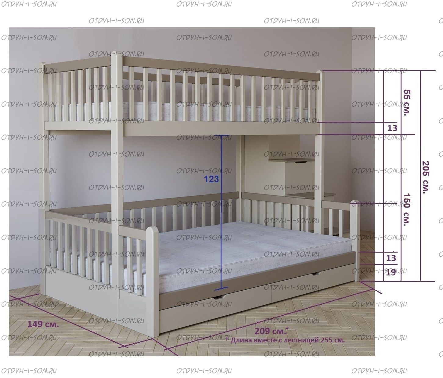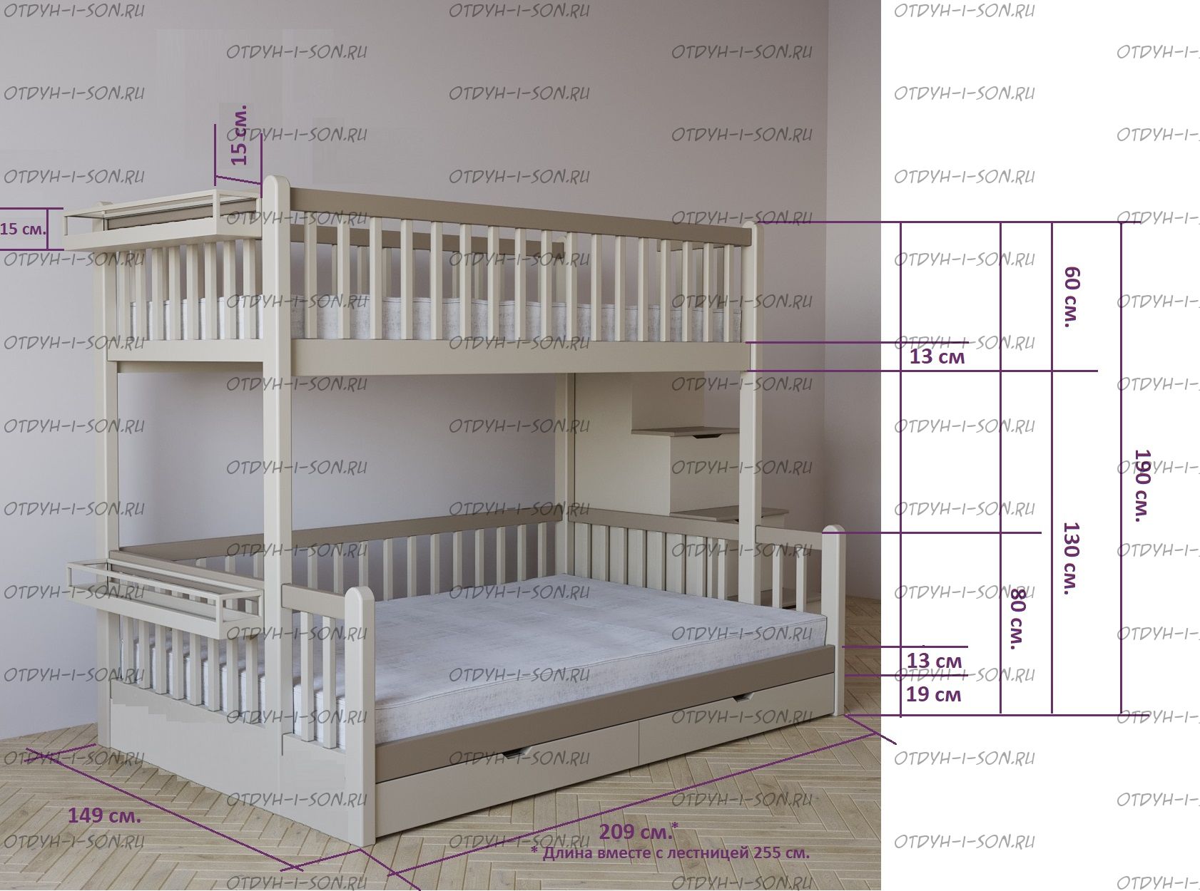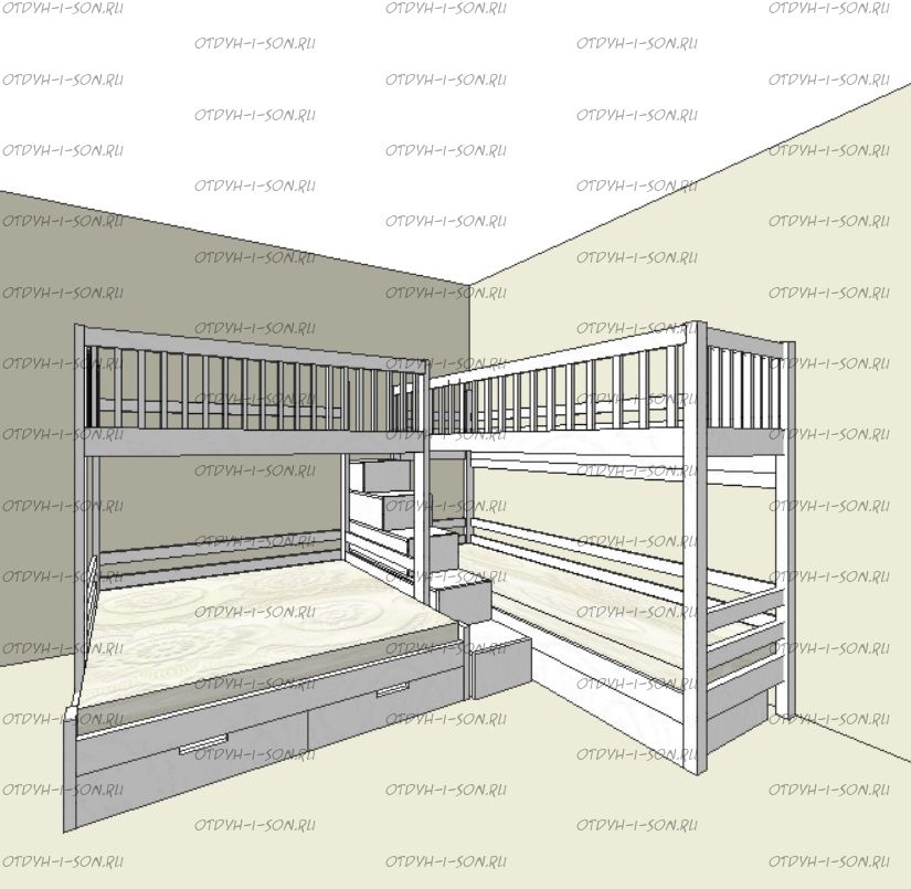 | Внимание | Расположение лестницы у данной модели: с любой стороны кровати! |