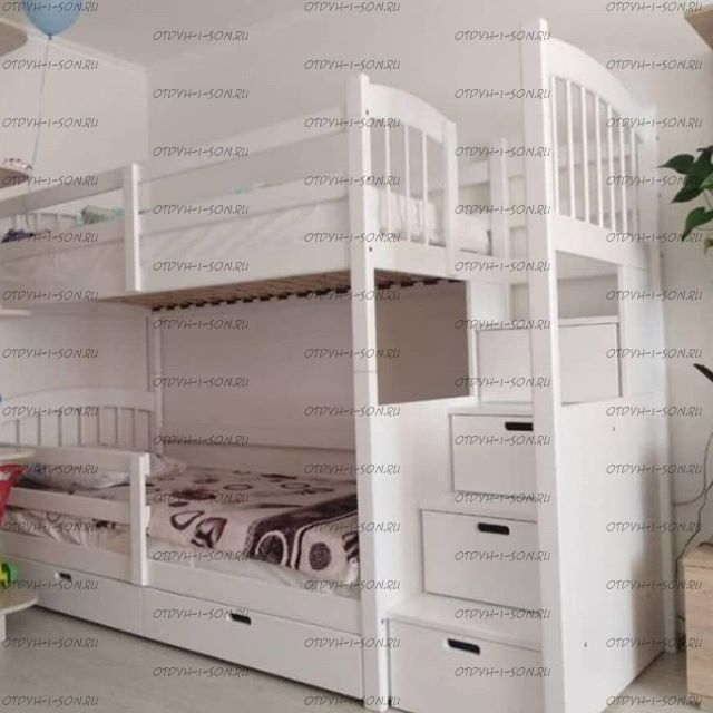 Кровать двухъярусная Артек №5W Fairy Land Комплектация модели: Спинки 4 штуки, Царга 4 штуки, Планки 4 штуки, Лестница 1 штука, Подматрасники 2 комплекта, ДВП 3 штуки. Характеристики: Размер спального места: Длина спального места: 160 см., 170 см., 180 см., 190 см., 200 см. Ширина верхнего спального места: 70 см., 80 см., 90 см. Ширина нижнего спального места: 70 см. Изголовье: 190/95 см. Изножье: 190/95 см. Высота спального места: 43/148 см. Расстояние между ярусами: 85 см. Габариты лестницы: 45х90х190 см. Спинка: массив сосны, березовая мебельная фанера 12 мм. Каркас: массив сосны Основание: поперечные брусья массив, ДВП 4-5 мм. Ящики каркас: березовая фанера 12 мм, дно ДВП 4-5 мм, выкатная система (4 колесика) - к кровати не фиксируется Ящики фасад: березовая мебельная фанера 12-16 мм, массив сосны Покрытие: Sayerlack (Италия), Renner (Италия) Внимание: возможно увеличение высоты бортиков кровати! Цвет: орех, бук, венге, груша, дуб, каштан, клен, красное дерево, махагон, ольха, сосна, белый (эмаль), слоновая кость (эмаль)