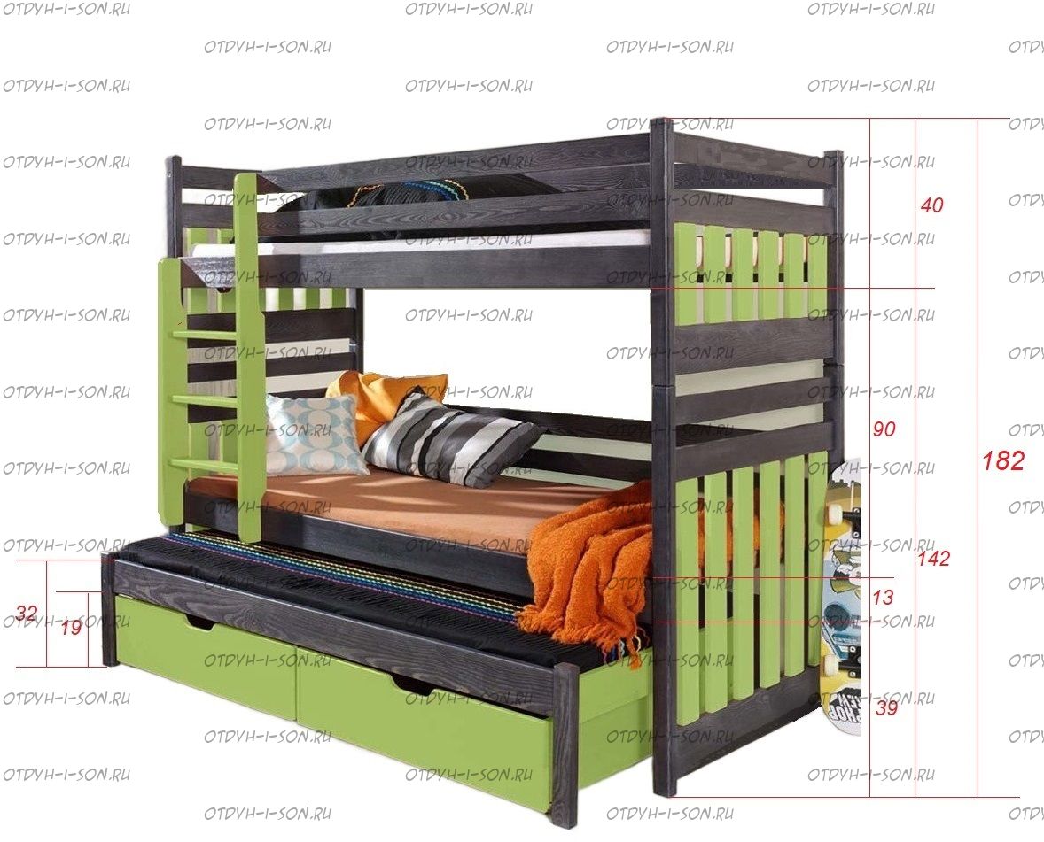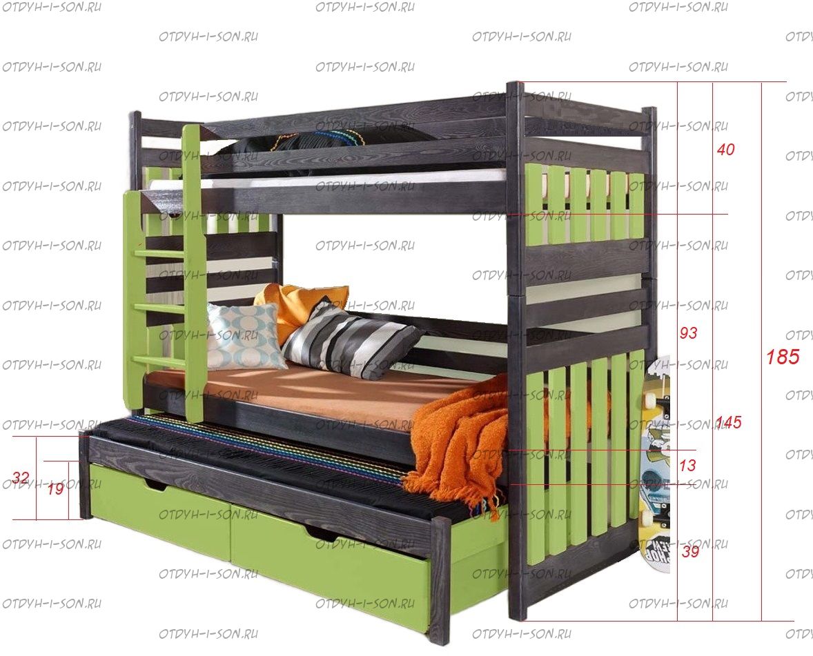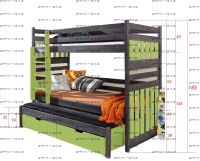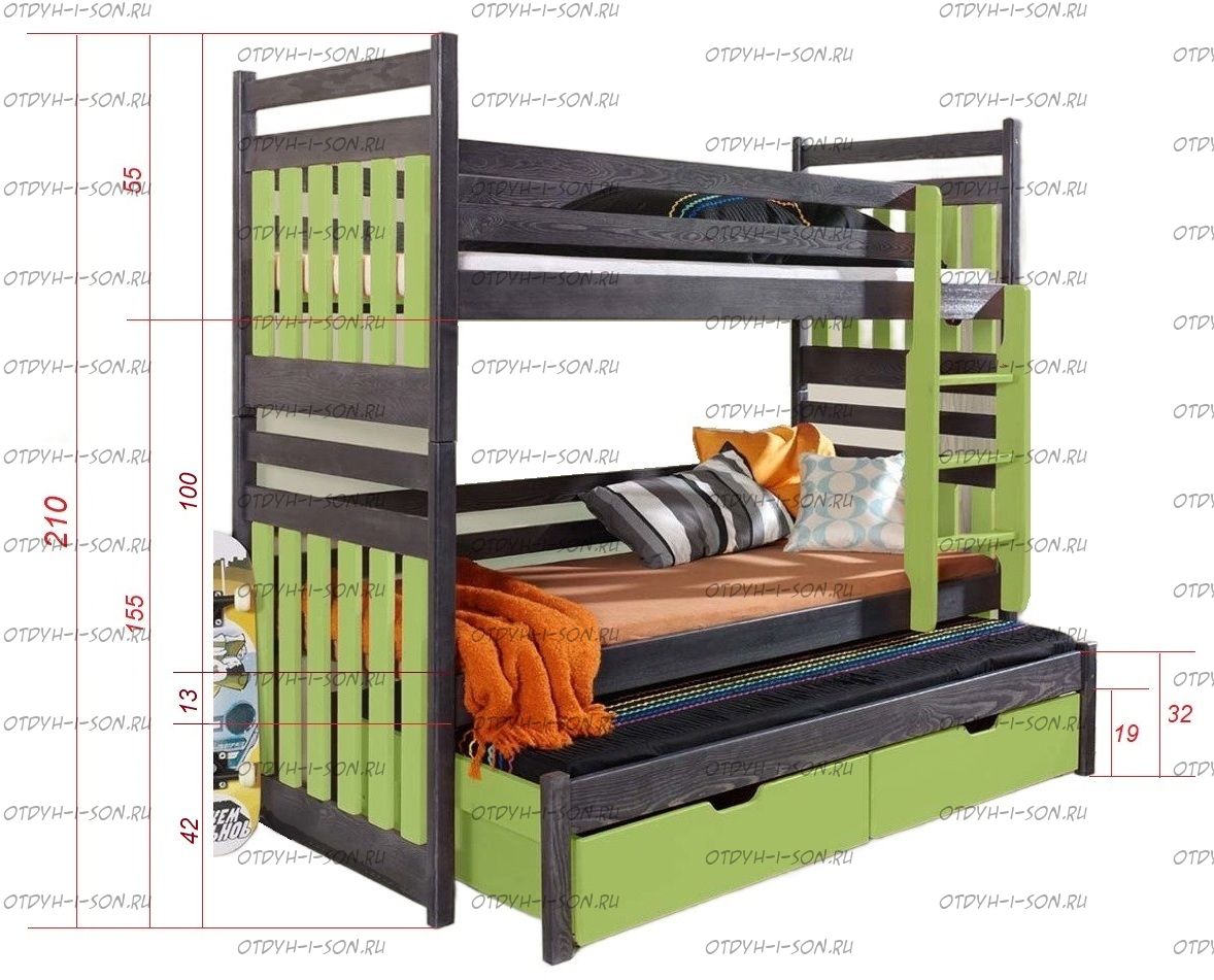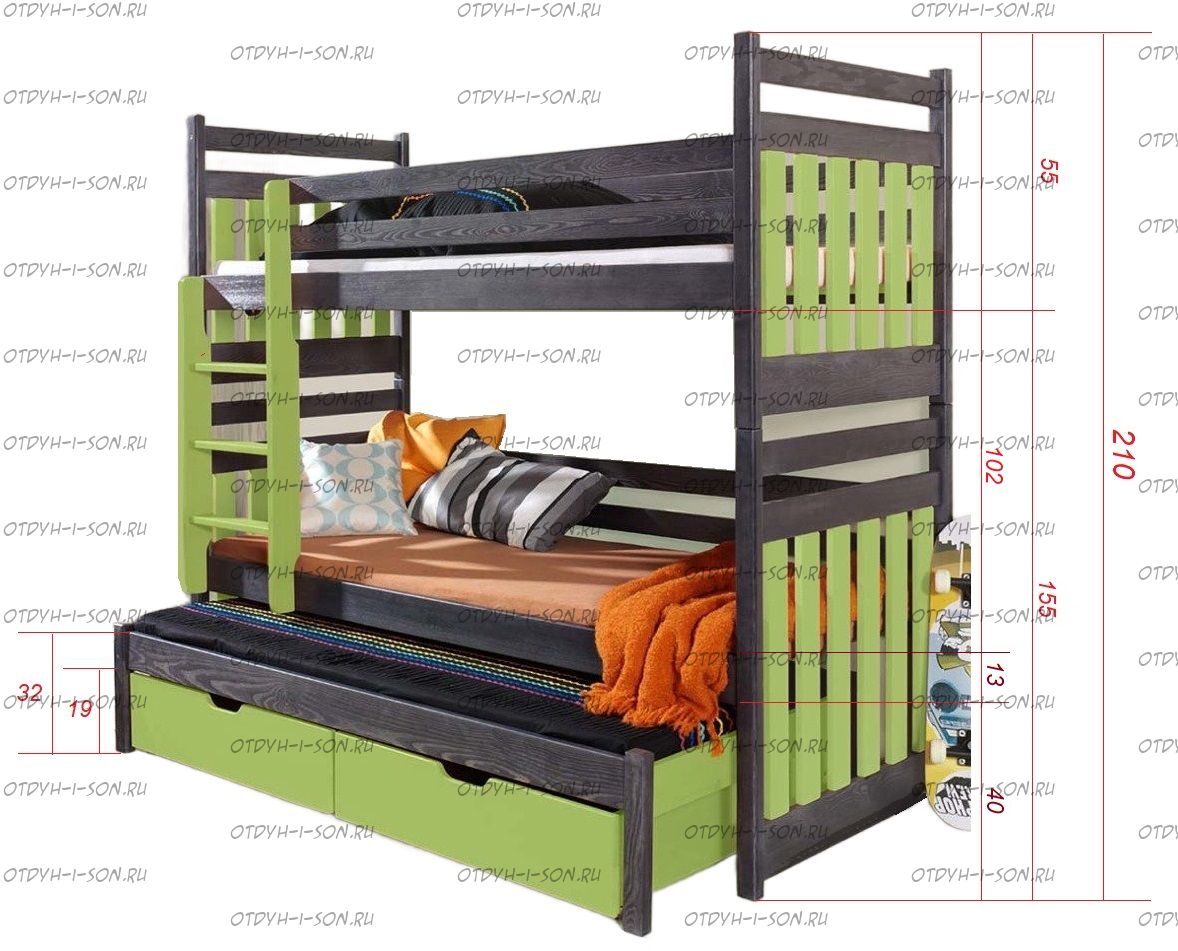 Кровать трехъярусная Малинка №12 Характеристики: Размер спального места: спальные места одинаковые по размеру Длина спального места: 160 см., 170 см., 180 см., 190 см., 200 см. или любой другой на Ваш выбор Ширина спального места: 70 см., 80 см., 90 см. или любой другой на Ваш выбор Изголовье: 170 см. уточняйте у оператора Изножье: 170 см. уточняйте у оператора Высота спального места: 43/148 см. уточняйте у оператора Расстояние между ярусами: 83-85 см. уточняйте у оператора Ширина лестницы: 45 см. уточняйте у оператора Спинка: массив сосны, березовая мебельная фанера 12 мм. Каркас: массив сосны Основание: поперечные брусья массив, ДВП 4-5 мм. Ящики каркас: березовая фанера 12 мм, дно ДВП 4-5 мм, выкатная система (4 колесика) - к кровати не фиксируется Ящики фасад: березовая мебельная фанера 12-16 мм, массив сосны Покрытие: Sayerlack (Италия), Renner (Италия) Внимание: возможно увеличение высоты бортиков кровати! Цвет: орех, бук, венге, груша, дуб, каштан, клен, красное дерево, махагон, ольха, сосна, белый (эмаль), слоновая кость (эмаль)