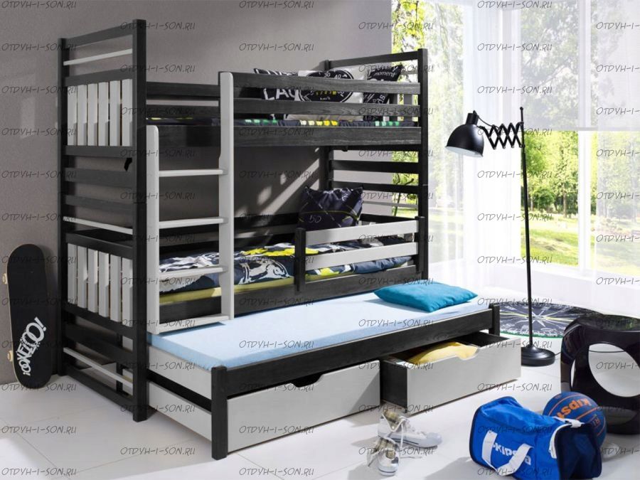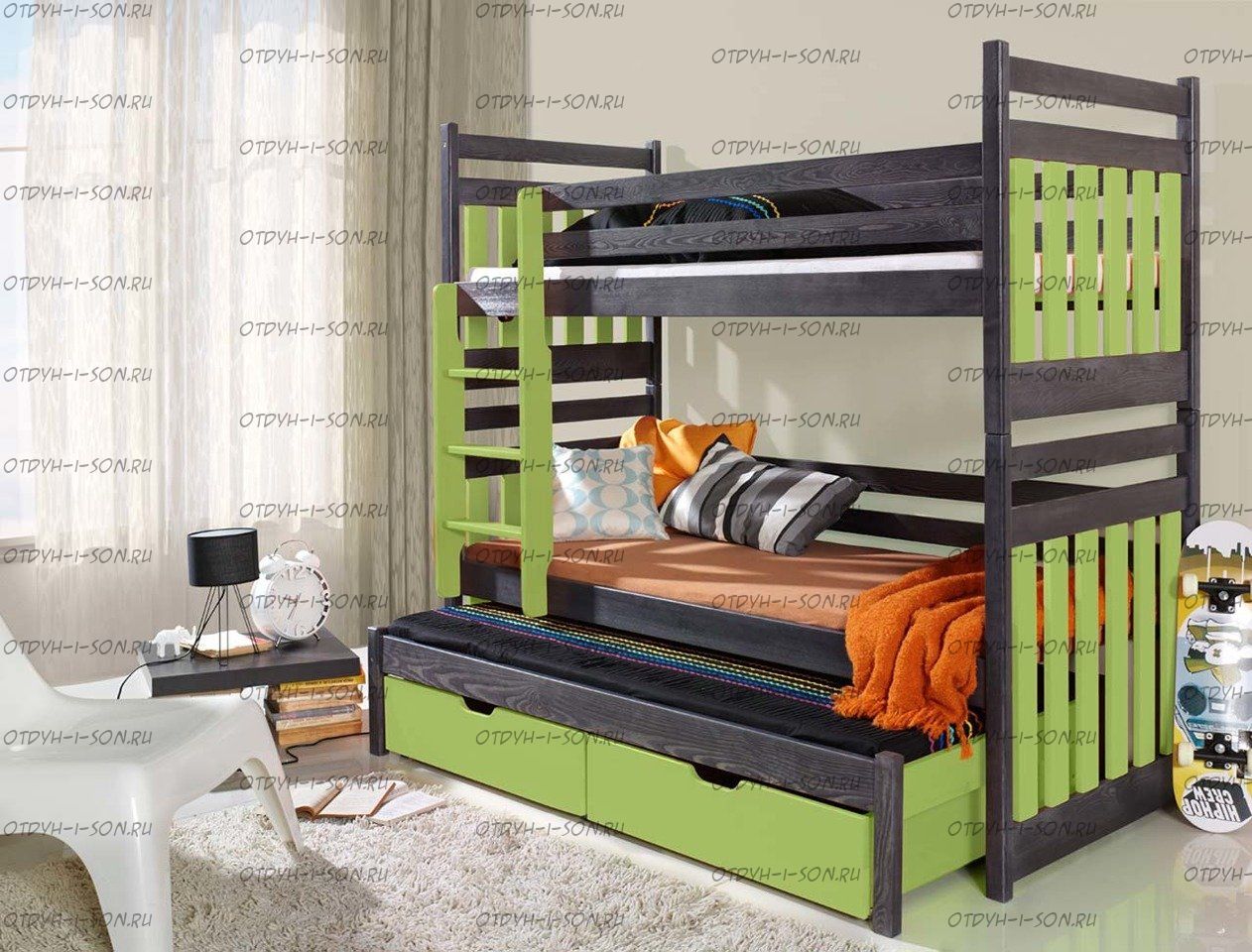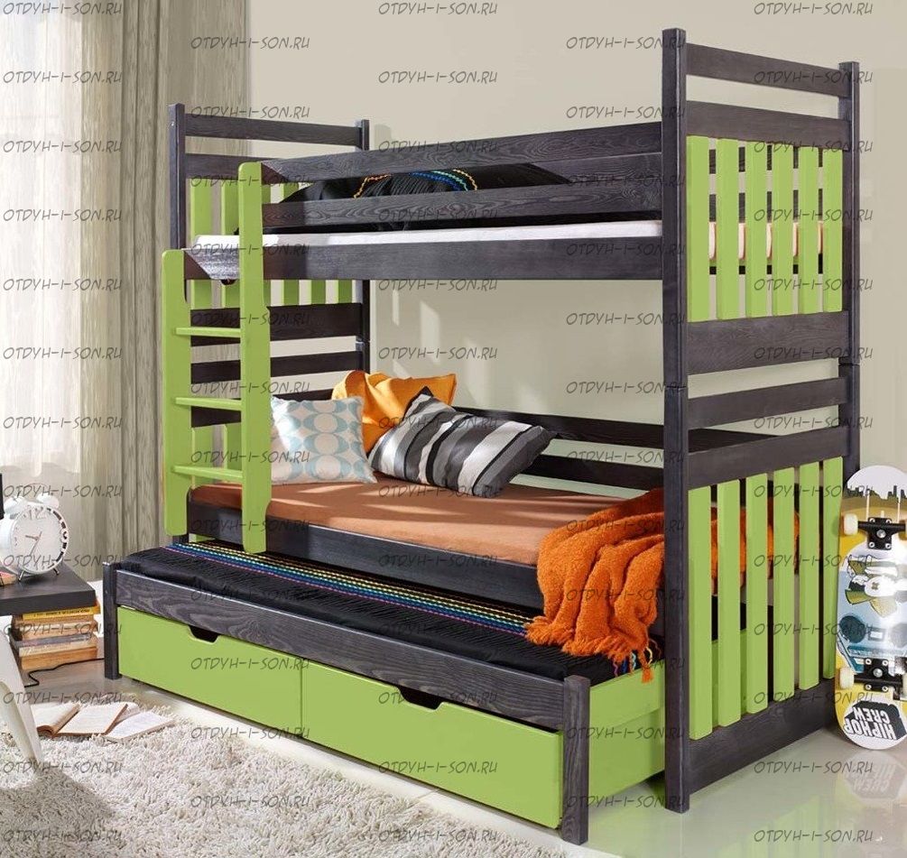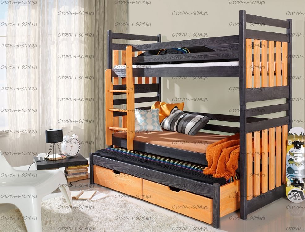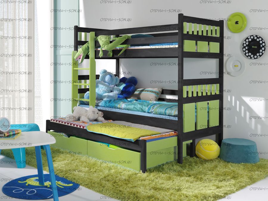 Кровать трехъярусная Малинка №12 Характеристики: Размер спального места: спальные места одинаковые по размеру Длина спального места: 160 см., 170 см., 180 см., 190 см., 200 см. или любой другой на Ваш выбор Ширина спального места: 70 см., 80 см., 90 см. или любой другой на Ваш выбор Изголовье: 170 см. уточняйте у оператора Изножье: 170 см. уточняйте у оператора Высота спального места: 43/148 см. уточняйте у оператора Расстояние между ярусами: 83-85 см. уточняйте у оператора Ширина лестницы: 45 см. уточняйте у оператора Спинка: массив сосны, березовая мебельная фанера 12 мм. Каркас: массив сосны Основание: поперечные брусья массив, ДВП 4-5 мм. Ящики каркас: березовая фанера 12 мм, дно ДВП 4-5 мм, выкатная система (4 колесика) - к кровати не фиксируется Ящики фасад: березовая мебельная фанера 12-16 мм, массив сосны Покрытие: Sayerlack (Италия), Renner (Италия) Внимание: возможно увеличение высоты бортиков кровати! Цвет: орех, бук, венге, груша, дуб, каштан, клен, красное дерево, махагон, ольха, сосна, белый (эмаль), слоновая кость (эмаль)