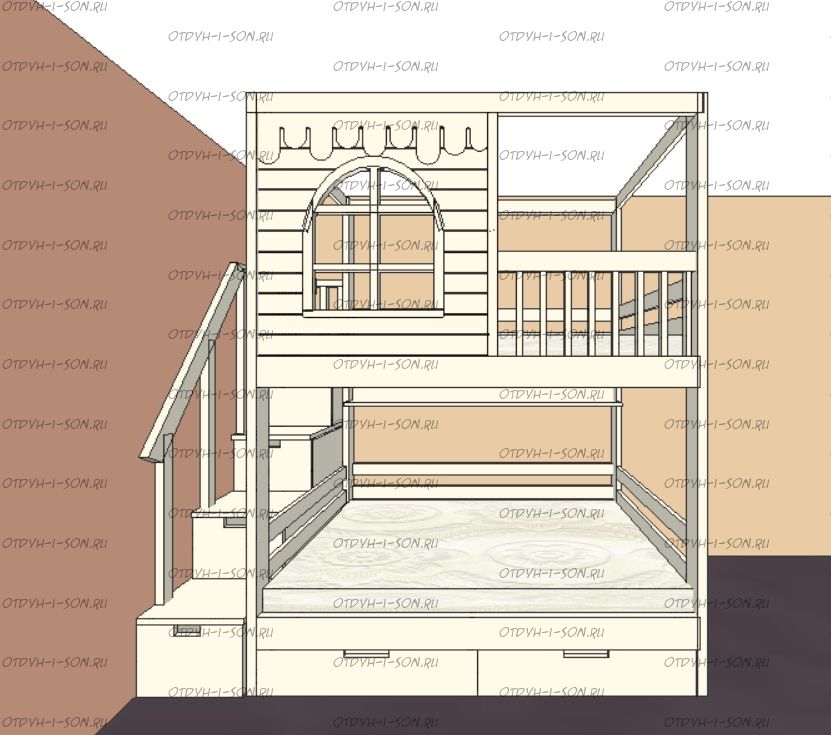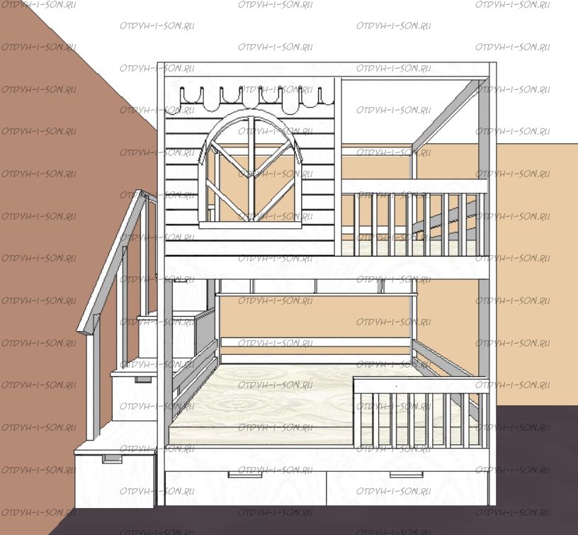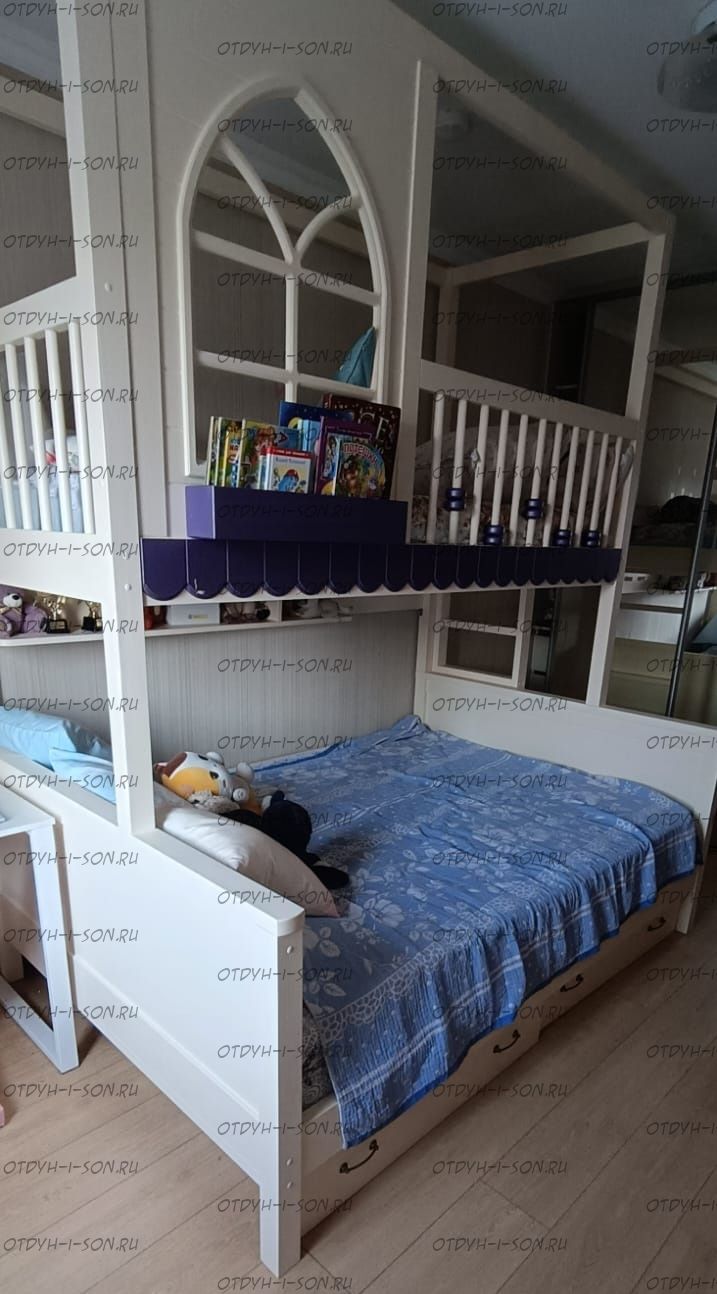 Кровать двухъярусная Домик Santana Sky №48, Массив Характеристики: Размер спального места: 70Х160, 70Х180, 70Х190, 70х200, 80Х160, 80Х180, 80Х190, 80х200, 90Х160, 90Х180, 90Х190, 90х200, 120х190, 120х200 см. Нестандарт: да, возможно, изготавливаем мебель по Вашим проектам. Материалы: массив дерева. Размер, цвет и декор также могут быть индивидуальны. Подкатное, третье спальное место докупается отдельно.