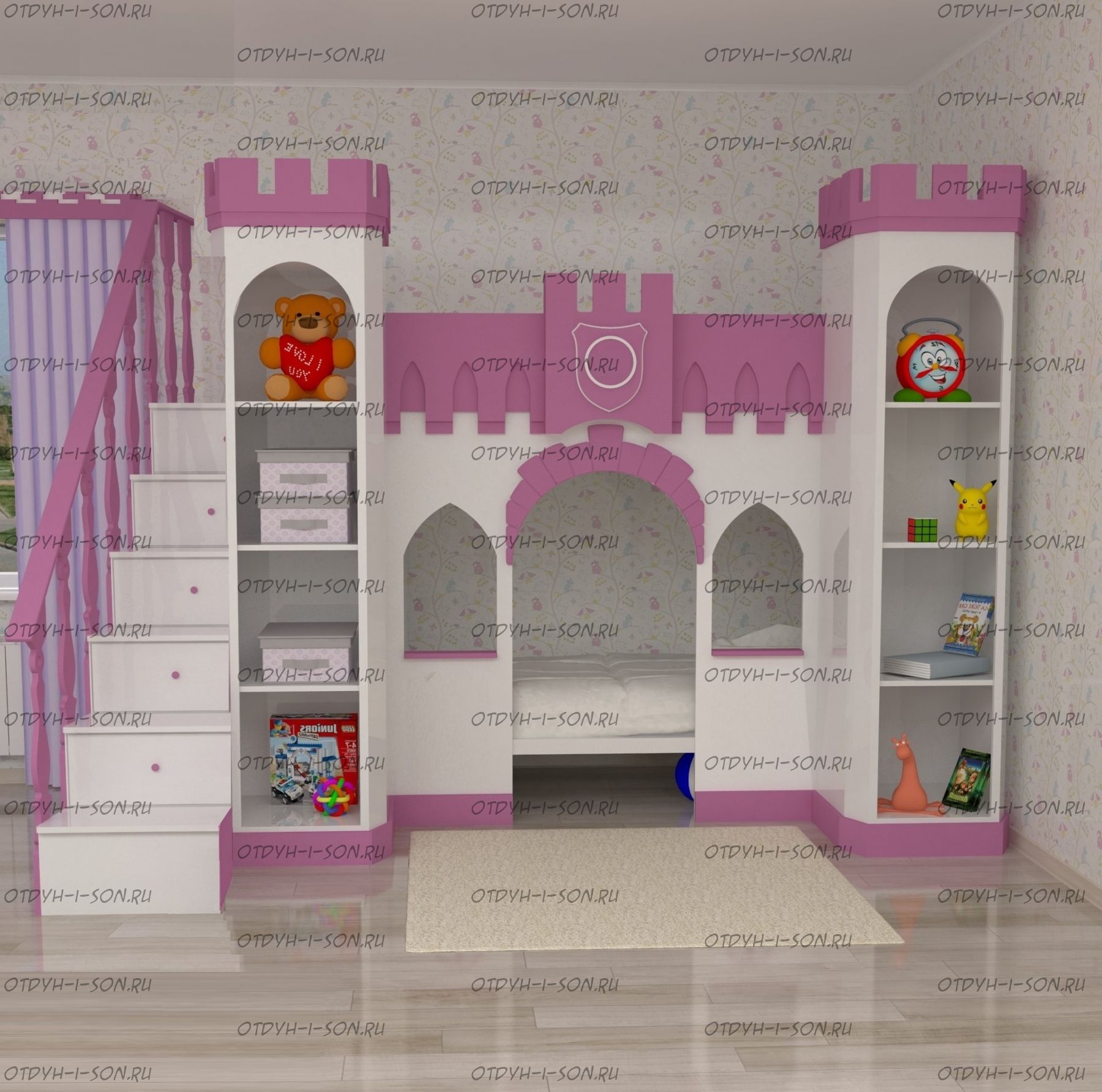 Кровать двухъярусная Принцесса Замок №7 Характеристики: Размер спальных мест: любой по Вашему желанию. Несколько вариантов изготовления: Кровать + лестница Стандарт Кровать + две лестницы Люкс