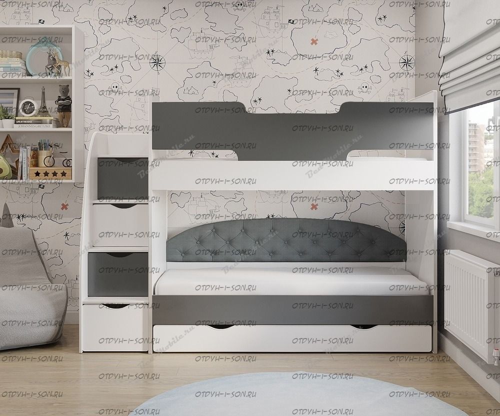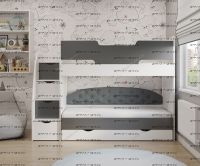 Кровать двухъярусная Юниор-13 со ступенями изготовлена из высококачественного ЛДСП. Кровать подойдет для маленьких детей, так как данная модель оснащена лесенкой в виде ступенек, по которым удобно подниматься на верхний ярус и спускаться вниз и для подростков. В ступенях выдвижные ящики (на роликовых направляющих). Внизу один выкатной ящик на колесиках, внутри поделен на 2 секции.