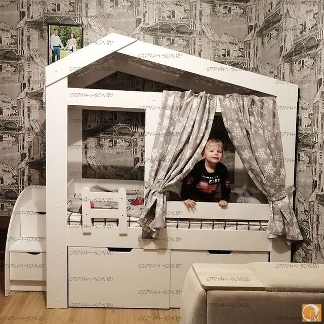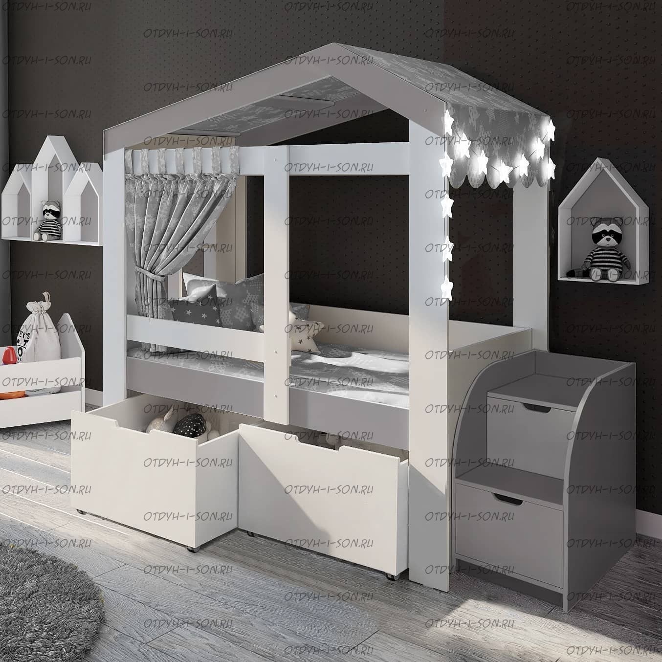 Кровать-домик Сказка ДС-36/1 Комплектация: Детская кровать Домик Сказка (цветная ЛДСП) 80х160 см., Шторы докупаются отдельно Ящики зависят от комплектации Характеристики: Размер спального места: 80х160 или 80х180 см., Внешние габариты кровати 80х160 см.: Длина 1760 мм. Ширина 864 мм. Высота .. мм. Внешние габариты кровати 80х180 см.: Длина 1960 мм. Ширина 836 мм. Высота .. мм. Материал: ЛДСП 16 мм (Австрия, Egger)толщина 16 мм, класс экологичности Е1; Фурнитура: импортная фурнитура Кромка: кромка пвх (2 мм) Цвет: более 15 цветов и оттенков Домик сказка выполнен из высококачественного и надежного ЛДСП. В комплектацию входит высокий борт, что позволяет разместить детей от 1,5 лет и старше. Кровать домик можно использовать без переднего борта, для этого необходимо приобрести дополнительную царгу арт. ДС-11. На заднюю спинку кровати можно нанести рисунок. Выбрать рисунок можно из предложенной палитры. Базовая комплектация — это только корпус кровати. Ящик, шторы и балдахин — приобретается дополнительно.