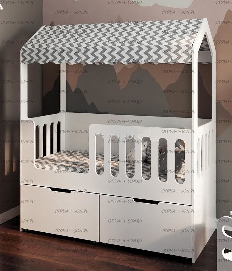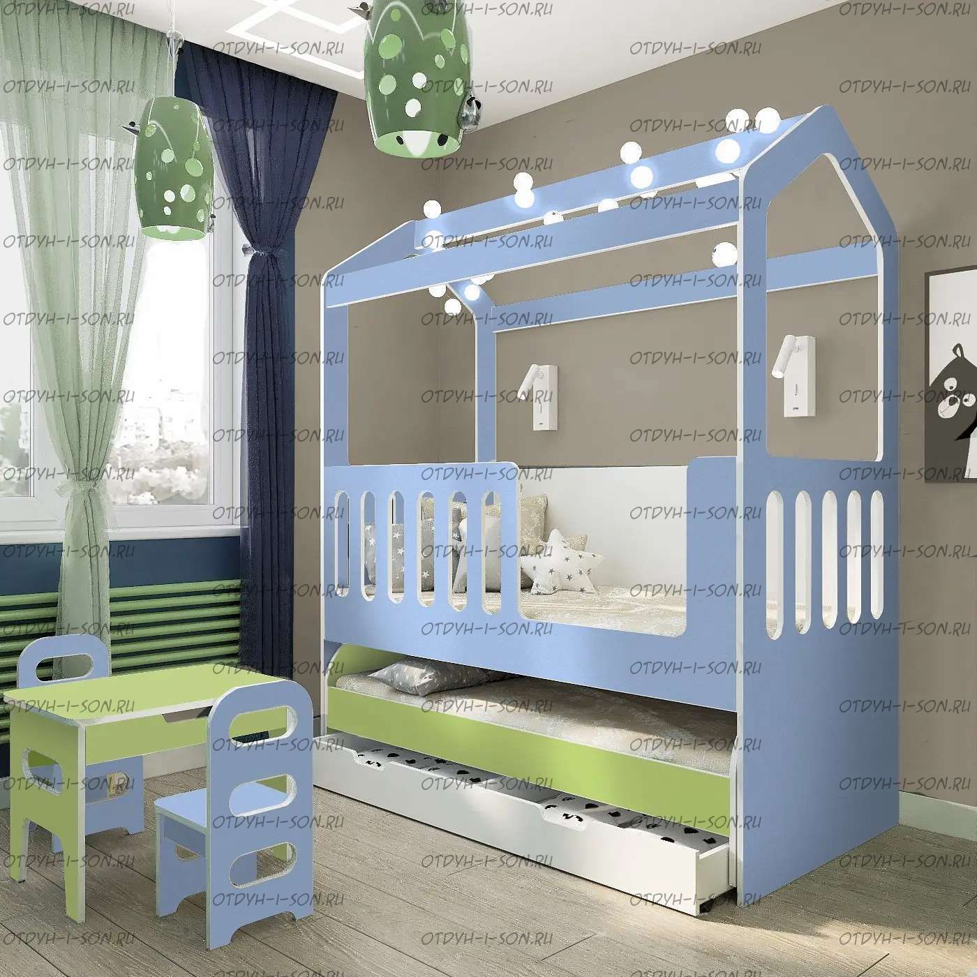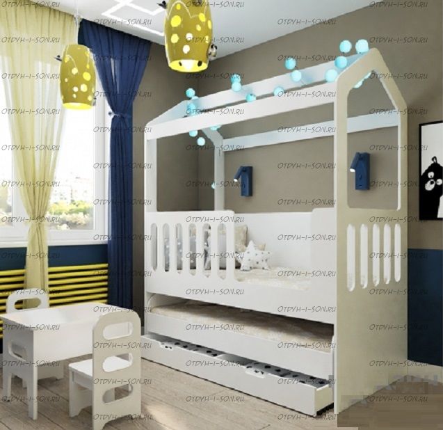 Кровать-домик двухъярусная выкатная Сказка ДС-35 Комплектация: Детская кровать Домик Сказка ДС-35.1/1 или ДС-35.1/2 (80х160 см.) Выкатная кровать Сказка ДС-35.2/1 или ДС-35.2/2 (80х155 см.) Ящики подкатные - в зависимости от комплектации Шторы докупаются отдельно Характеристики: Размер спального места: 80х155 и 80х160 см. Размеры Ширина 83,6 х Длина 163,2 х Высота 195 см. Спальное место у кровати располагается на высоте около 50 см. Ребенку не будет холодно от пола, при этом легко можно самостоятельно забраться в кроватку. Можно выбрать цвет фасада кровати: белый или цветной вариант из нашей палитры. Задняя спинка изготавливается только в белом цвете. Украсить крышу домика можно балдахином или гирляндой из хлопковых шариков. Также дополнительно можно приобрести бортики на вход в кровать от падения. Действует расширенная гарантия 2 года. Материалы: премиальная Материал: ЛДСП 16 мм (Австрия, Egger)толщина 16 мм, класс экологичности Е1. Толщина ЛДСП 16 мм. Используется мягкая кромка ПВХ (2 мм). Металлические крепления. Ящики на колесиках. Фурнитура: импортная фурнитура Вес: 140 кг. Объем: 0.4 м3. Цвет: более 15 цветов и оттенков Домик сказка выполнен из высококачественного и надежного ЛДСП. В комплектацию входит высокий борт, что позволяет разместить детей от 1,5 лет и старше. Кровать домик можно использовать без переднего борта, для этого необходимо приобрести дополнительную царгу арт. ДС-11. На заднюю спинку кровати можно нанести рисунок. Выбрать рисунок можно из предложенной палитры. Базовая комплектация — это только корпус кровати. Ящик, шторы и балдахин — приобретается дополнительно.