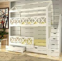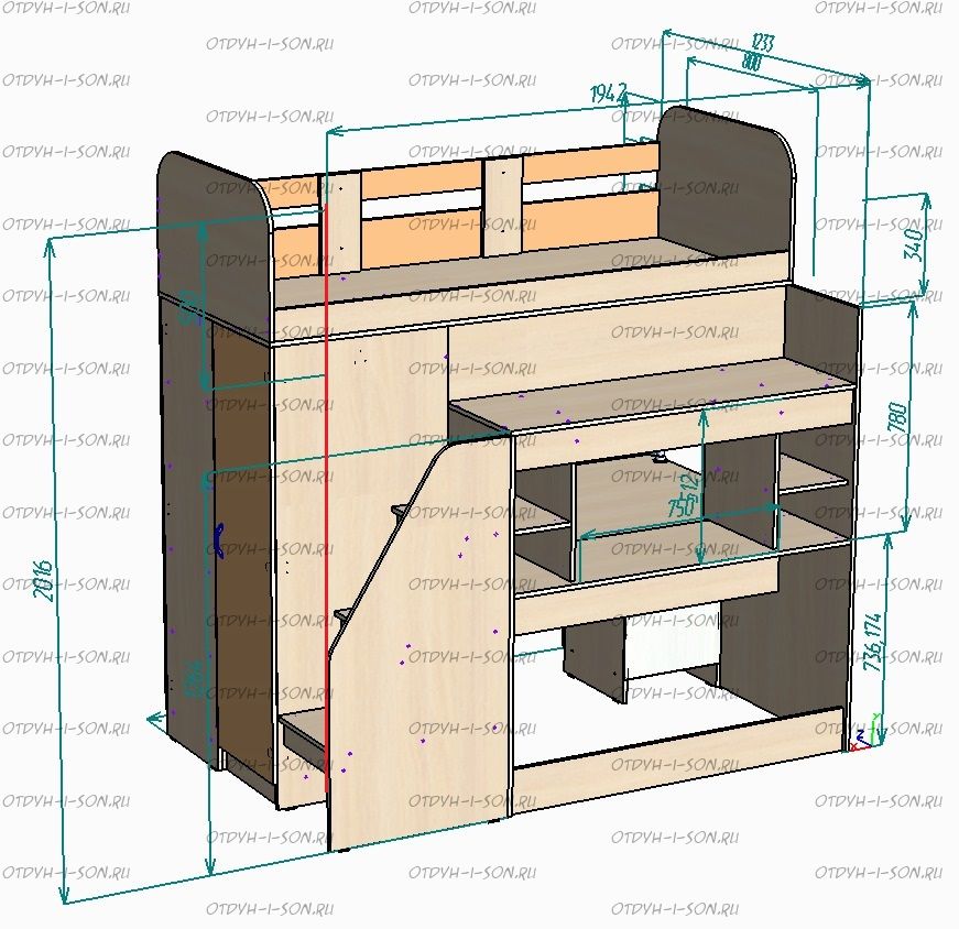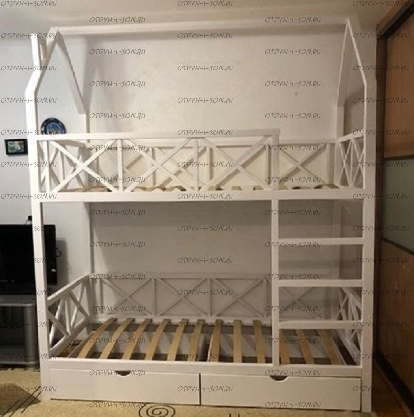Кровать двухъярусная Домик Standard №28 Внимание верхняя часть кровати домика Блум может быть разной высоты. в связи с различными высотами потолков в квартирах и домах, уточняйте высоту при заказе. Комплектация: Двухъярусная кровать Лестница, которая выполняется с любой стороны кровати по Вашему запросу. Расположение лестницы кровати не универсально и указывается обязательно оператору. Основание у кровати: поперечные брусья (также дополнительно можно добавить лист оргалита). Подкроватные ящики на колесиках. Матрасы в комплектацию не входят. Размеры лестницы Стандартная глубина лестницы к данной кровати: 90 см. При ширине спального места 70 см.: Возможно изготовление лестницы глубиной 80 см. Если это необходимо, обязательно указывайте этот размер при заказе. При ширине спального места 80 см.: стандартная глубина лестницы 90 см. При ширине спального места 90 см.: стандартная глубина лестницы 90 см. При ширине спального места 120 см.: стандартная глубина лестницы 90 см. Характеристики: Размер спального места: любые. Общая высота: 220 cм. Высота самой царги: 14 см. Высота до царги от пола: 125 см. Высота, на которой начинается уклон крыши домика: 175 см. Уклон крыши: 45 градусов Габаритные Размеры: +10 см к ширине, +50 см к длине. (спального места) Характеристика выкатных ящиков: Комплект состоит из 2х ящиков; Мебельная фанера/ Массив дерева; Ящики на роликах; Дно ящика 5мм ДВП; Ящик двигается по полу. К кровати не фиксируется, установка с любой стороны. Масса в упаковке: Объем в упаковке: Материал: массив сосны 2 подкроватных ящика с колесиками, ящики не закрепляются в кровати и могут выдвигаться с любой стороны кровати (ящики докупаются отдельно). В базовом варианте с тыльной стороны ящиков декоративной планки не предусмотрено Основание под матрас реечное Внимание: возможно увеличение высоты бортиков кровати! Цвет: орех, бук, венге, груша, дуб, каштан, клен, красное дерево, махагон, ольха, сосна, белый (эмаль), слоновая кость (эмаль)