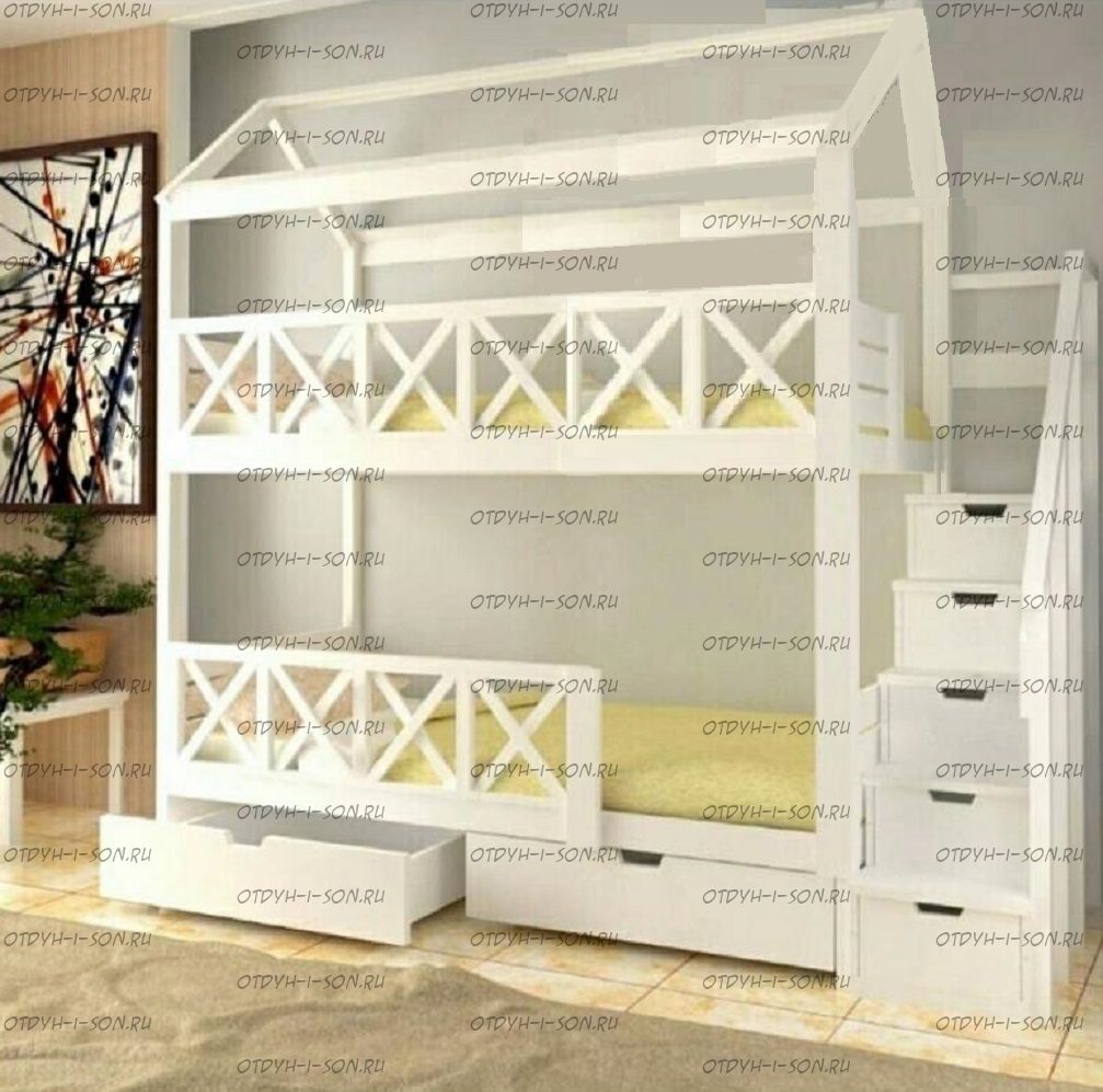 Кровать двухъярусная Домик Standard №8 (Домик Блум) с лестницей комодом.