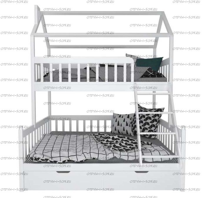 Кровать двухъярусная Домик Standard №8А с лестницей комодом. Внимание верхняя часть кровати-домика может быть разной высоты. в связи с различными высотами потолков в квартирах и домах, уточняйте высоту при заказе. Комплектация: Двухъярусная кровать Лестница выполняется с любой стороны кровати по Вашему запросу. Расположение лестницы кровати не универсально и указывается обязательно оператору. Основание у кровати: поперечные брусья (также дополнительно можно добавить лист оргалита). Подкроватные ящики на колесиках - в зависимости от комплектации Матрасы в комплектацию не входят. Размеры лестницы Стандартная глубина лестницы к данной кровати: 90 см. При ширине спального места 70 см.: Возможно изготовление лестницы глубиной 80 см. Если это необходимо, обязательно указывайте этот размер при заказе. При ширине спального места 80 см.: стандартная глубина лестницы 90 см. При ширине спального места 90 см.: стандартная глубина лестницы 90 см. При ширине спального места 120 см.: стандартная глубина лестницы 90 см. Характеристики: Размер спального места: любые. Общая высота: 230 cм. Высота самой царги: 13-14 см. Высота до царги от пола: 130 см. Габаритные Размеры: +10 см к ширине, +50 см к длине. (спального места) Характеристика выкатных ящиков: Комплект состоит из 2х ящиков; Мебельная фанера / Массив дерева; Ящики на роликах; Дно ящика 5мм ДВП; Ящик двигается по полу. К кровати не фиксируется, установка с любой стороны. ( докупаются отдельно) Материал: массив сосны В базовом варианте с тыльной стороны ящиков декоративной планки не предусмотрено Основание под матрас реечное Внимание: возможно увеличение высоты бортиков кровати! Продукция фабрики не подлежит возврату в случае: механических повреждений; потери товарного вида; если изделие нестандартного цвета или размера; Возможно изготовление кровати нестандартных размеров по вашим замерам, доплата за нестандартный размер: Производство Владимирской мебельной фабрики, кровать доставляется напрямую от производителя, самовывоз ограничен.