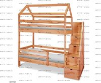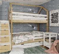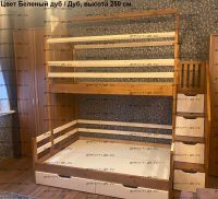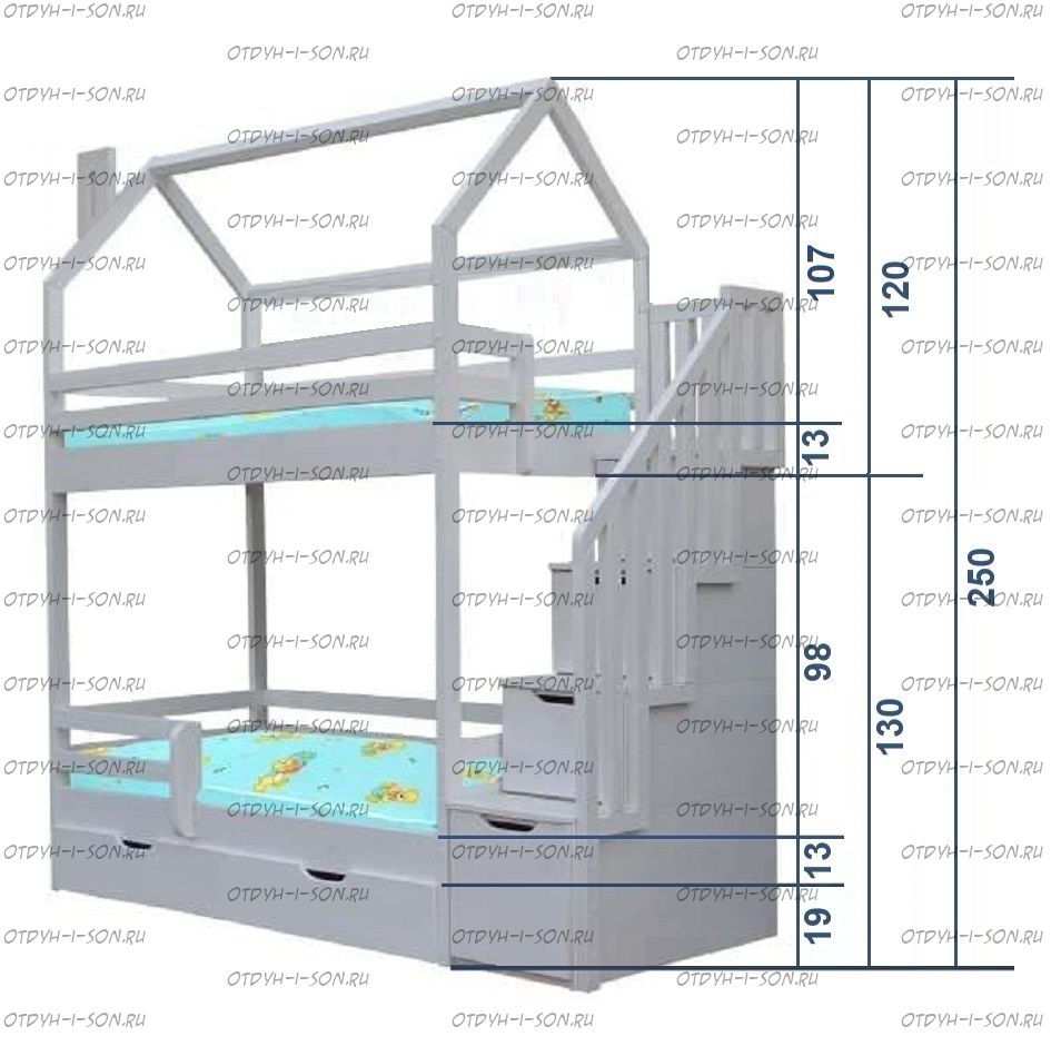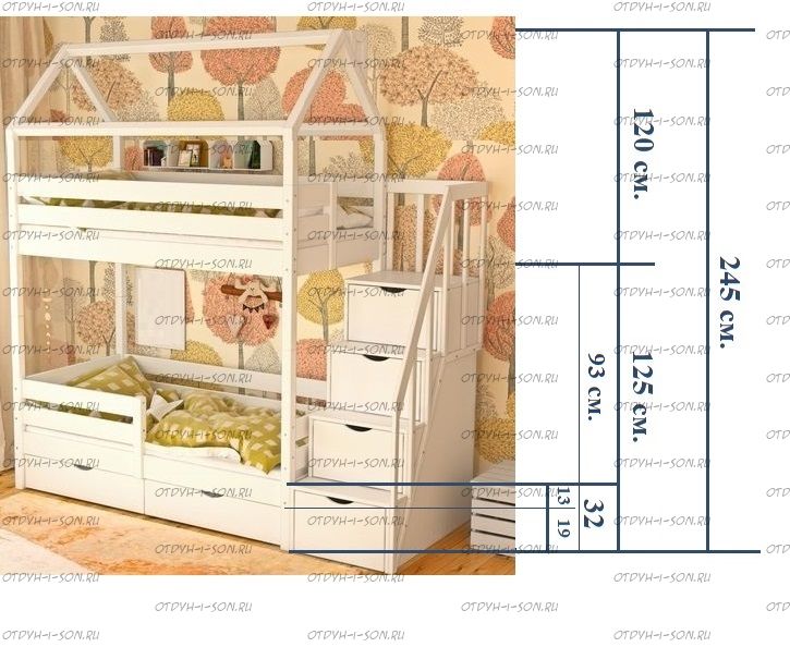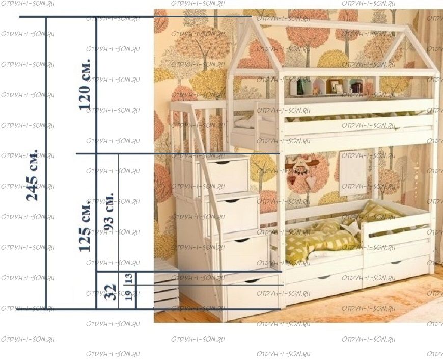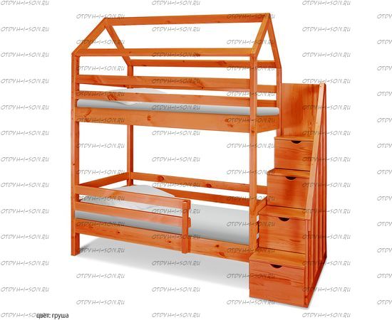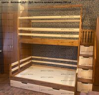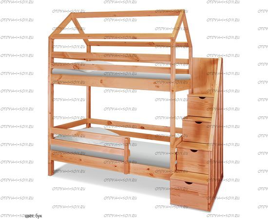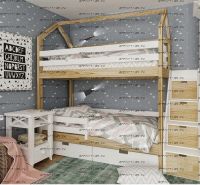 Кровать двухъярусная Домик Standard №8 (Домик Блум) Внимание верхняя часть кровати домика Блум может быть разной высоты. в связи с различными высотами потолков в квартирах и домах, уточняйте высоту при заказе. Комплектация: Двухъярусная кровать Лестница, которая выполняется с любой стороны кровати по Вашему запросу. Расположение лестницы кровати не универсально и указывается обязательно оператору. Основание у кровати: поперечные брусья (также дополнительно можно добавить лист оргалита). Подкроватные ящики на колесиках. Матрасы в комплектацию не входят. Размеры лестницы Стандартная глубина лестницы к данной кровати: 90 см. При ширине спального места 70 см.: Возможно изготовление лестницы глубиной 80 см. Если это необходимо, обязательно указывайте этот размер при заказе. При ширине спального места 80 см.: стандартная глубина лестницы 90 см. При ширине спального места 90 см.: стандартная глубина лестницы 90 см. При ширине спального места 120 см.: стандартная глубина лестницы 90 см. Характеристики: Размер спального места: любые. Общая высота: 220 cм. Высота самой царги: 14 см. Высота до царги от пола: 125 см. Высота, на которой начинается уклон крыши домика: 175 см. Уклон крыши: 45 градусов Габаритные Размеры: +10 см к ширине, +50 см к длине. (спального места) Характеристика выкатных ящиков: Комплект состоит из 2х ящиков; Мебельная фанера/ Массив дерева; Ящики на роликах; Дно ящика 5мм ДВП; Ящик двигается по полу. К кровати не фиксируется, установка с любой стороны. Масса в упаковке: Объем в упаковке: Материал: массив сосны 2 подкроватных ящика с колесиками, ящики не закрепляются в кровати и могут выдвигаться с любой стороны кровати (ящики докупаются отдельно). В базовом варианте с тыльной стороны ящиков декоративной планки не предусмотрено Основание под матрас реечное Внимание: возможно увеличение высоты бортиков кровати! Цвет: орех, бук, венге, груша, дуб, каштан, клен, красное дерево, махагон, ольха, сосна, белый (эмаль), слоновая кость (эмаль)