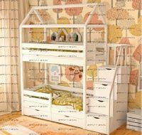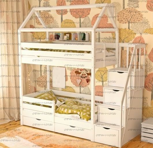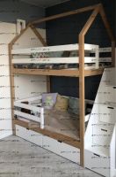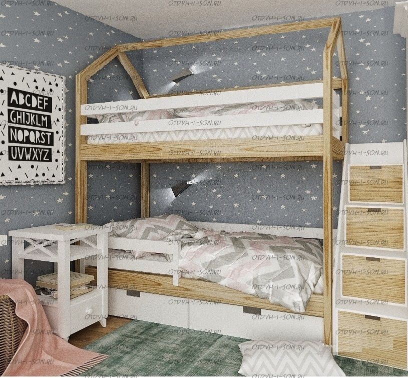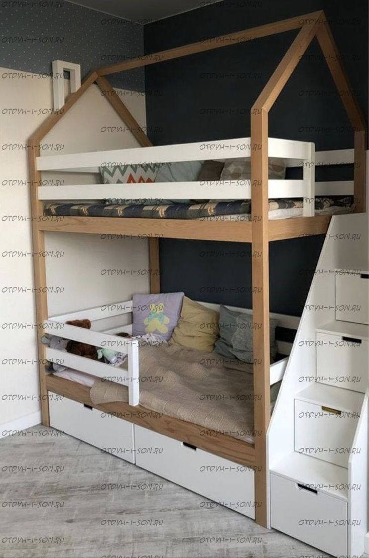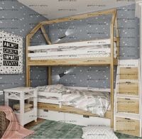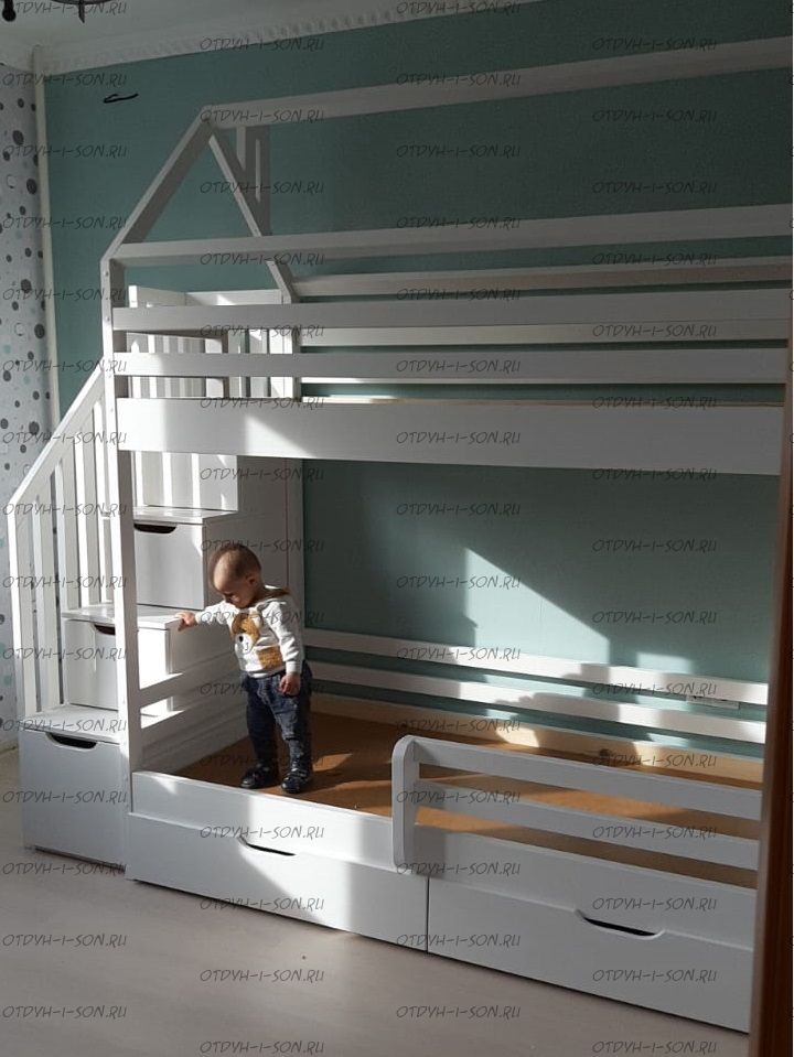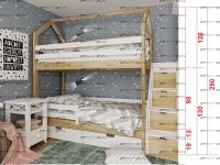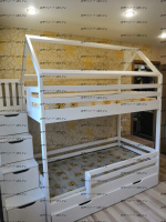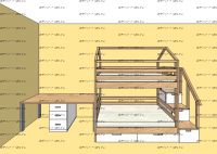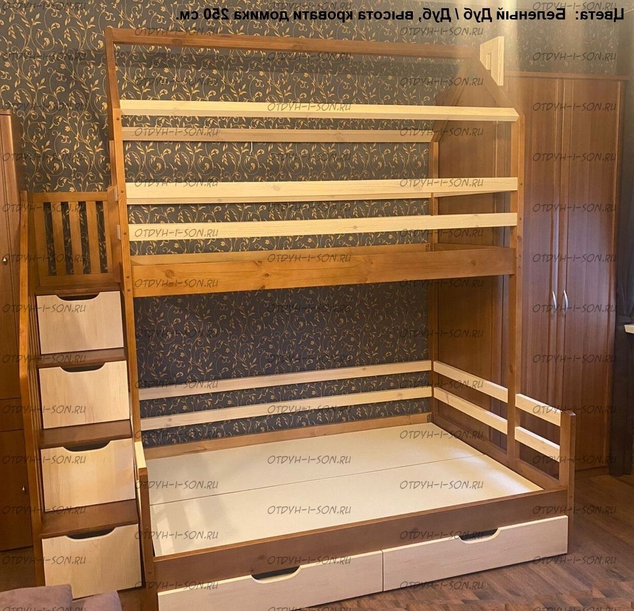 Кровать двухъярусная Домик Standard №8 (Домик Блум) Внимание верхняя часть кровати домика Блум может быть разной высоты. в связи с различными высотами потолков в квартирах и домах, уточняйте высоту при заказе. Комплектация: Двухъярусная кровать Лестница, которая выполняется с любой стороны кровати по Вашему запросу. Расположение лестницы кровати не универсально и указывается обязательно оператору. Основание у кровати: поперечные брусья (также дополнительно можно добавить лист оргалита). Подкроватные ящики на колесиках. Матрасы в комплектацию не входят. Размеры лестницы Стандартная глубина лестницы к данной кровати: 90 см. При ширине спального места 70 см.: Возможно изготовление лестницы глубиной 80 см. Если это необходимо, обязательно указывайте этот размер при заказе. При ширине спального места 80 см.: стандартная глубина лестницы 90 см. При ширине спального места 90 см.: стандартная глубина лестницы 90 см. При ширине спального места 120 см.: стандартная глубина лестницы 90 см. Характеристики: Размер спального места: любые. Общая высота: 220 cм. Высота самой царги: 14 см. Высота до царги от пола: 125 см. Высота, на которой начинается уклон крыши домика: 175 см. Уклон крыши: 45 градусов Габаритные Размеры: +10 см к ширине, +50 см к длине. (спального места) Характеристика выкатных ящиков: Комплект состоит из 2х ящиков; Мебельная фанера/ Массив дерева; Ящики на роликах; Дно ящика 5мм ДВП; Ящик двигается по полу. К кровати не фиксируется, установка с любой стороны. Масса в упаковке: Объем в упаковке: Материал: массив сосны 2 подкроватных ящика с колесиками, ящики не закрепляются в кровати и могут выдвигаться с любой стороны кровати (ящики докупаются отдельно). В базовом варианте с тыльной стороны ящиков декоративной планки не предусмотрено Основание под матрас реечное Внимание: возможно увеличение высоты бортиков кровати! Цвет: орех, бук, венге, груша, дуб, каштан, клен, красное дерево, махагон, ольха, сосна, белый (эмаль), слоновая кость (эмаль)