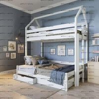Кровать-домик двухъярусная Твинкл (ВМК Шале) любые размеры Характеристики: Размер спального места: 80х160 + 80х160 см. или любые другие размеры по Вашему запросу. Общая высота: 2350 мм. Высота царги: 140 мм. Габаритные Размеры: +10 см к ширине, +10 см к длине. (спального места) Характеристика выкатных ящиков: Комплект состоит из 2х ящиков; Мебельная фанера/ Массив дерева; Ящики на роликах; Дно ящика 5мм ДВП; Ящик двигается по полу. К кровати не фиксируется, установка с любой стороны. Масса в упаковке: Объем в упаковке: Крепления кроватей фабрики ВМК Шале: мебельные стяжки, евроболты, заглушки Материал: массив сосны 2 подкроватных ящика с колесиками, ящики не закрепляются в кровати и могут выдвигаться с любой стороны кровати (ящики докупаются отдельно). В базовом варианте с тыльной стороны ящиков декоративной планки не предусмотрено Основание под матрас реечное Внимание: для любой модели кровати ВМК Шале возможно увеличение высоты бортиков кровати! Цвет: орех, бук, венге, груша, дуб, каштан, клен, красное дерево, махагон, ольха, сосна, белый (эмаль), слоновая кость (эмаль)