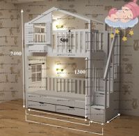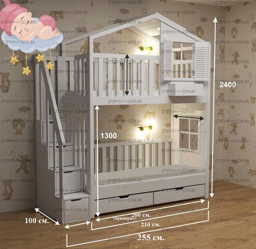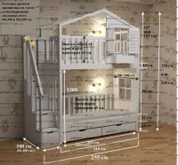 Кровать двухъярусная, Кровать-домик Roof №22 может быть изготовлена с кроватью для новорожденного внизу или как трехъярусная кровать, а также в любых размерах и цветах. Характеристики: любые размеры, цвета любые материалы: массив сосны, березы или бука