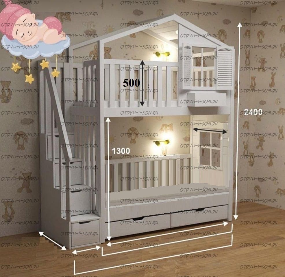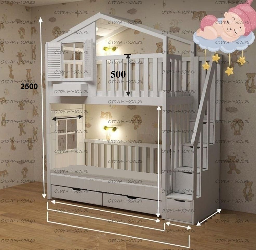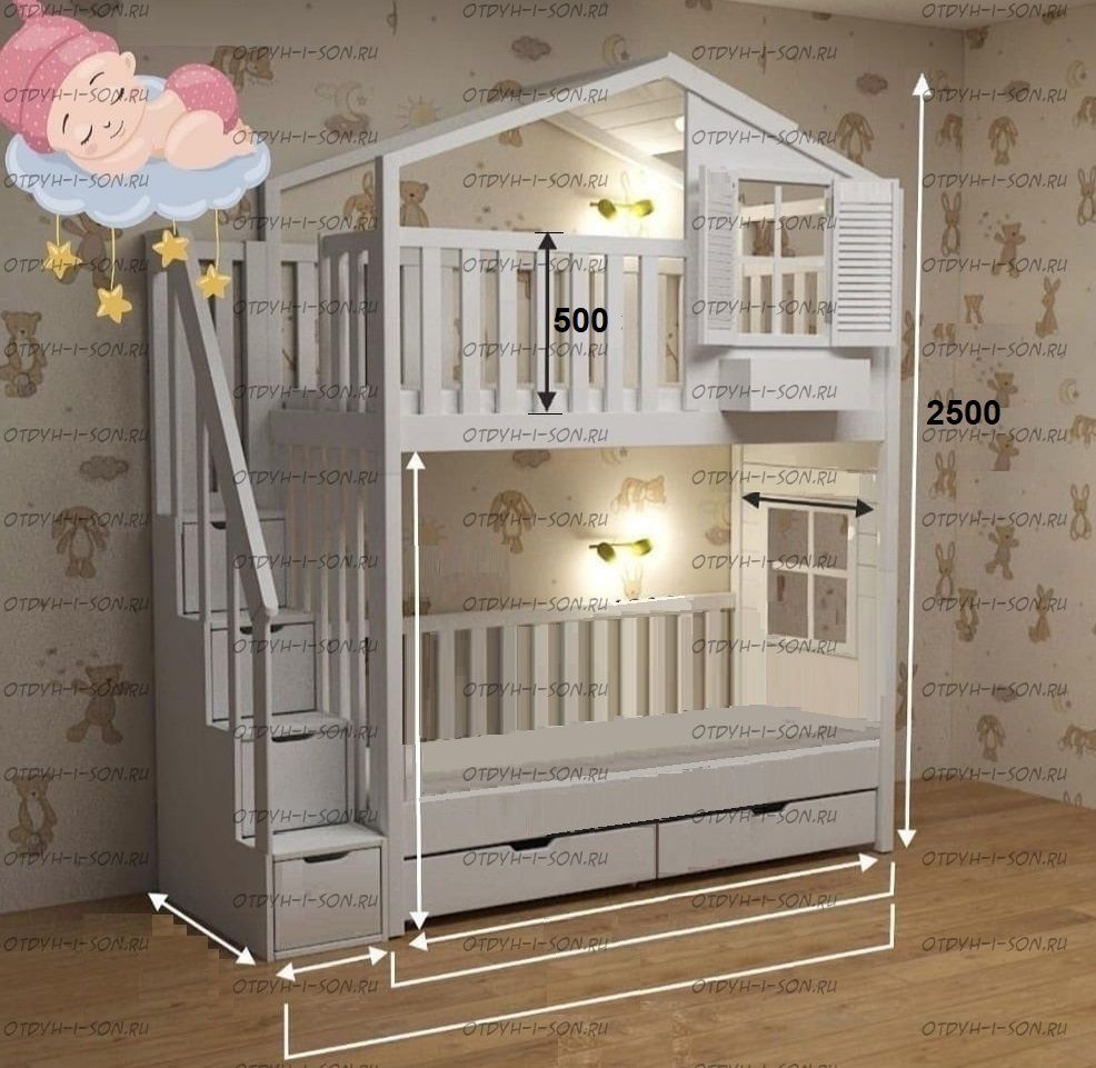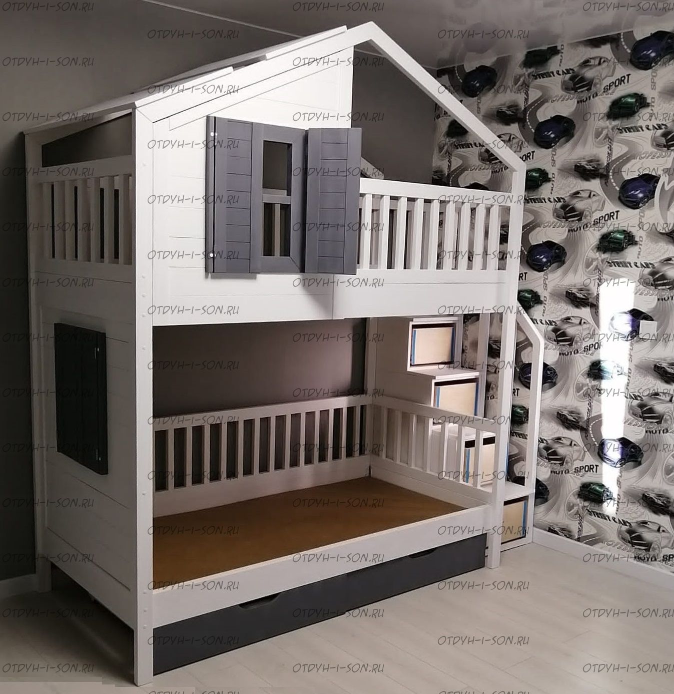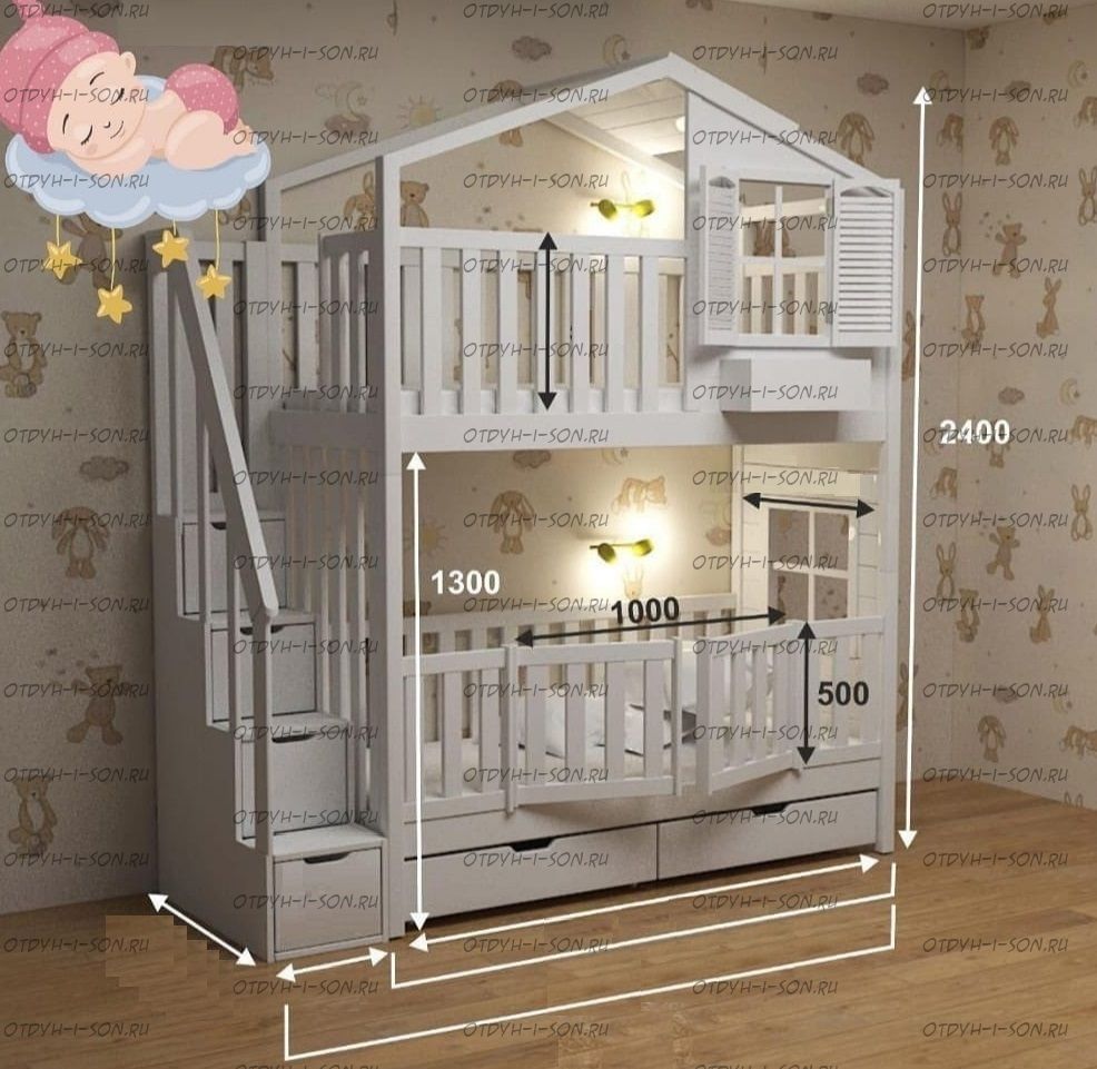 Кровать двухъярусная, Кровать-домик Roof №22 может быть изготовлена с кроватью для новорожденного внизу или как трехъярусная кровать, а также в любых размерах и цветах.