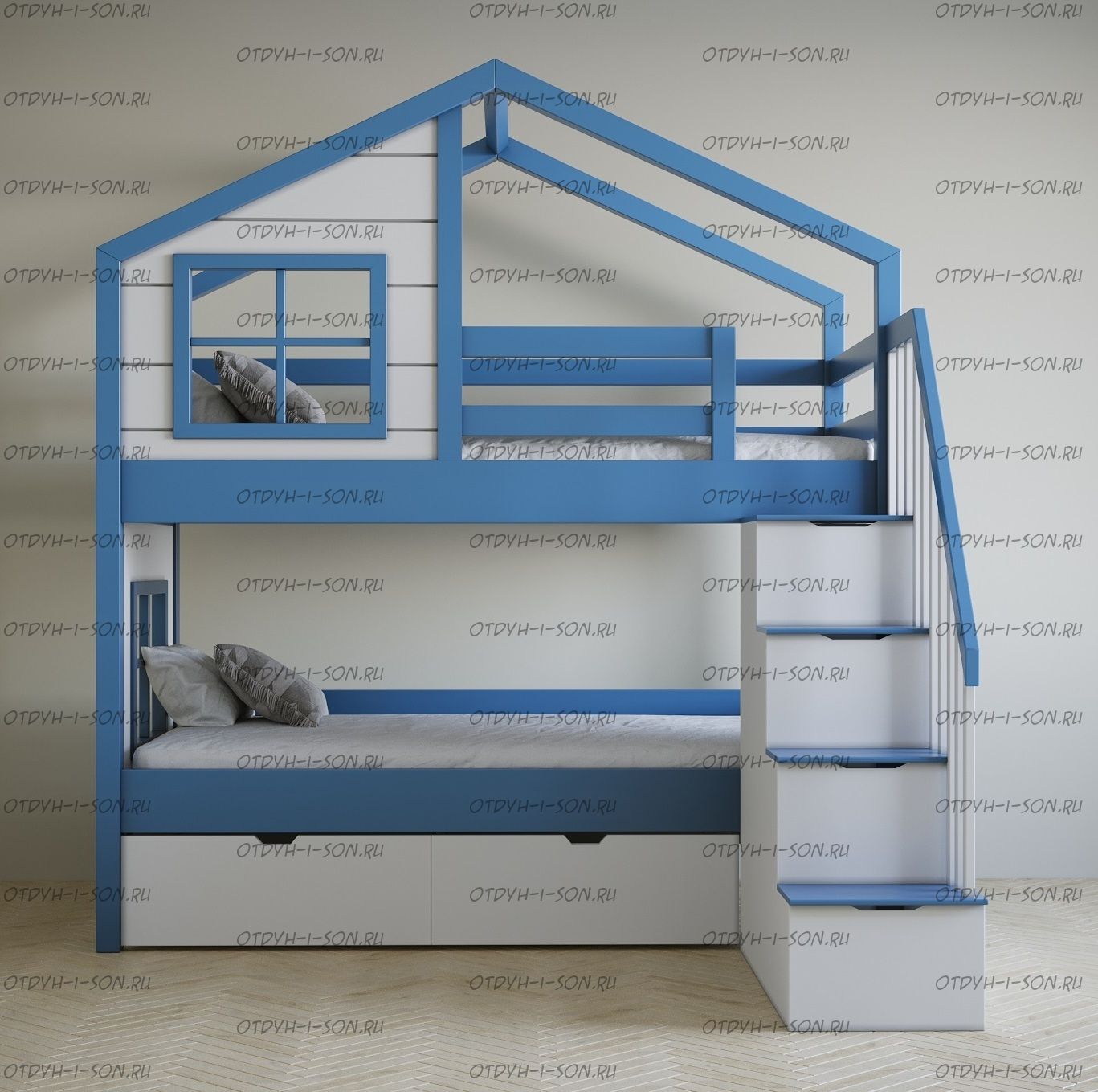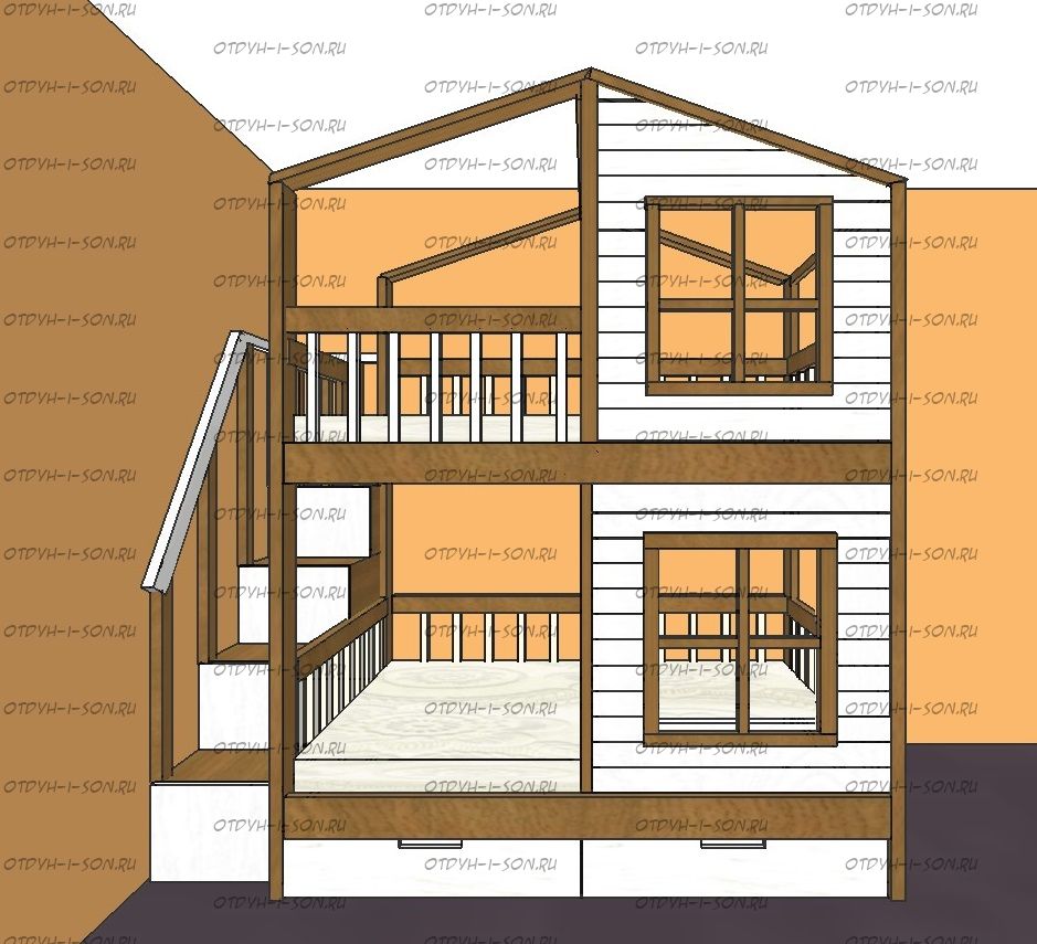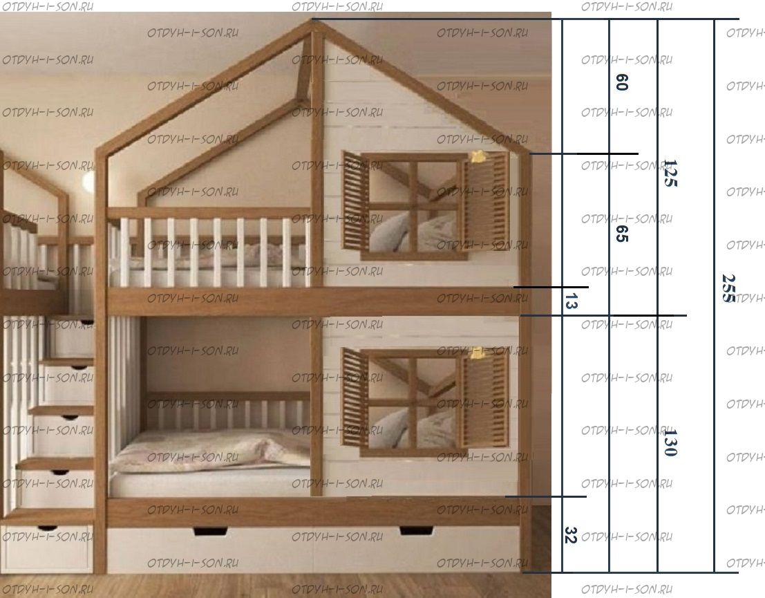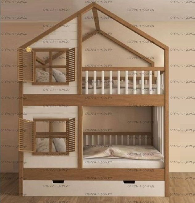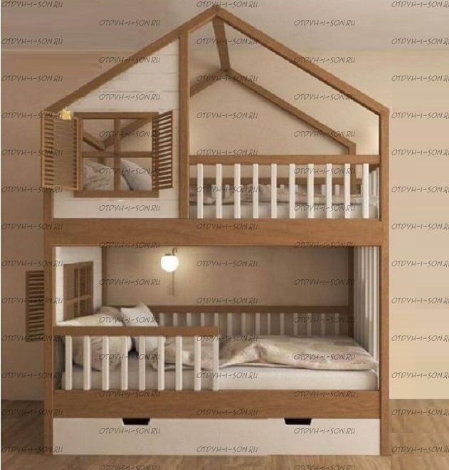 Кровать двухъярусная, Кровать-домик Roof №5А может быть изготовлена с кроватью для новорожденного внизу или как трехъярусная кровать, а также в любых размерах и цветах.