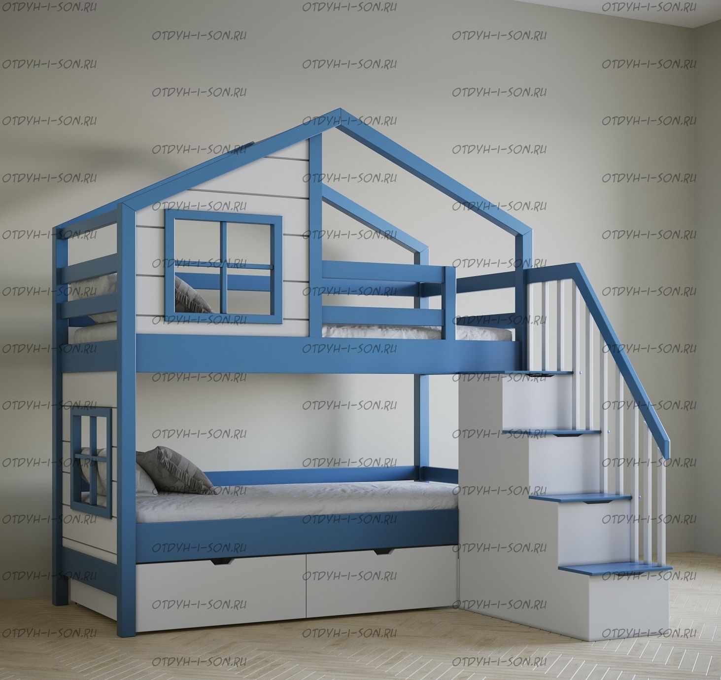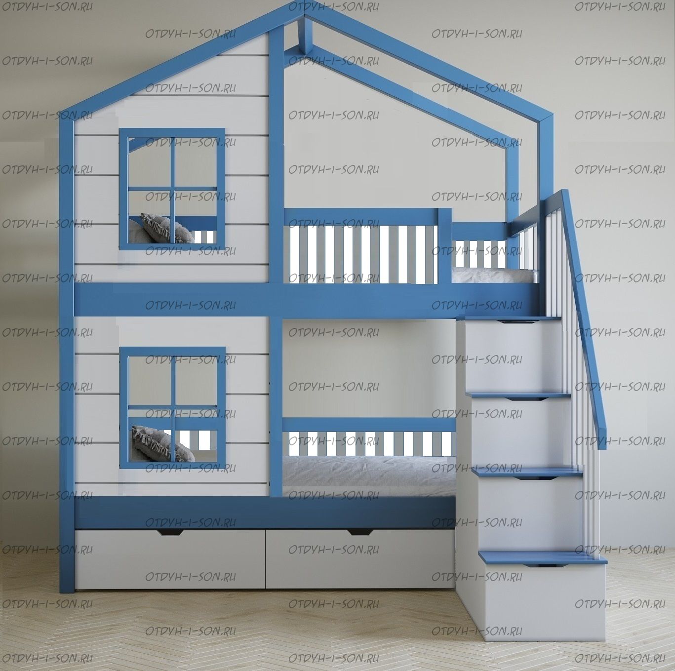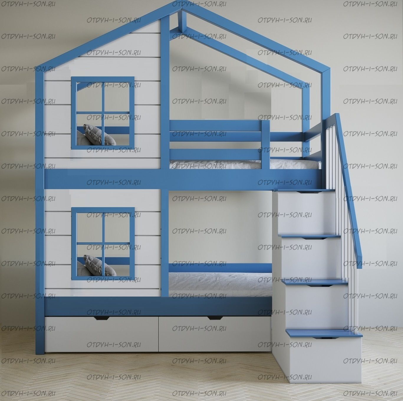 Кровать двухъярусная, Кровать-домик Roof №5А может быть изготовлена с кроватью для новорожденного внизу или как трехъярусная кровать, а также в любых размерах и цветах.