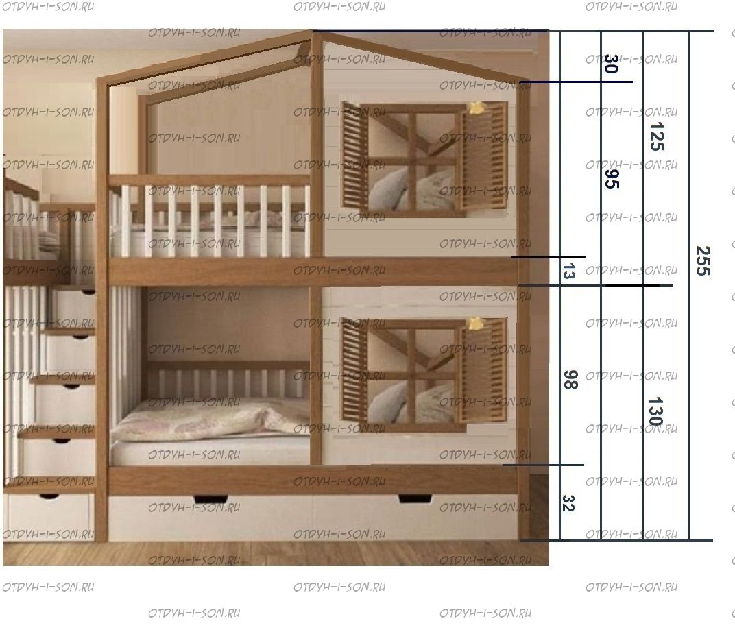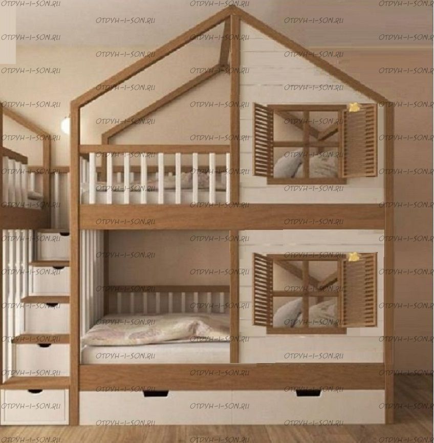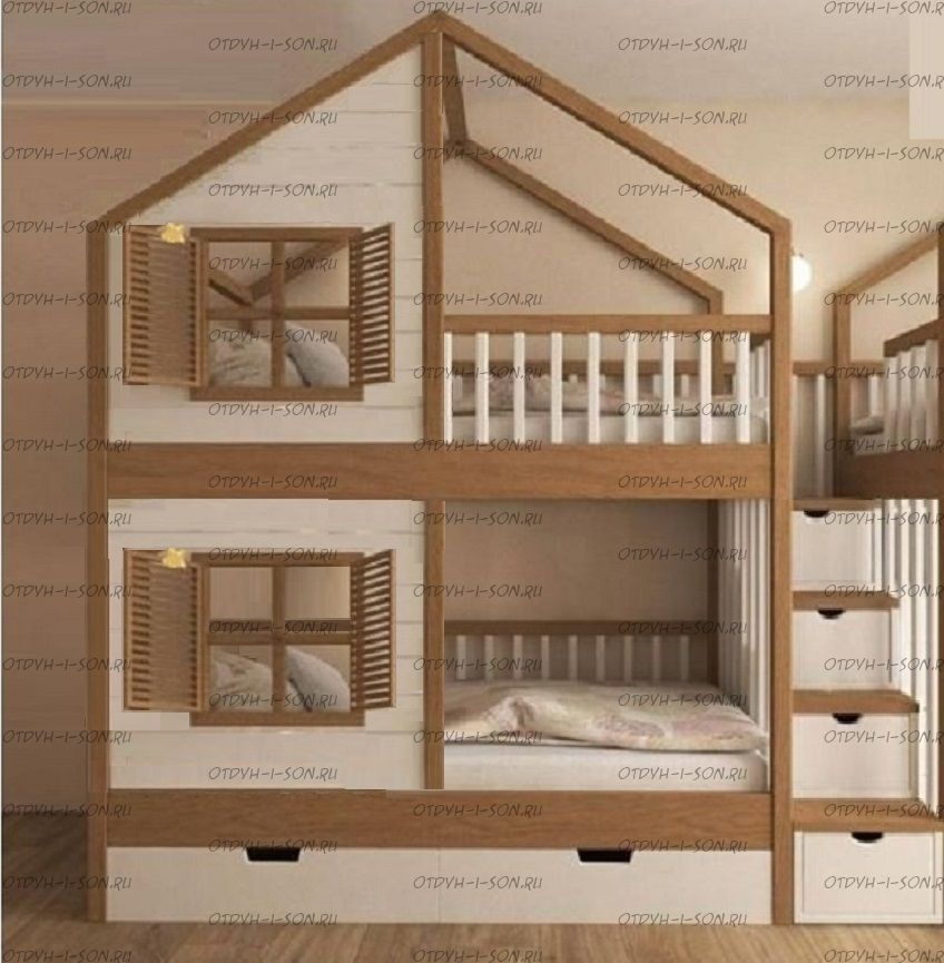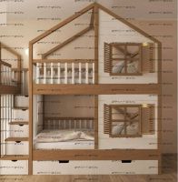 Кровать двухъярусная, Кровать-домик Roof №5А может быть изготовлена с кроватью для новорожденного внизу или как трехъярусная кровать, а также в любых размерах и цветах. Характеристики: любые размеры, цвета любые материалы: массив сосны, березы или бука