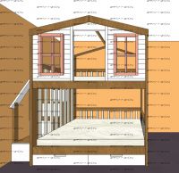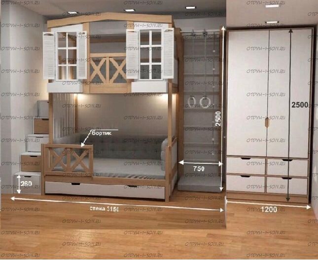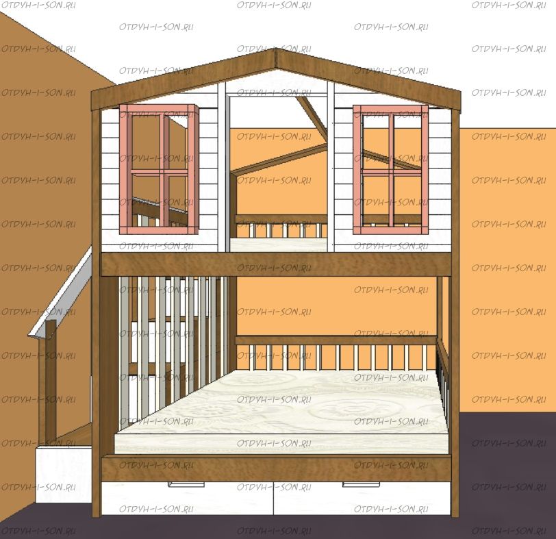 Кровать двухъярусная, Кровать-домик Roof №29 может быть изготовлена с кроватью для новорожденного внизу или как трехъярусная кровать, а также в любых размерах и цветах. Характеристики: