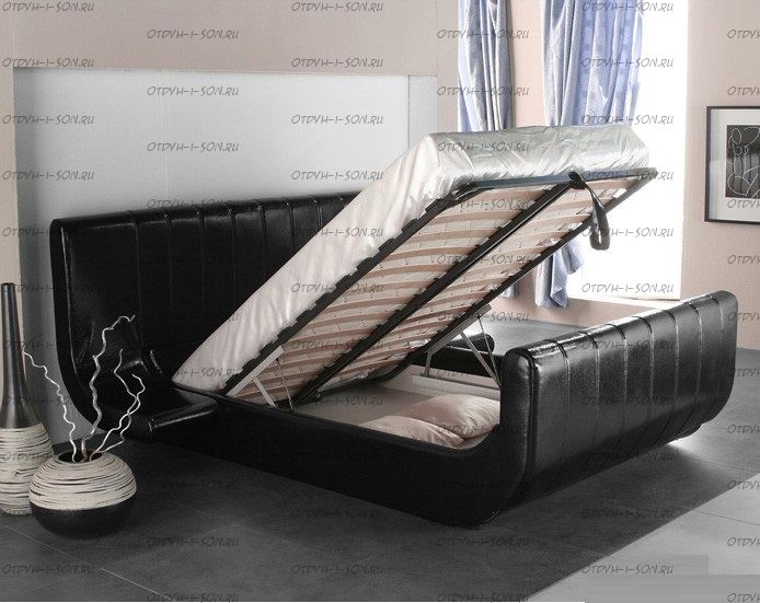 В мягкой интерьерной кровати «Азалия» установлена металлическая рама «Конго-лифт» с ортопедическими латами и механизмом пневмоподъема, что обеспечивает максимальное удобство и здоровый, комфортный сон.