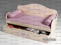 Кровать со спинкой Фанки Лилак, арт. 40021. Одноярусная низкая кровать Фанки Кидз Лилак, арт. 40012 производится в виде дивана и используется для сна и досуга. Удобная и функциональная модель для детей от 3-х лет. Имеет размер спального места 160х70 см и выкатной ящик для хранения белья и игрушек. Матрац приобретается дополнительно. Цвет кровати - дуб кремона. Декор - яркий принт в сиреневом цвете. Отдельно можно докупить бортик-ограничитель и текстиль (покрывало и подушки).