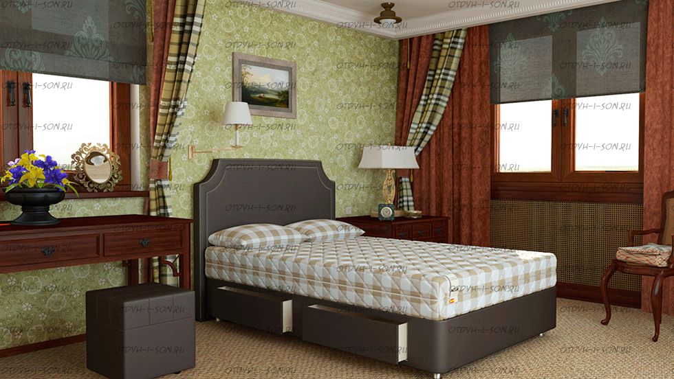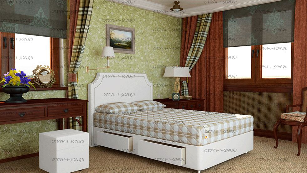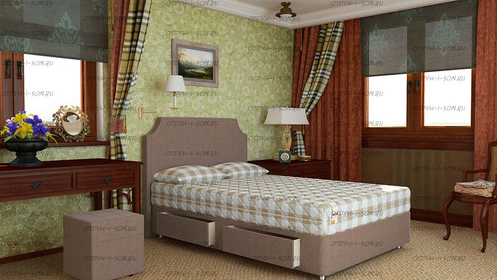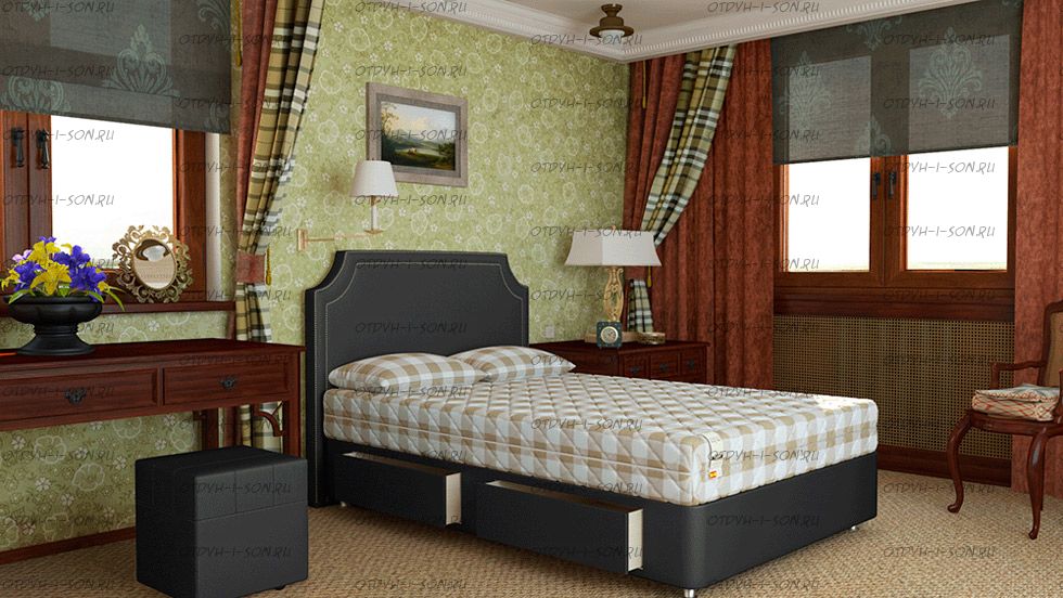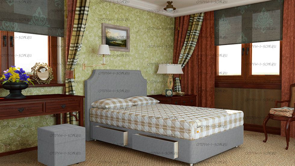 Кровать с матрасом Сет R Mr.Mattress Характеристики: Высота бокса : 30 см. Высота матраса : 19 см. Высота изголовья : 130 см. Декор : декоративные гвозди Рекомендуемый макс. вес : 120 кг Гарантия : 3 года Предоплата: нет Комплектация: 1: Кроватный бокс: Site Box (4 выдвижных ящика по бокам, в исполнении эко). На выбор: металлические ножки 5, 10, 15 см. 1 категория тканей из 8 цветов. 2: Арома-матрас: Richard 3: Подушки: Bremen S - 2 шт. 4: Пуф: Lancer, 45х45х47 см. 5: Интерьерное изголовье: Fashion M, h-130 см.