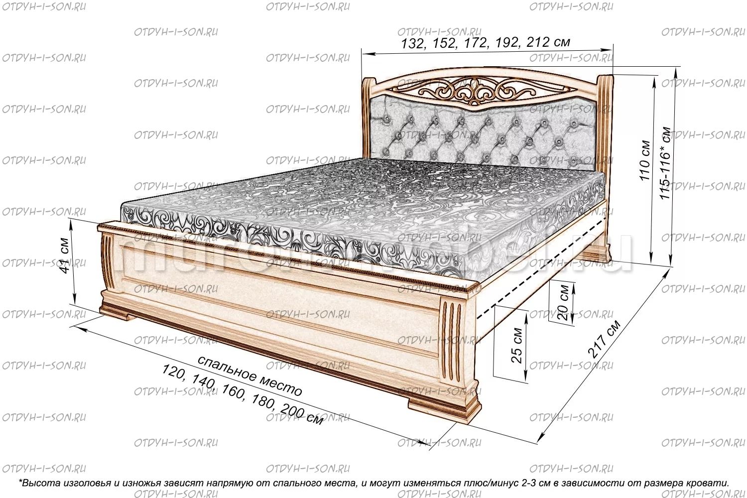 Кровать-тахта Сицилия с каретной вставкой Характеристики: Размер спального места: 80х190/195/200, 90х190/195/200, 120х190/195/200, 140х190/195/200, 160х190/195/200, 180х190/195/200, 200х190/195/200 см. Комбинированная кровать: Массив дерева и вставки из экологически чистой мебельной фанеры Габариты кроватей: Высота днища кроватей: Высота от пола до спального места: 25 см. Высота от пола до царги: 20 см. Ширина царги - 16 см., из них 10 см. составляет бортик, который держит матрас, остальные 6 см. под спальным местом, закрывают собой фурнитуру Основание кровати: подматрасники, ламельное основание - за дополнительную плату Ламельное основание: да, в комплекте Подкроватные ящики: за дополнительную плату Ящики изготавливаются на колесиках и не прикрепляются к кровати, поэтому могут устанавливаться "лицом" к любой из боковых сторон кровати. Высота спинки в изголовье кровати: 115/116 см, изножье 41 см Крепления кровати: В базовом варианте с тыльной стороны ящиков декоративной планки не предусмотрено. Вес: 45-60кг. Любые размеры, в том числе и нестандартные