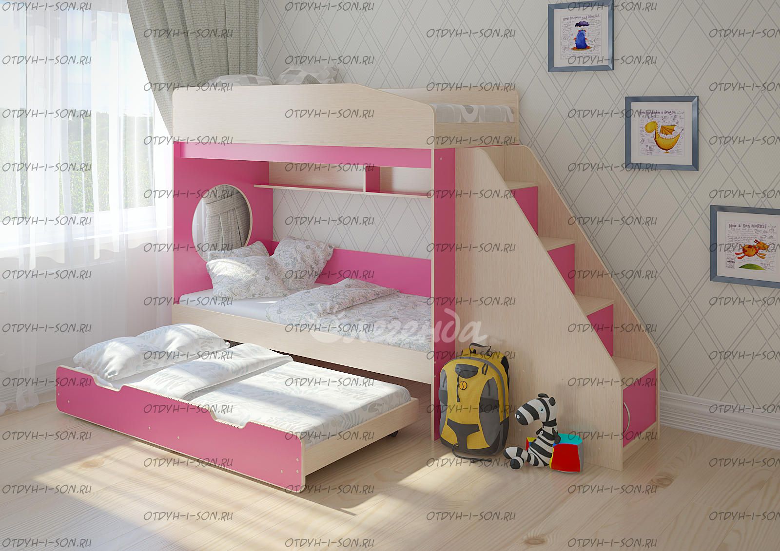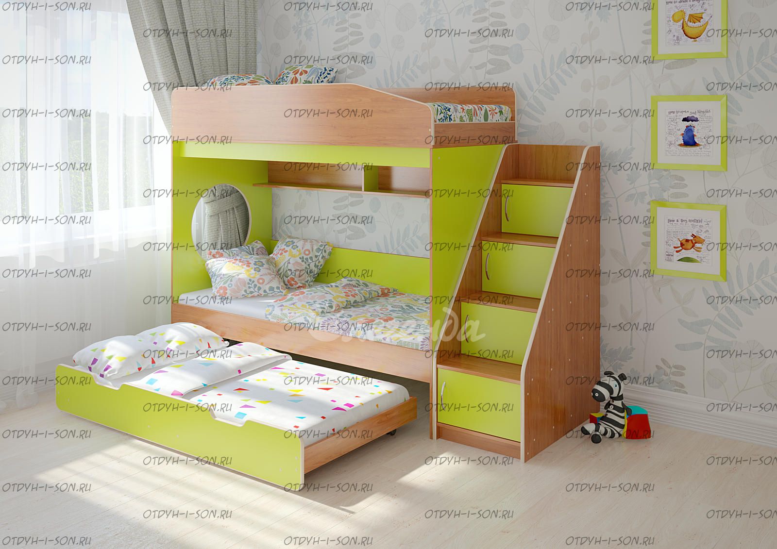 Кровать трехъярусная Легенда-10.5 Комплектация: Кровать двухъярусная Л-10 (ШхГхВ): 1844×846×1675 мм. Подкатное спальное место Легенда Л-03 (ШхГхВ): 1671×837×244 мм. Лестница угловая ЛУ-10 (ШхГхВ): 484 × 795 × 1356 мм; Фасады ЛУ-10 (ШхГхВ): 444 × 252 × 16 мм; Матрас докупается отдельно Характеристики: Размер спального места: 80Х180 и 80Х180 и 80х160 см. Внешние габариты (ДхШхВ): Корпус: ЛДСП, 16мм. Нестандарт: нет Вес: 139,9 кг. Объем: 0,36 м3 Кол-во упаковок: 8 мест Цвет корпуса: ольха, венге светлый Цвет фасада: венге светлый, ольха, венге темный, голубой, оранжевый, розовый, лайм Предоплата: нет