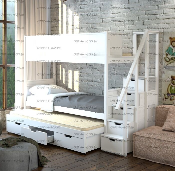 Кровать трехъярусная Factory №7H может быть изготовлена как двухъярусная кровать. Характеристики: Размер спального места верхнего яруса: 70х180, 80х180 см, 80х190 см, 90х190 см., 90х200 см. (и любые другие на Ваш вкус) Размер спального места нижнего яруса: 80х190, 80х200, 90х190, 90х200, 120х190, 120х200, 130х200, 140х190 см. (и любые другие на Ваш вкус) Внешние размеры: Материал: сосна Возможны любые нестандартные размеры Вес кровати: Объем кровати: Цвет: Возможность трансформации в отдельно стоящие кровать чердак и двуспальную кровать; - без матрасов; опорный брус спинок(ножки) - 40х80мм. Внимание: для любой модели кровати возможно увеличение высоты бортиков кровати! Возможно изготовление кровати нестандартных размеров по вашим замерам, доплата за нестандартный размер: - за кровать + 10% от стоимости изделия; Производство Владимирской мебельной фабрики, кровать доставляется напрямую от производителя, самовывоз ограничен.
