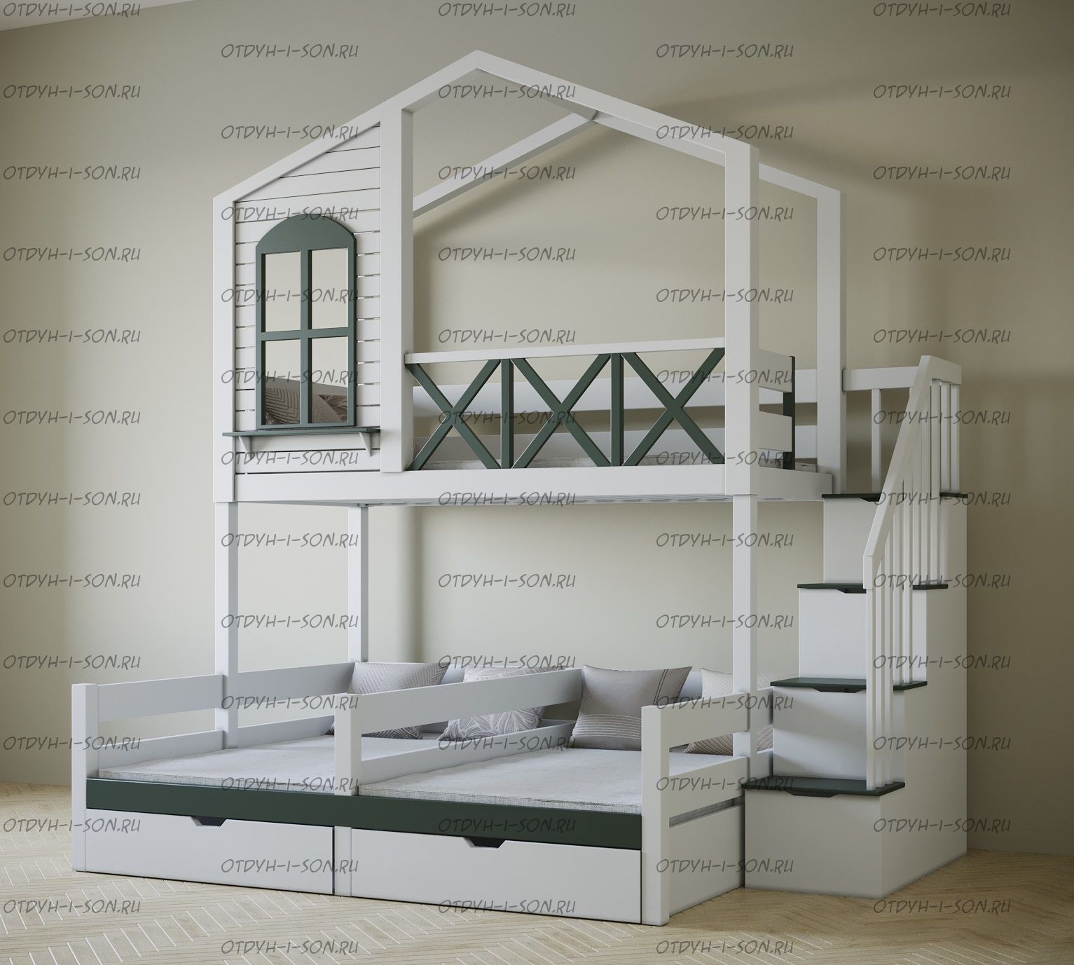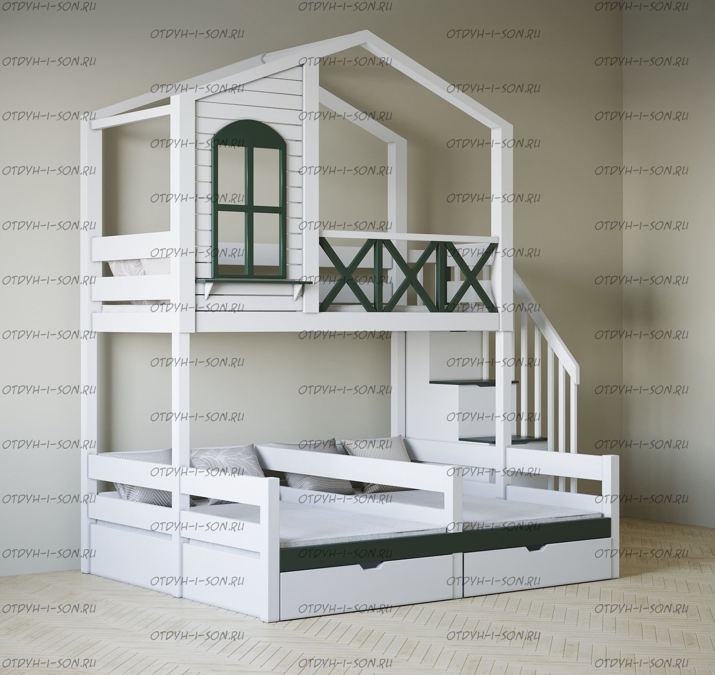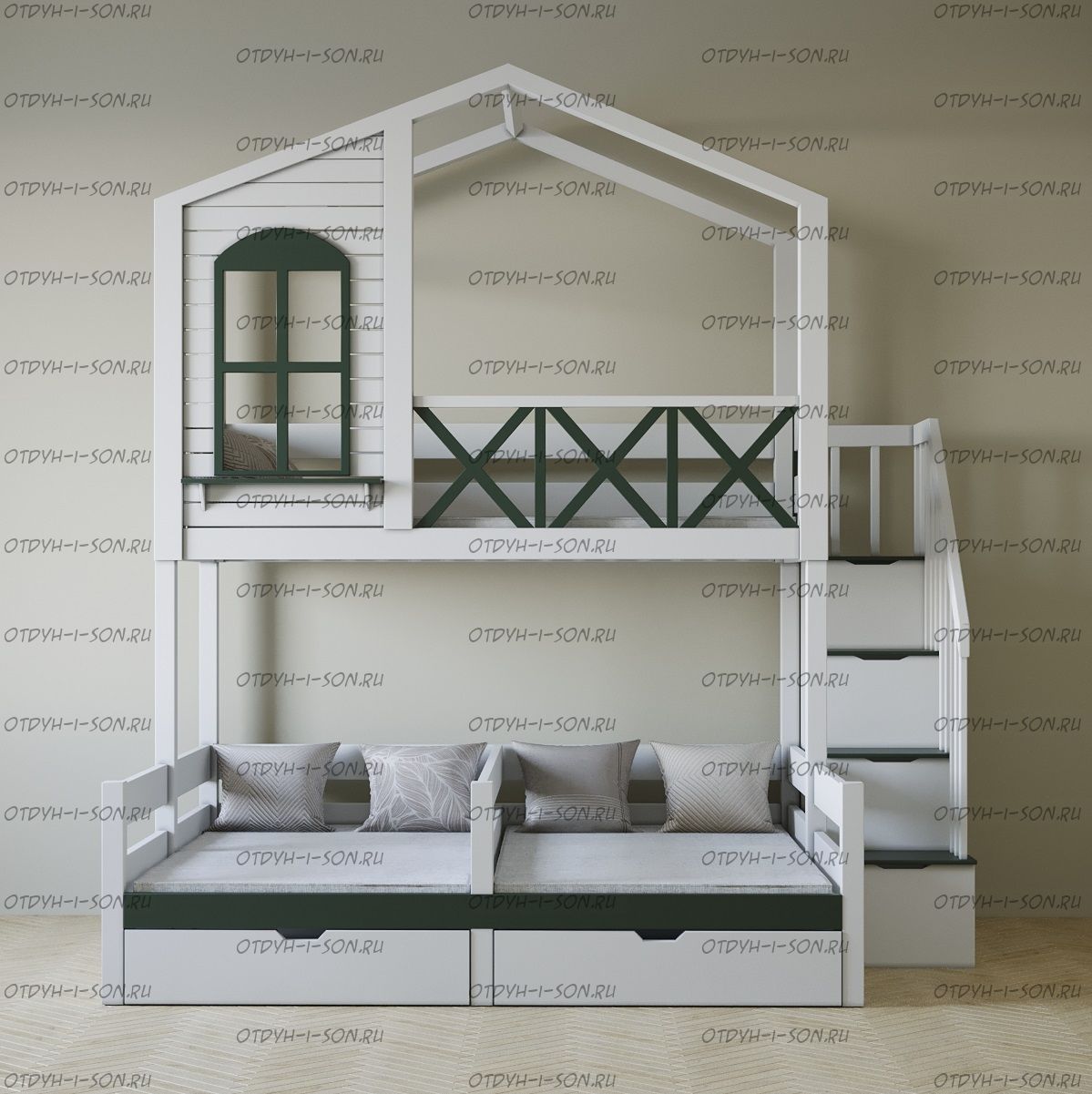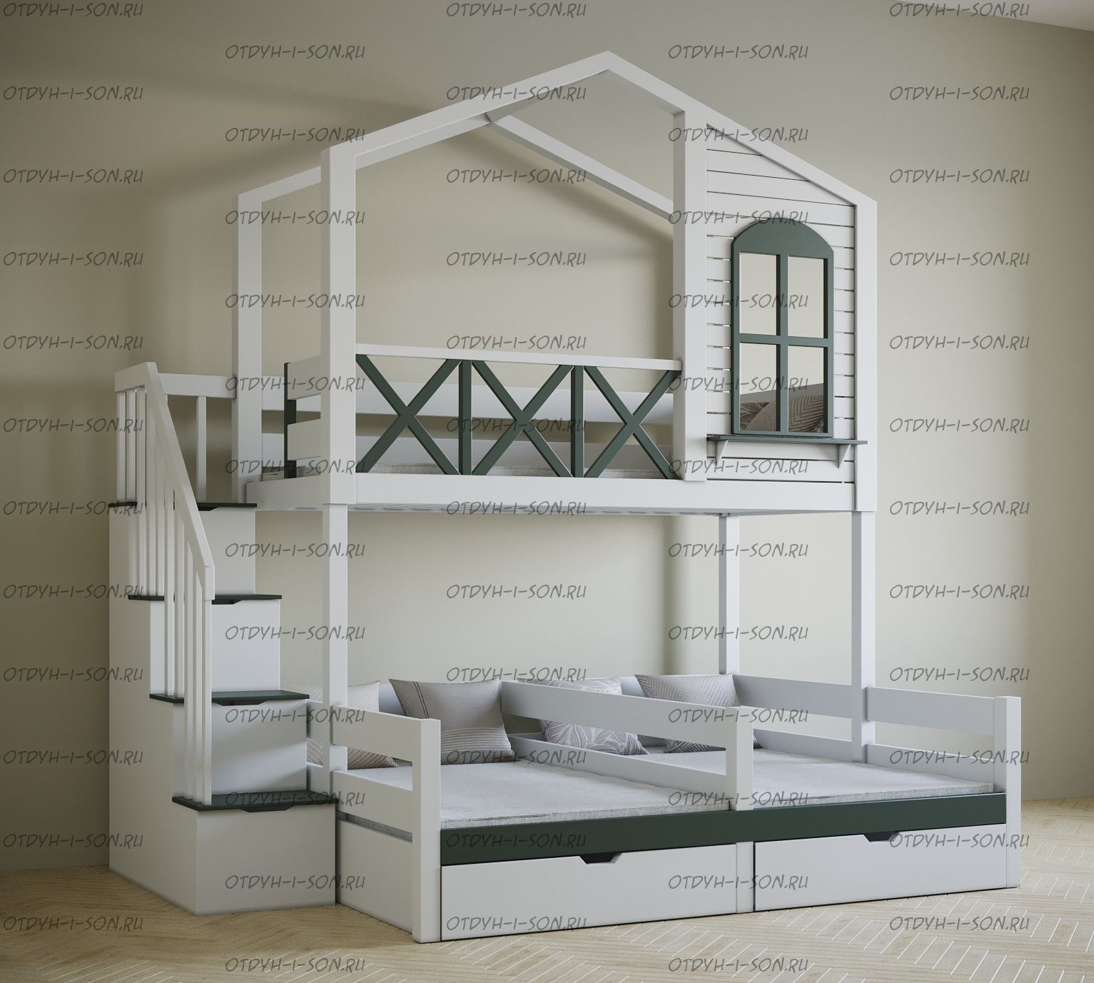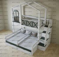 Кровать трехъярусная домик угловой Roof Trio №3D может быть изготовлена в любых размерах и цветах.