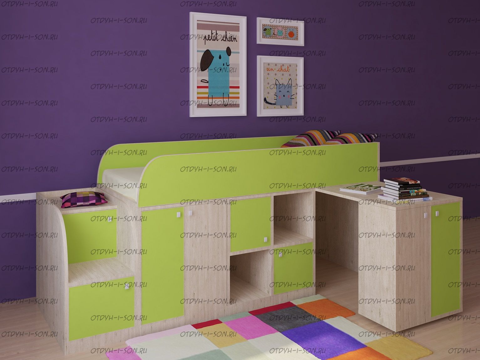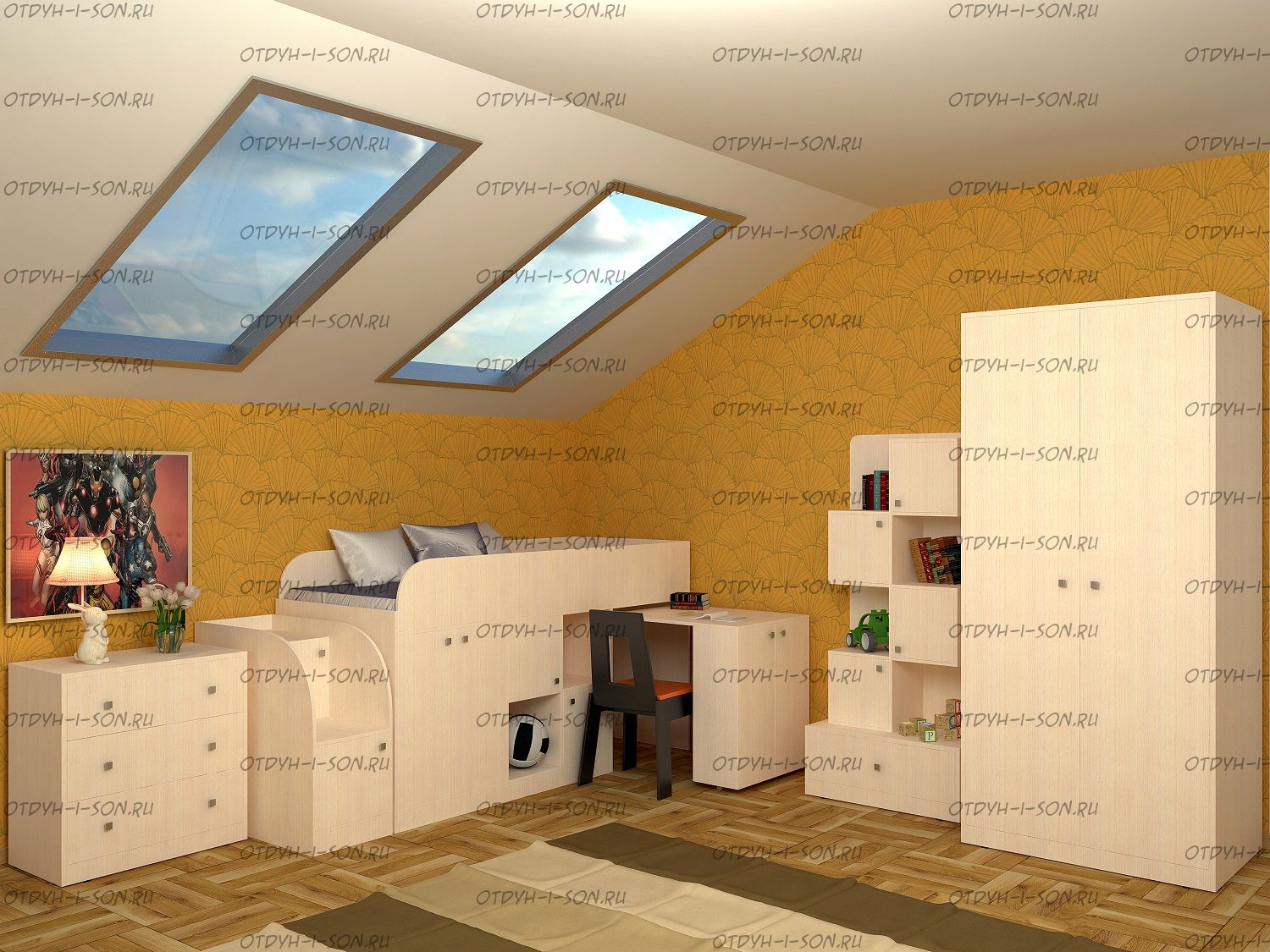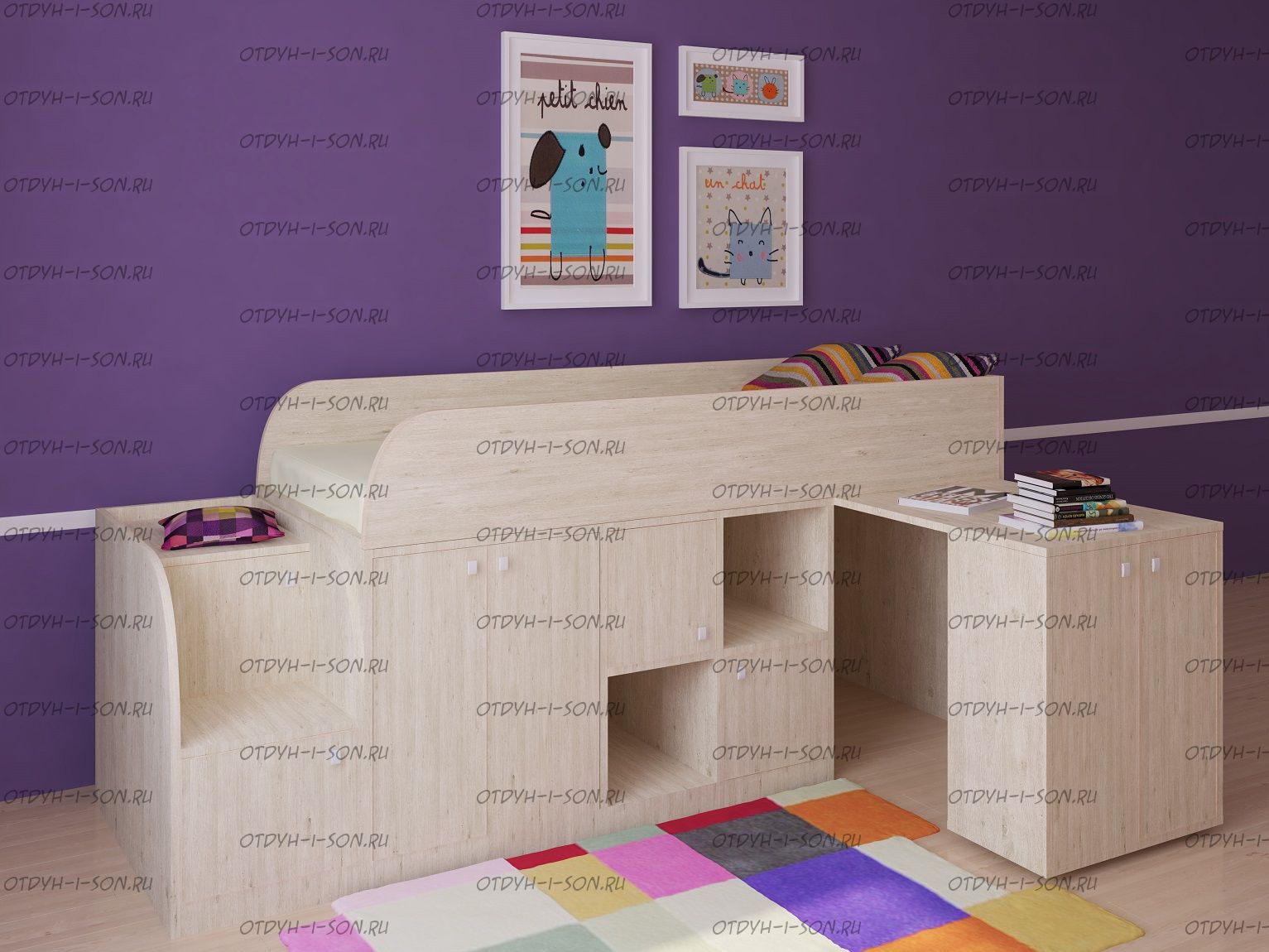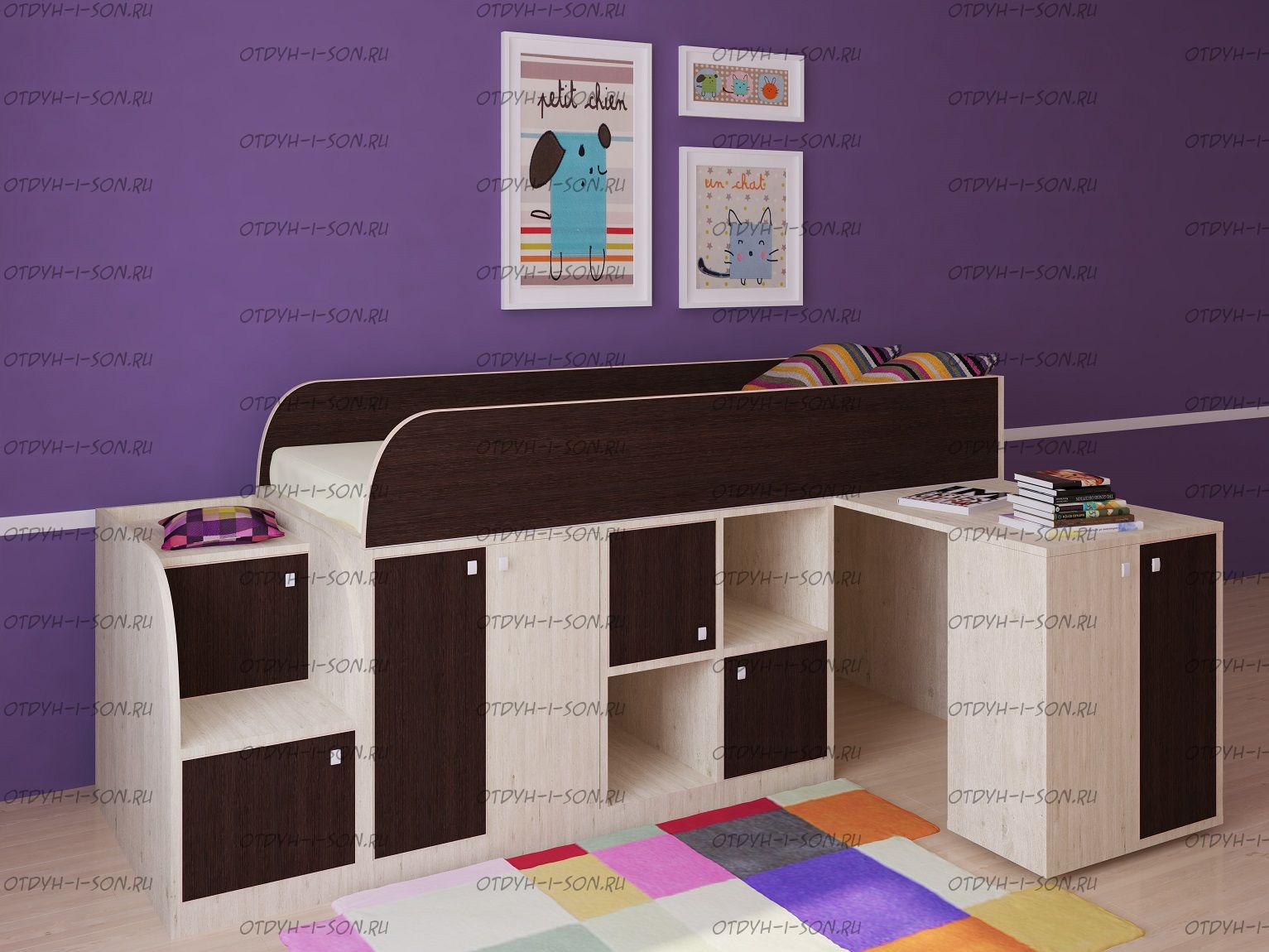 Кровать-чердак Астра мини Характеристики: Спальное место кровати: 80х190 см. Внешние габариты: 2323х832х1082 мм. Высота бортиков 30 см (макс. высота матраца 15 см). Матрас в стоимость не входит. Цвет корпуса: Дуб молочный, дуб шамони Вес: 145 кг. Объем: 0,6 куба Кол-во упаковок: 5 мест Цвет корпуса: Дуб молочный, венге, орех, Дуб шамони Цвет фасада на выбор: Венге, Розовый, Дуб молочный, Орех, Фиолетовый, Дуб шамони, Голубой, Оранжевый, Салатовый, Дуб молочный Максимальная нагрузка при интенсивной эксплуатации (с учётом матраса) - 120 кг. Универсальная сборка, при необходимости собирается как в левую, так и в правую стороны т.е. расположение элементов мебели определяется при сборке Дно кровати – лист ДСП 16 мм Состоит из: полноценное спальное место 1900х800 мм. безопасная лестница с 2-мя дверцами в ступенях, выдвижной стол с шкафчиком вместительный двустворчатый шкаф секция-стеллаж с открытыми и закрытыми отделениями
