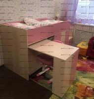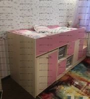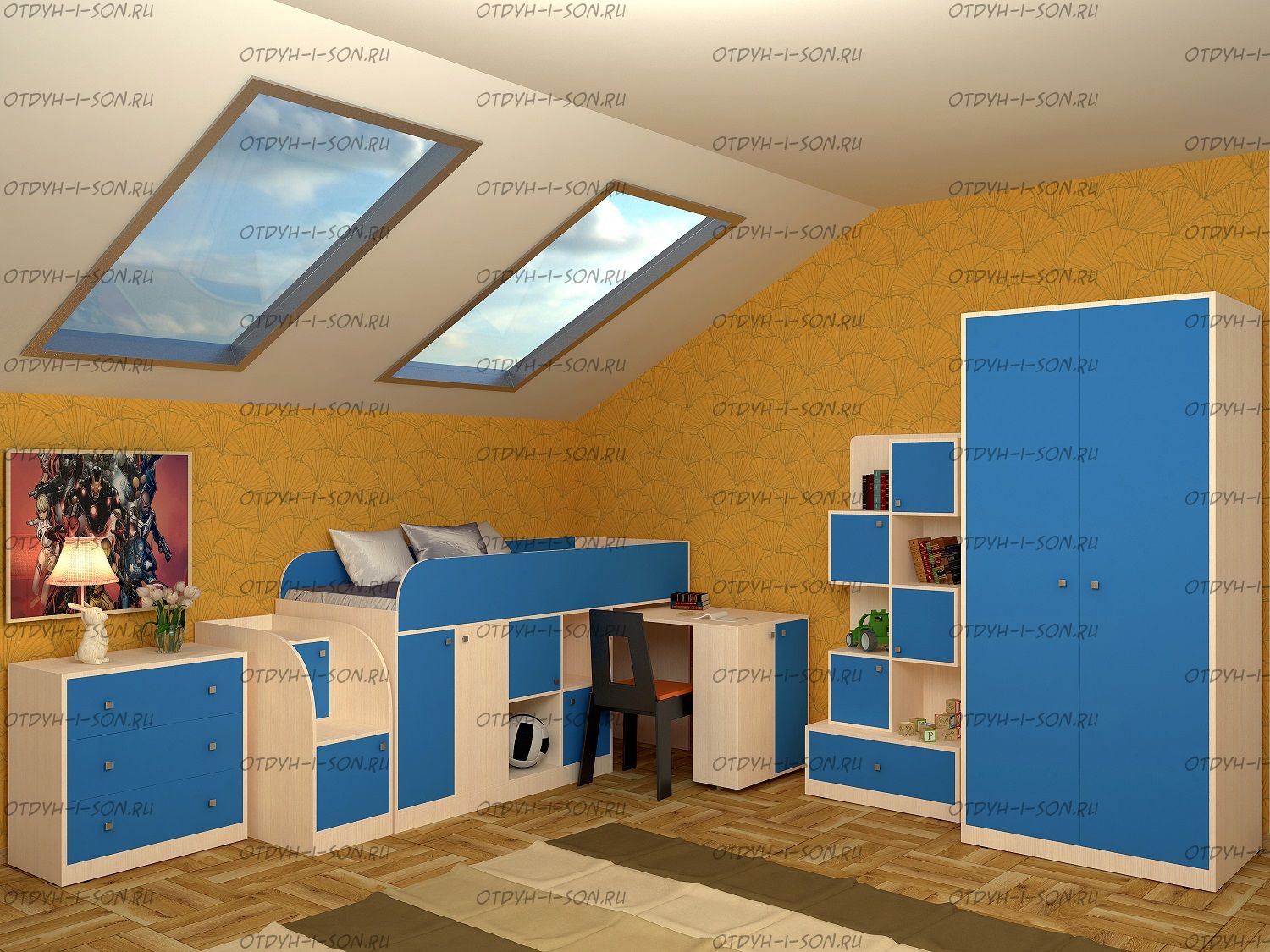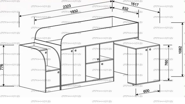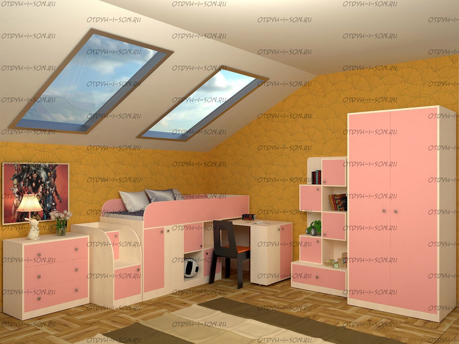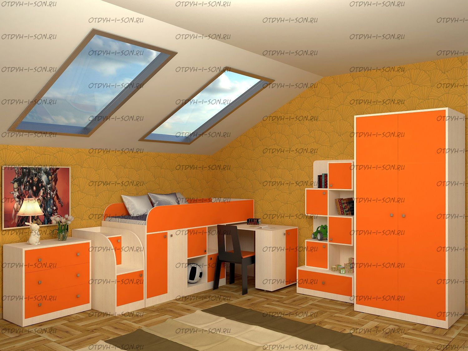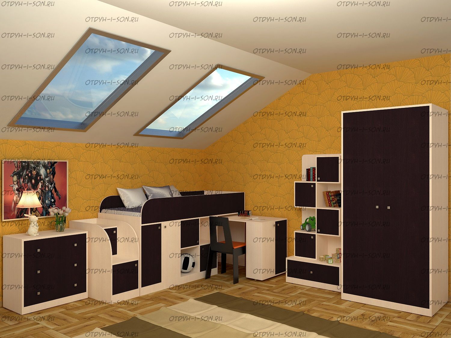 Кровать-чердак Астра мини Характеристики: Спальное место кровати: 80х190 см. Внешние габариты: 2323х832х1082 мм. Высота бортиков 30 см (макс. высота матраца 15 см). Матрас в стоимость не входит. Цвет корпуса: Дуб молочный, дуб шамони Вес: 145 кг. Объем: 0,6 куба Кол-во упаковок: 5 мест Цвет корпуса: Дуб молочный, венге, орех, Дуб шамони Цвет фасада на выбор: Венге, Розовый, Дуб молочный, Орех, Фиолетовый, Дуб шамони, Голубой, Оранжевый, Салатовый, Дуб молочный Максимальная нагрузка при интенсивной эксплуатации (с учётом матраса) - 120 кг. Универсальная сборка, при необходимости собирается как в левую, так и в правую стороны т.е. расположение элементов мебели определяется при сборке Дно кровати – лист ДСП 16 мм Состоит из: полноценное спальное место 1900х800 мм. безопасная лестница с 2-мя дверцами в ступенях, выдвижной стол с шкафчиком вместительный двустворчатый шкаф секция-стеллаж с открытыми и закрытыми отделениями