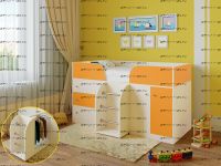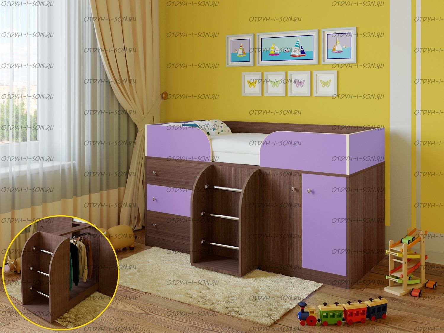 Кровать-чердак Астра-5 Характеристики: Спальное место кровати 80х190 см. Внешние габариты: 1932х116х1085 Большая кровать на 2 ярусе. Высота бортиков 30 см (макс. высота матраца 15 см). Матрас в стоимость не входит. Цвет корпуса: Дуб молочный, венге, орех, Дуб шамони Цвет фасада на выбор: Венге, Розовый, Дуб молочный, Орех, Фиолетовый, Дуб шамони, Голубой, Оранжевый, Салатовый, Дуб молочный