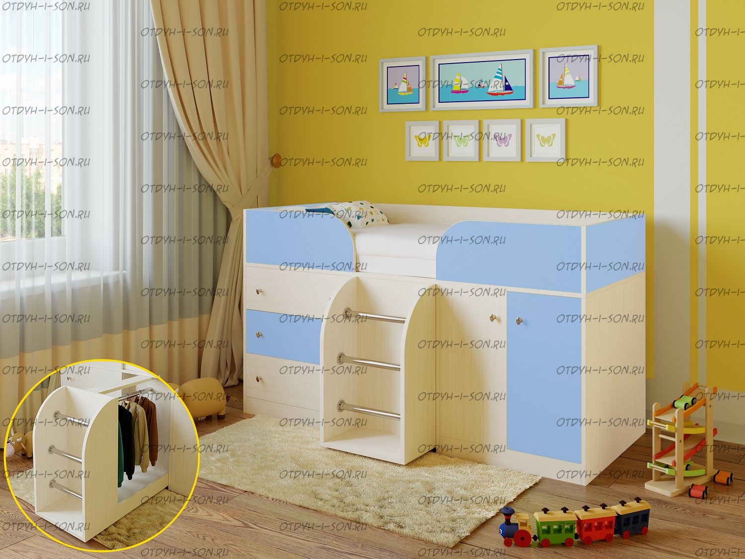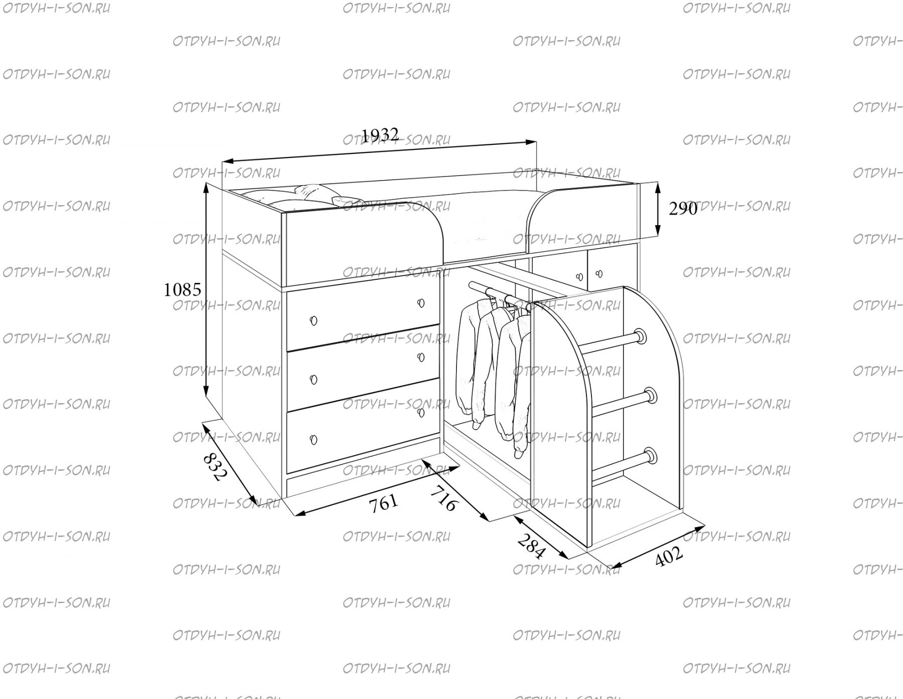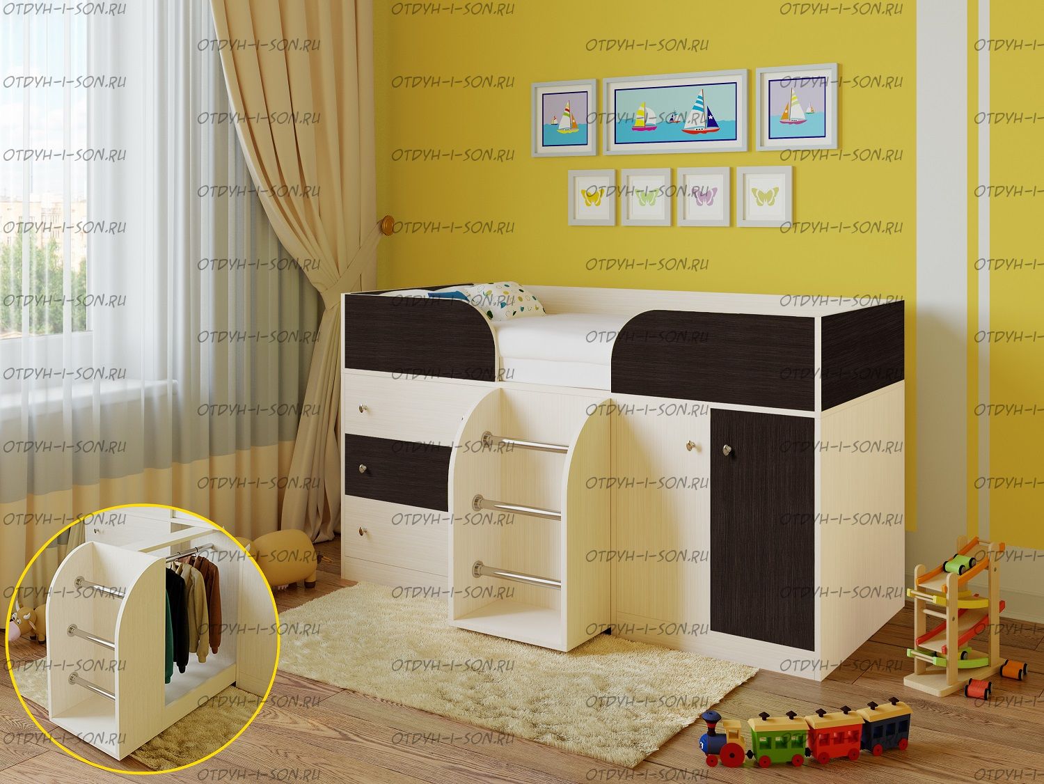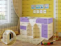Кровать-чердак Астра-5 Характеристики: Спальное место кровати 80х190 см. Внешние габариты: 1932х116х1085 Большая кровать на 2 ярусе. Высота бортиков 30 см (макс. высота матраца 15 см). Матрас в стоимость не входит. Цвет корпуса: Дуб молочный, венге, орех, Дуб шамони Цвет фасада на выбор: Венге, Розовый, Дуб молочный, Орех, Фиолетовый, Дуб шамони, Голубой, Оранжевый, Салатовый, Дуб молочный