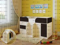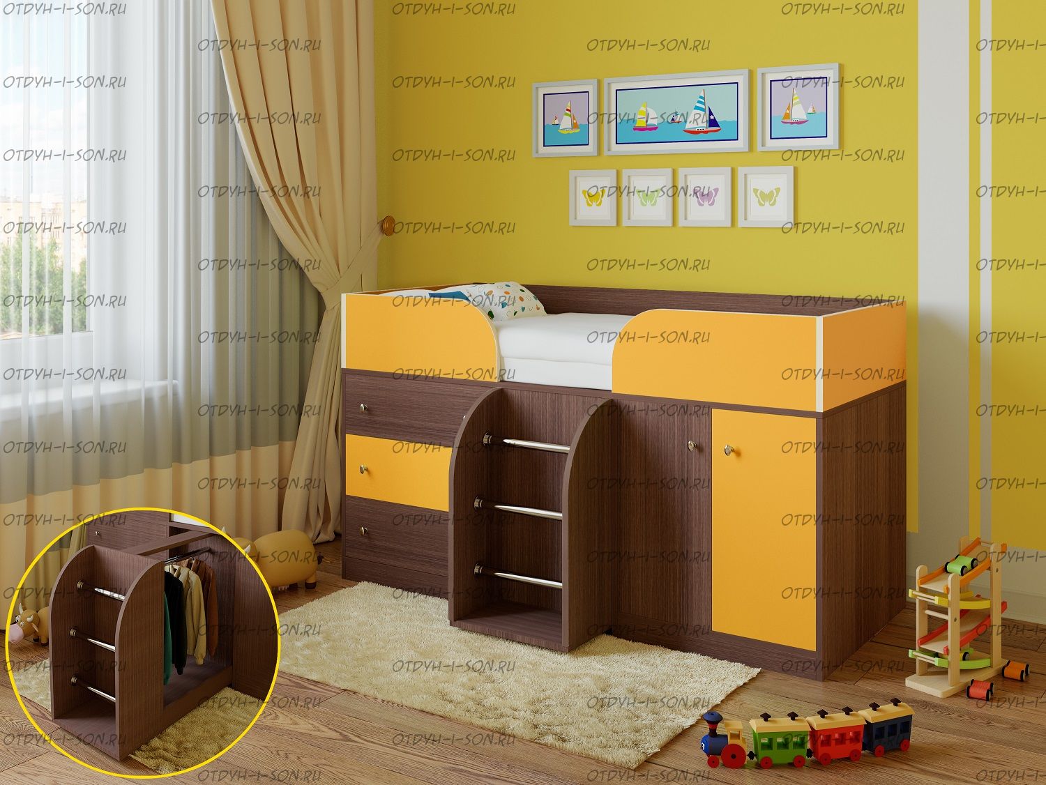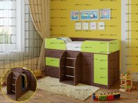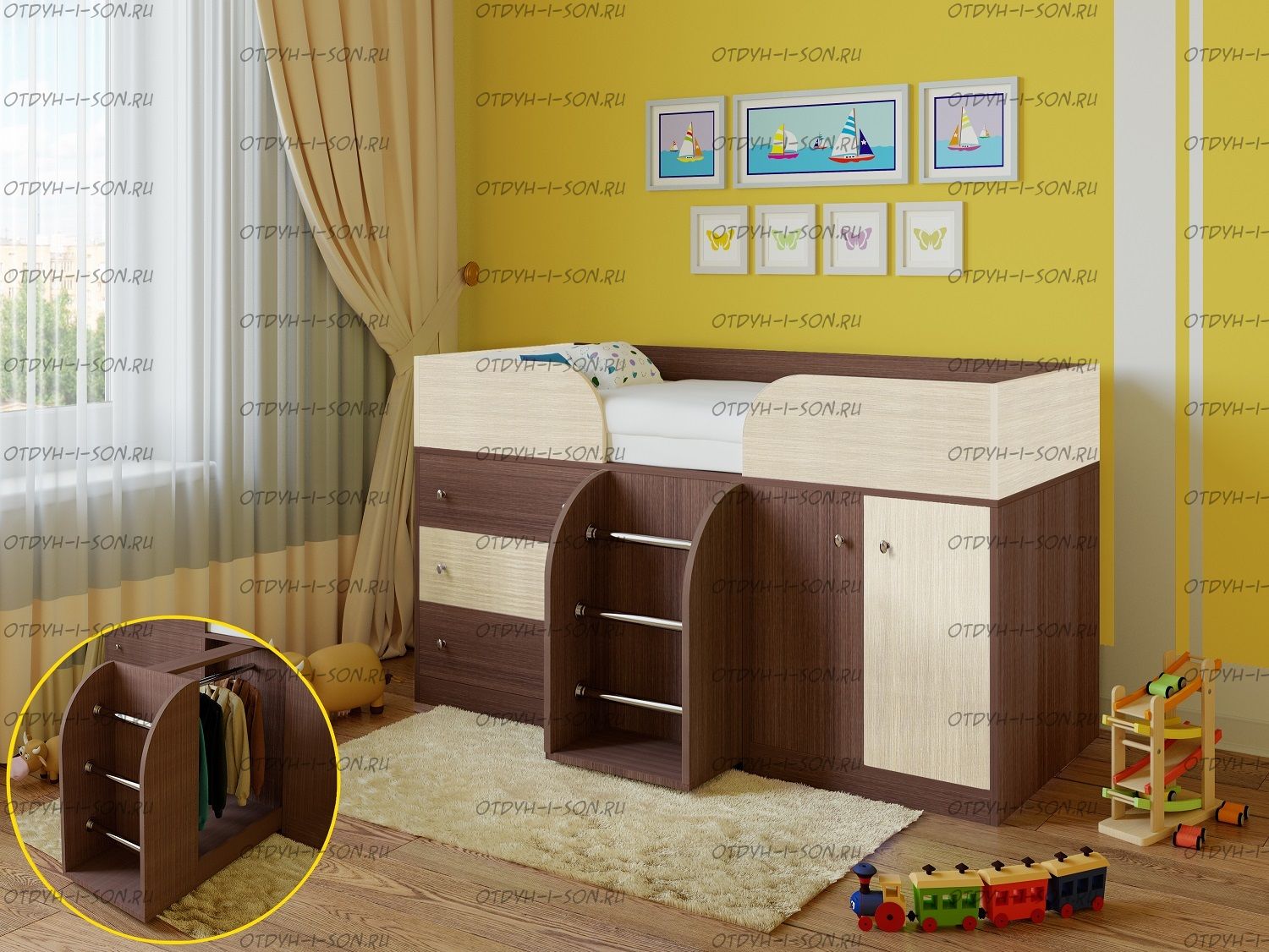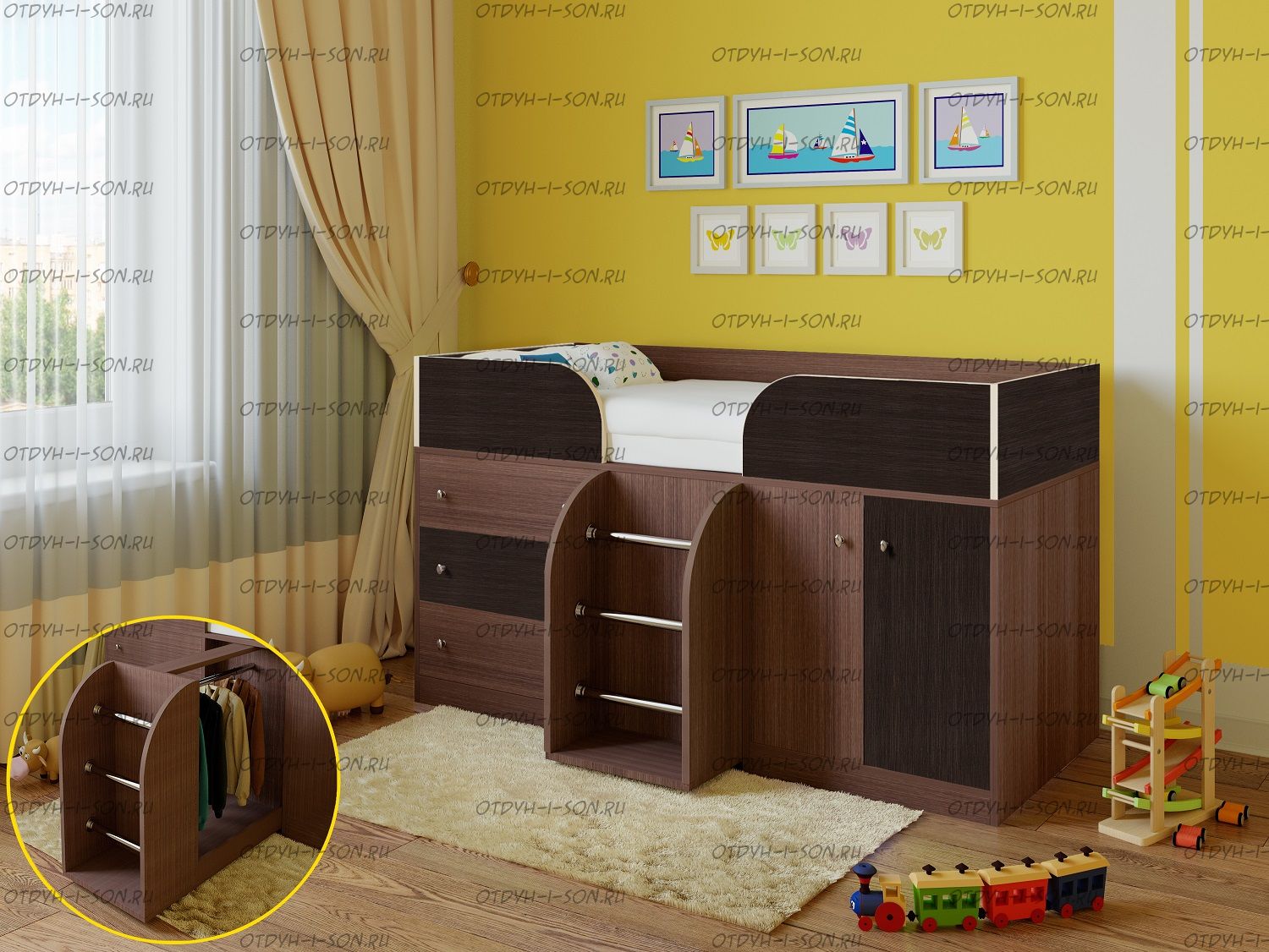 Кровать-чердак Астра-5 Характеристики: Спальное место кровати 80х190 см. Внешние габариты: 1932х116х1085 Большая кровать на 2 ярусе. Высота бортиков 30 см (макс. высота матраца 15 см). Матрас в стоимость не входит. Цвет корпуса: Дуб молочный, венге, орех, Дуб шамони Цвет фасада на выбор: Венге, Розовый, Дуб молочный, Орех, Фиолетовый, Дуб шамони, Голубой, Оранжевый, Салатовый, Дуб молочный