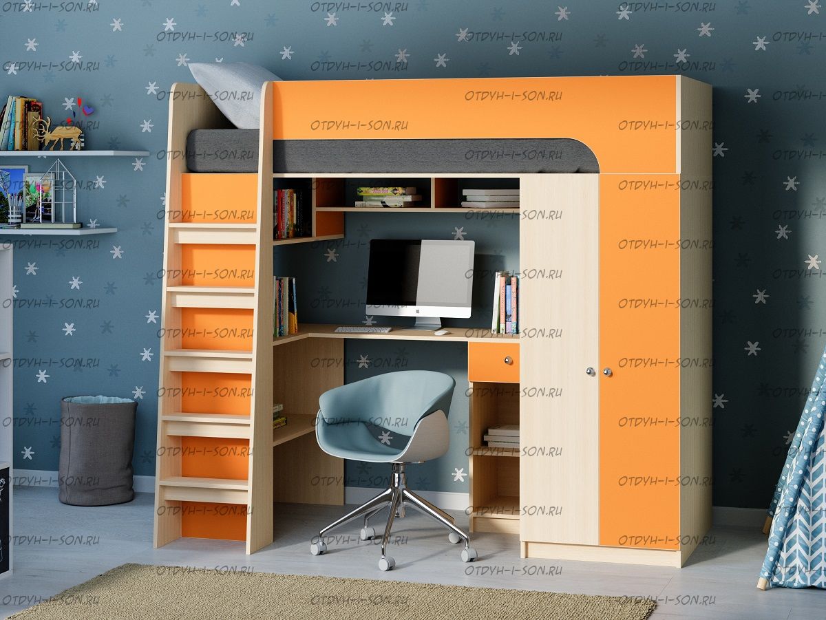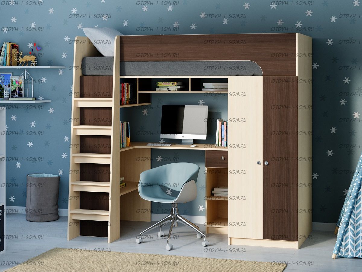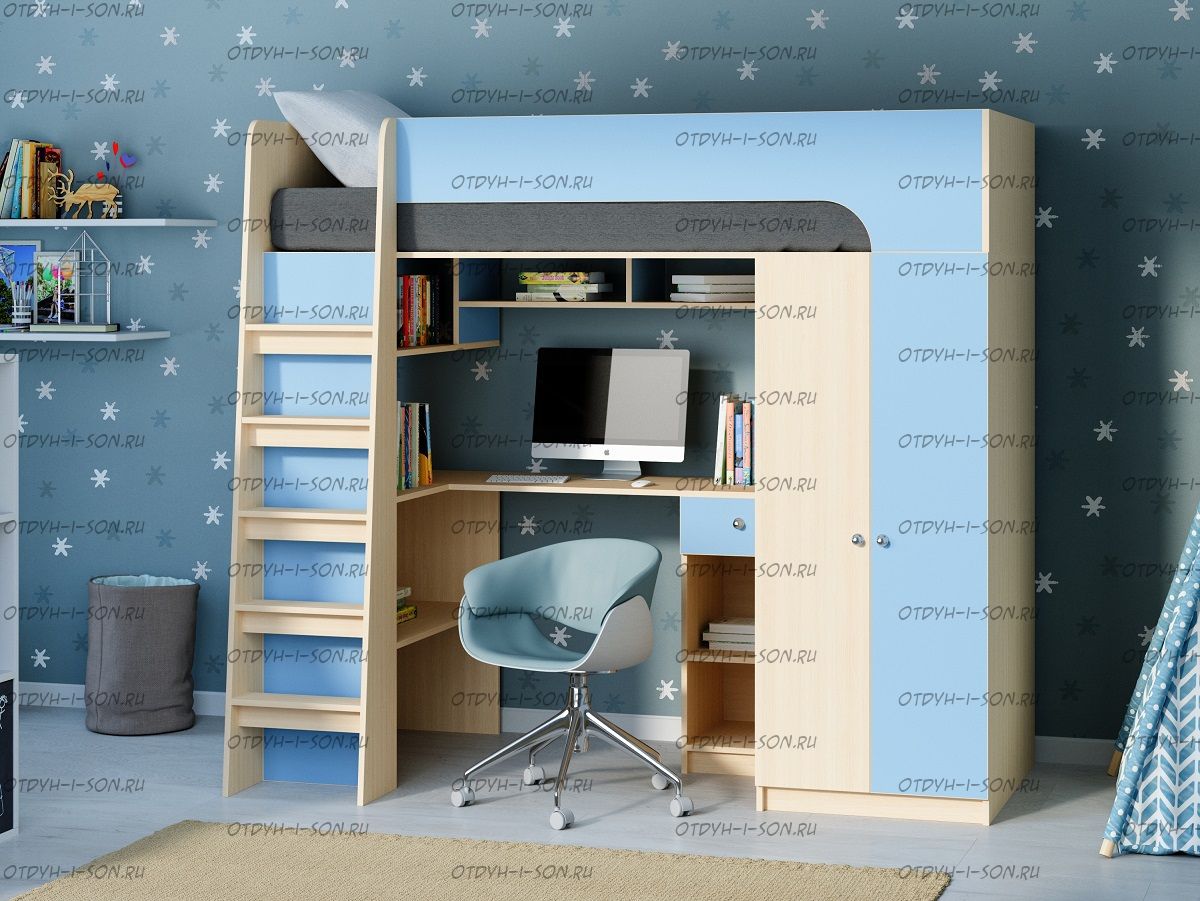 Кровать-чердак Астра-10. Кровать-чердак Астра 10 подойдёт как для детей от 3-х лет, так и для подростков. Все внешние и внутренние элементы расположены максимально удобно и эргономично. Спальное место достаточно вместительное, чтобы ребёнок чувствовал себя комфортно. А бортик высотой 360 мм будет надежной защитой во время сна. Боковинки лестницы глубиной 240 мм выполнены из качественного ЛДСП. Вместительный шкаф имеет штангу для вешалок и три полки. Над и под столом расположены полки для книг. Также под столешницей есть выдвижной ящик для мелочей. Хороший выбор для организации спального и рабочего места для вашего ребёнка. Кровать-чердак Астра 10 производится из экологически чистых материалов (ЛДСП / Металл / ПВХ) и имеет необходимые сертификаты, фабрика «РВ Мебель» осуществляет гарантийную поддержку.
