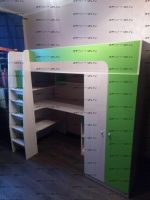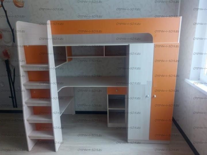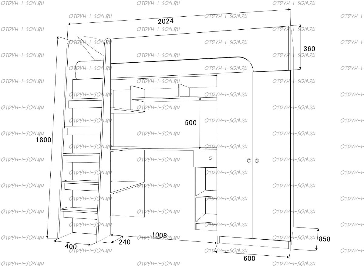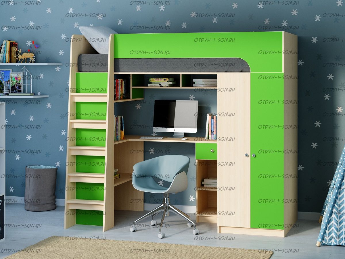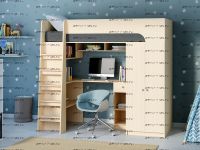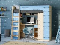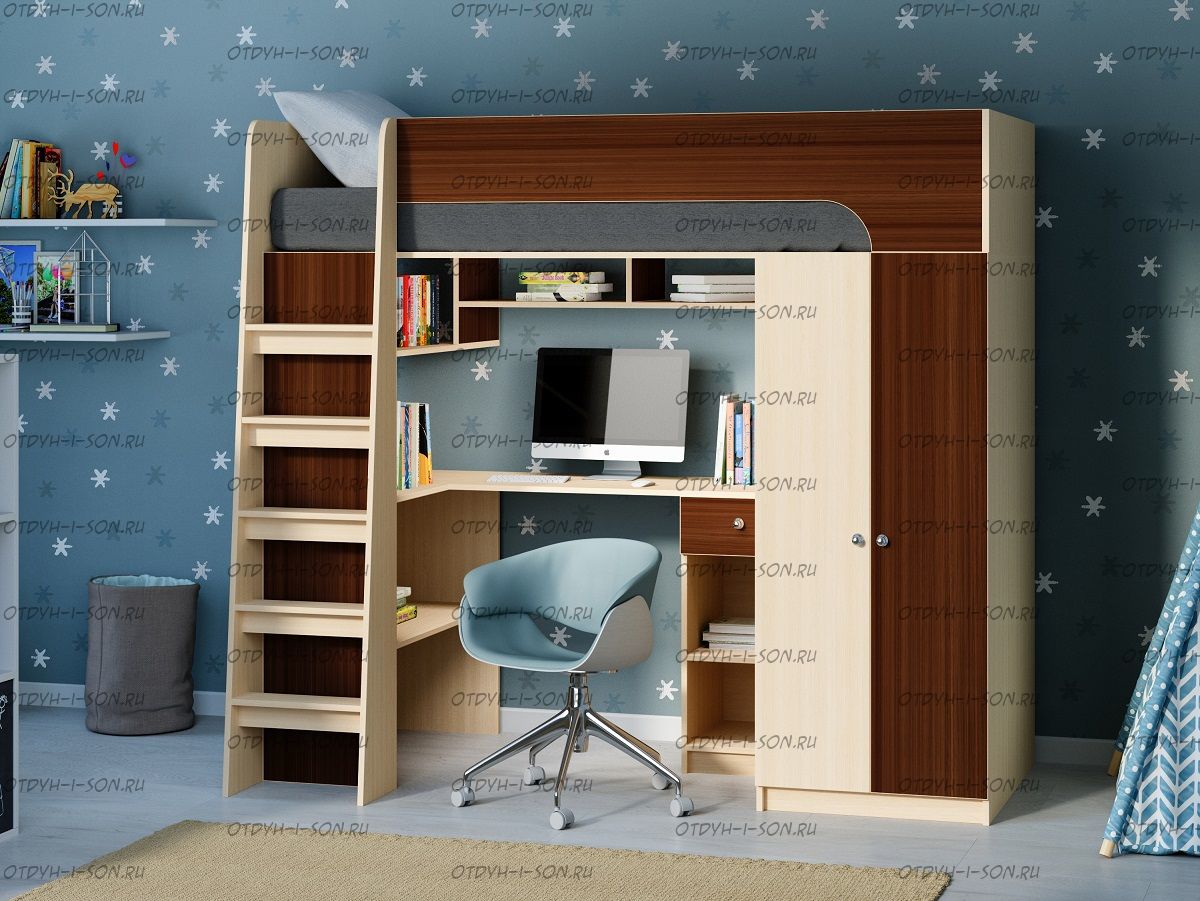 Кровать-чердак Астра-10. Кровать-чердак Астра 10 подойдёт как для детей от 3-х лет, так и для подростков. Все внешние и внутренние элементы расположены максимально удобно и эргономично. Спальное место достаточно вместительное, чтобы ребёнок чувствовал себя комфортно. А бортик высотой 360 мм будет надежной защитой во время сна. Боковинки лестницы глубиной 240 мм выполнены из качественного ЛДСП. Вместительный шкаф имеет штангу для вешалок и три полки. Над и под столом расположены полки для книг. Также под столешницей есть выдвижной ящик для мелочей. Хороший выбор для организации спального и рабочего места для вашего ребёнка. Кровать-чердак Астра 10 производится из экологически чистых материалов (ЛДСП / Металл / ПВХ) и имеет необходимые сертификаты, фабрика «РВ Мебель» осуществляет гарантийную поддержку.