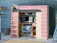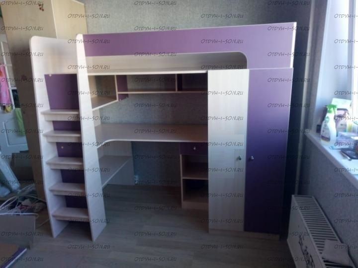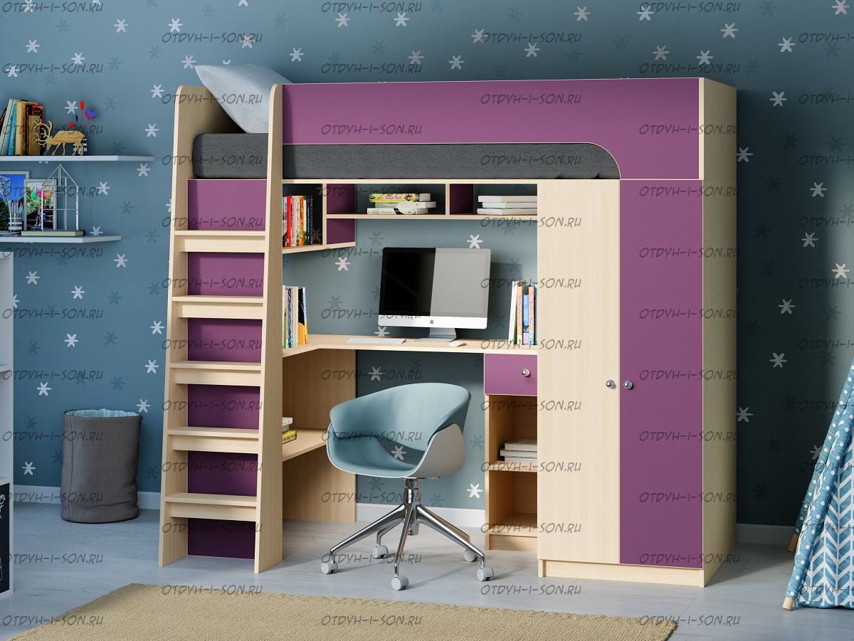 Кровать-чердак Астра 10 Характеристики: Спальное место кровати: 80х195 см. Внешние габариты (ШхГхВ): 2024х1098х1800 мм. Материал: ЛДСП, ПВХ, металл Максимальная нагрузка: до 100 кг (при интенсивной эксплуатации с учётом веса матраса) Дно кровати: лист ДСП 16 мм Сборка: универсальная, на обе стороны Матрас в стоимость не входит. Цвет корпуса: Дуб молочный Цвет фасада на выбор: Венге, Розовый, Дуб молочный, Орех, Фиолетовый, Дуб шамони, Голубой, Оранжевый, Салатовый, Дуб молочный