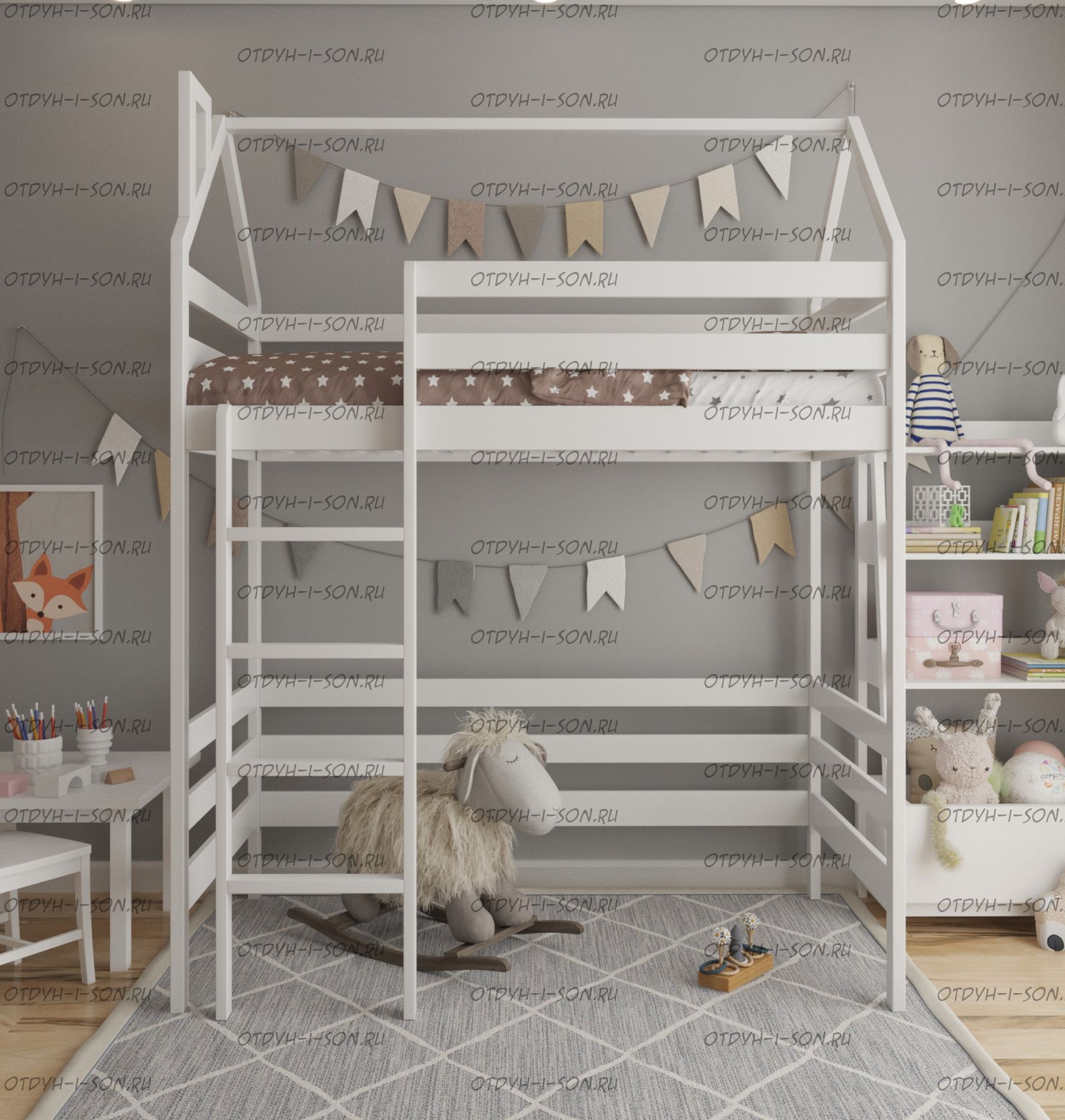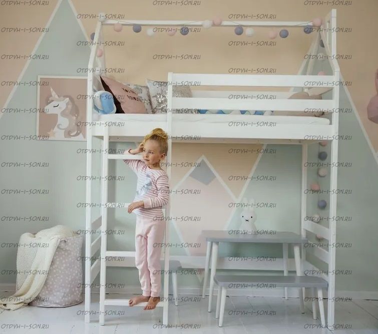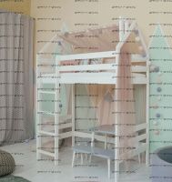 Кровать-чердак Домик Standard №21 Характеристики: Размер спального места: 80х160, 80х170, 90х160, 90х170, 90х180, 90х190 см. Общая высота кровати-чердака: 220см Высота от пола до царги: 125см Высота спального места: 149см Ширина лестницы: 45см Спинка:массив сосны, березовая мебельная фанера 12мм Каркас:массив сосны Основание:поперечные брусья массив, ДВП 4-5мм Ящики каркас:березовая фанера 12мм, дно ДВП 4-5мм, выкатная система (4 колесика) - к кровати не фиксируется Ящики фасад:березовая мебельная фанера 12-16мм, массив сосны Покрытие:Sayarlack (Италия), Renner (Италия) Цвет: орех, бук, венге, груша, дуб, каштан, клен, красное дерево, махагон, ольха, сосна, белый (эмаль), слоновая кость (эмаль)