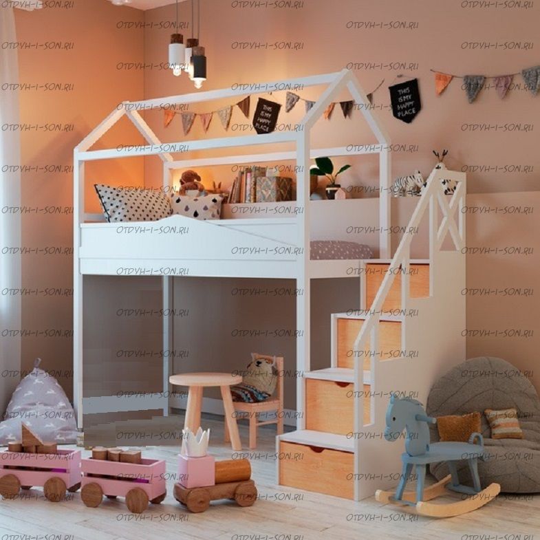 Кровать-чердак Домик Standard №29. На первой фотографии кровать с высотой от пола до начала боковины кровати 105 см. Но высоту изделия можно сделать почти любую по Вашему запросу. Характеристики: Размер спального места: 80х160, 80х170, 90х160, 90х170, 90х180, 90х190 см. Общая высота кровати-чердака: 220см Высота от пола до царги: 125см Высота спального места: 149см Ширина лестницы: 45см Спинка:массив сосны, березовая мебельная фанера 12мм Каркас:массив сосны Основание:поперечные брусья массив, ДВП 4-5мм Ящики каркас:березовая фанера 12мм, дно ДВП 4-5мм, выкатная система (4 колесика) - к кровати не фиксируется Ящики фасад:березовая мебельная фанера 12-16мм, массив сосны Покрытие:Sayarlack (Италия), Renner (Италия) Цвет: орех, бук, венге, груша, дуб, каштан, клен, красное дерево, махагон, ольха, сосна, белый (эмаль), слоновая кость (эмаль)