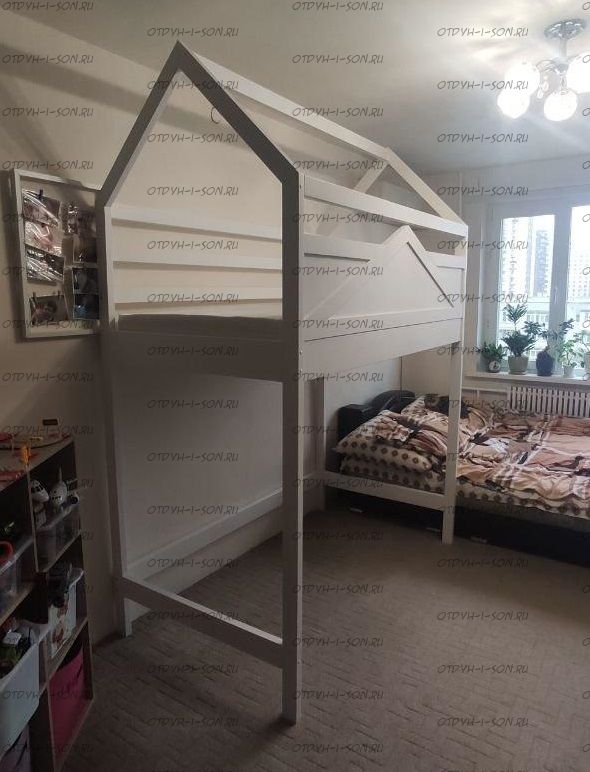 Кровать-чердак Домик Standard №29. На первой фотографии кровать с высотой от пола до начала боковины кровати 105 см. Но высоту изделия можно сделать почти любую по Вашему запросу.