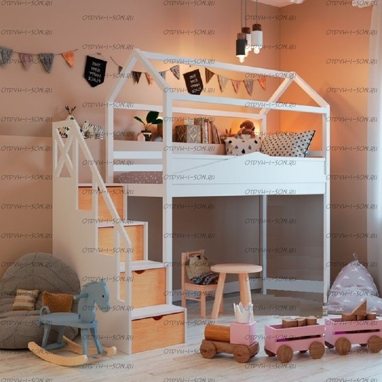 Кровать-чердак Домик Standard №29. На первой фотографии кровать с высотой от пола до начала боковины кровати 105 см. Но высоту изделия можно сделать почти любую по Вашему запросу. Характеристики: Размер спального места: 80х160, 80х170, 90х160, 90х170, 90х180, 90х190 см. Общая высота кровати-чердака: 220см Высота от пола до царги: 125см Высота спального места: 149см Ширина лестницы: 45см Спинка:массив сосны, березовая мебельная фанера 12мм Каркас:массив сосны Основание:поперечные брусья массив, ДВП 4-5мм Ящики каркас:березовая фанера 12мм, дно ДВП 4-5мм, выкатная система (4 колесика) - к кровати не фиксируется Ящики фасад:березовая мебельная фанера 12-16мм, массив сосны Покрытие:Sayarlack (Италия), Renner (Италия) Цвет: орех, бук, венге, груша, дуб, каштан, клен, красное дерево, махагон, ольха, сосна, белый (эмаль), слоновая кость (эмаль)