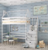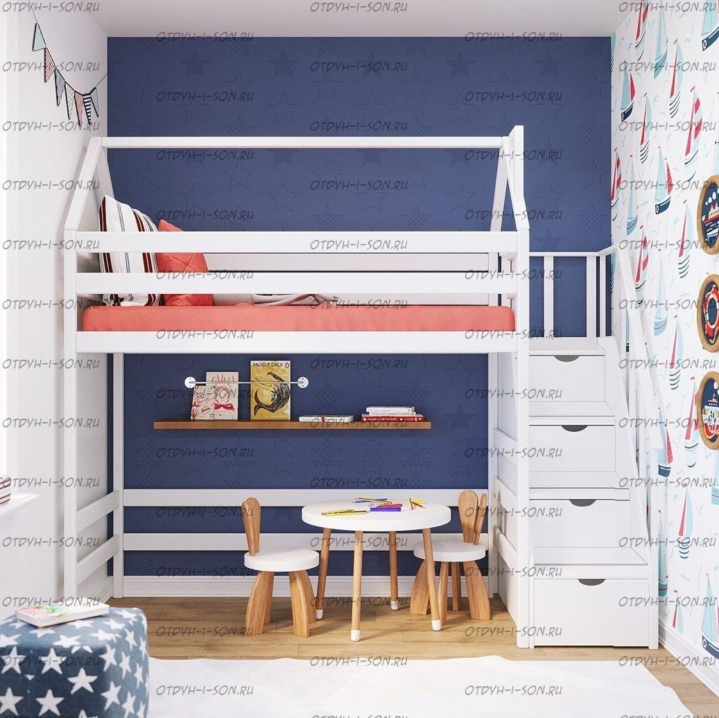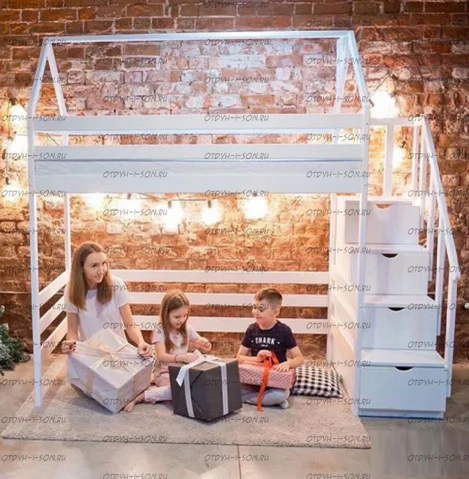 Кровать-чердак Домик Standard с лестницей комодом №21+ Характеристики: Размер спального места: 80х160, 80х170, 90х160, 90х170, 90х180, 90х190, 90х200, 100х190, 100х200 см. Общая высота кровати-чердака: 220-245 см Высота от пола до царги: 125-135 см Высота от пола до спального места при высоте матраса 17 см.,высота с учетом матраса: 149 см Ширина лестницы: 45 см Материалы: массив сосны Основание:поперечные брусья массив, ДВП 4-5мм Ящики каркас:березовая фанера 12мм, дно ДВП 4-5мм, выкатная система (4 колесика) - к кровати не фиксируется Ящики фасад:березовая мебельная фанера 12-16мм, массив сосны Покрытие:Sayarlack (Италия), Renner (Италия) Цвет: орех, бук, венге, груша, дуб, каштан, клен, красное дерево, махагон, ольха, сосна, белый (эмаль), слоновая кость (эмаль)