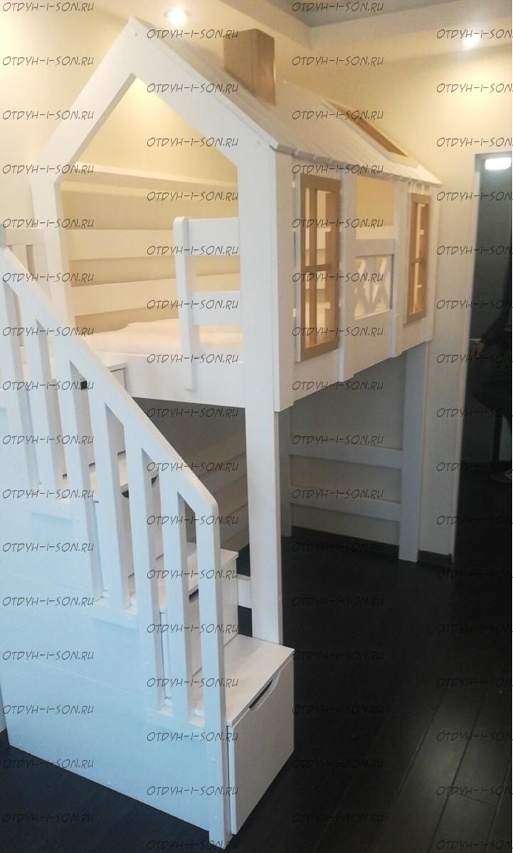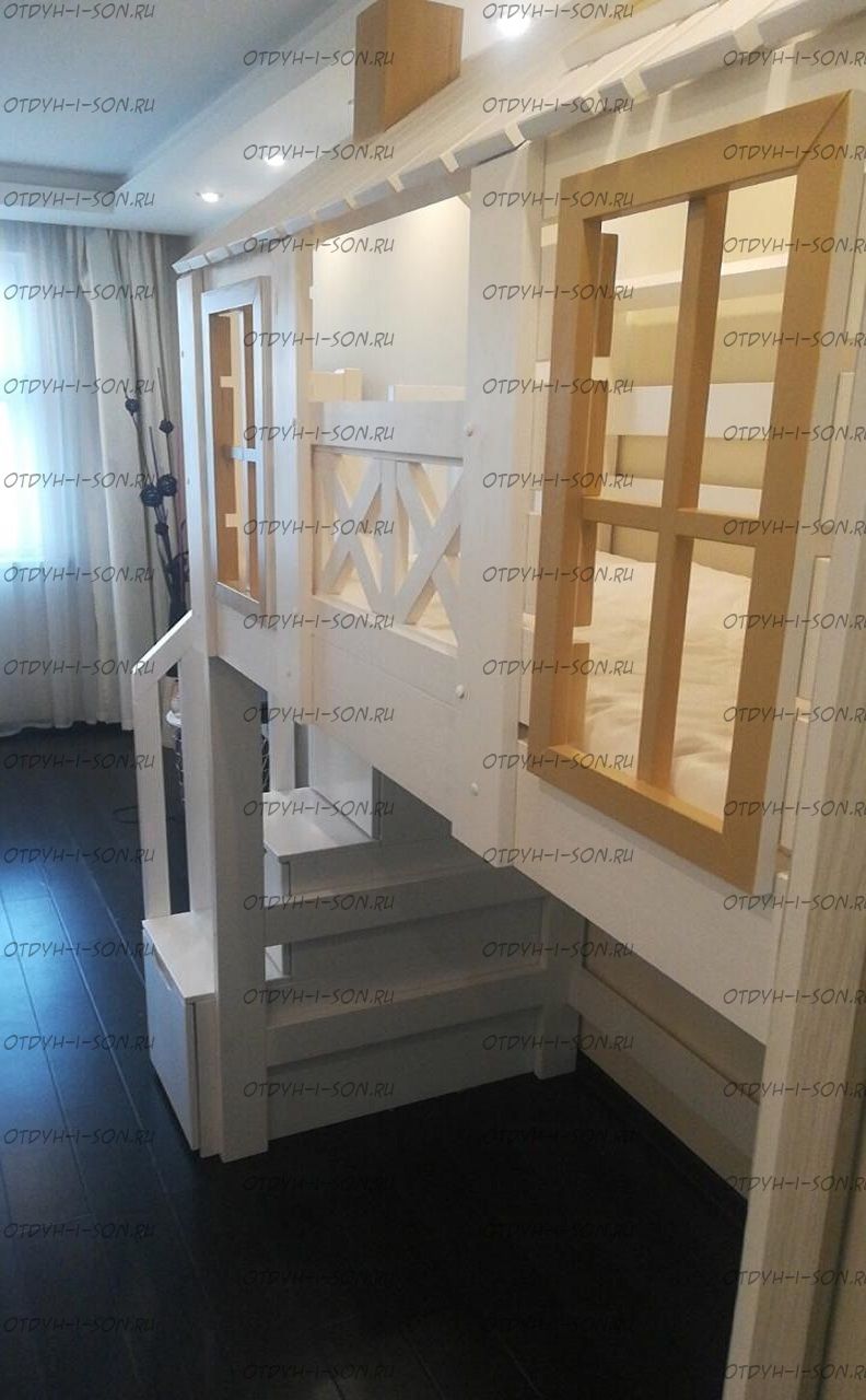 Кровать-чердак Домик Felicia №71 Характеристики: Размер спального места: 80х160 80х180, 80х190, 90х160 90х180, 90х190, 90х200 см. Также можно изготовить данное изделие по Вашим размерам. Материалы: сосна, бук