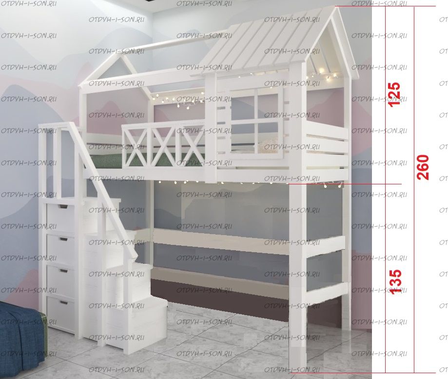 Кровать-чердак Домик Standard №34А может быть изготовлена как двухъярусная кровать. Характеристики: Размер спального места: 70х180, 80х180 см, 80х190 см, 90х190 см., 90х200 см. (и любые другие на Ваш вкус) Внешние размеры: Материал: сосна Возможны любые нестандартные размеры Вес кровати: Объем кровати: Цвет: Возможность трансформации в отдельно стоящие кровать чердак и двуспальную кровать; - без матрасов; опорный брус спинок(ножки) - 40х80мм. Внимание: для любой модели кровати возможно увеличение высоты бортиков кровати! Возможно изготовление кровати нестандартных размеров по вашим замерам, доплата за нестандартный размер: - за кровать + 10% от стоимости изделия; Производство Владимирской мебельной фабрики, кровать доставляется напрямую от производителя, самовывоз ограничен.