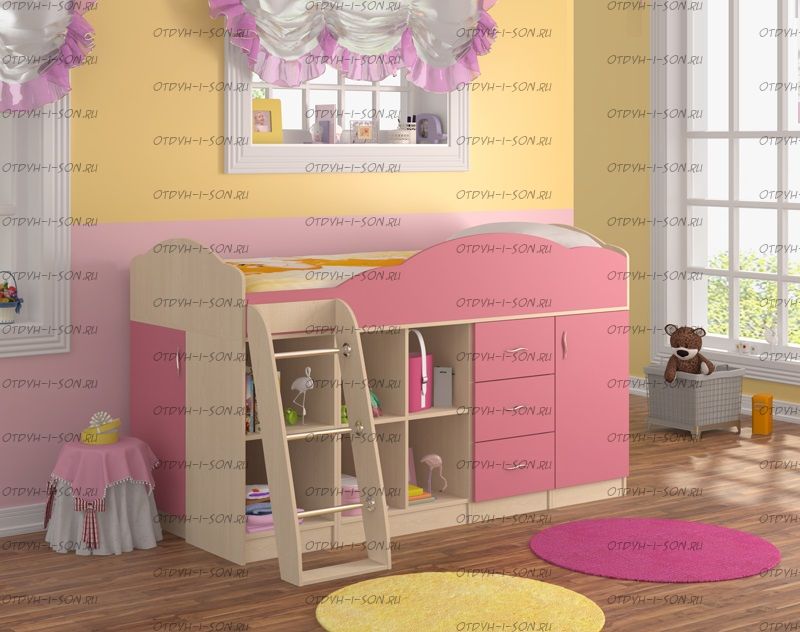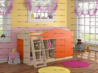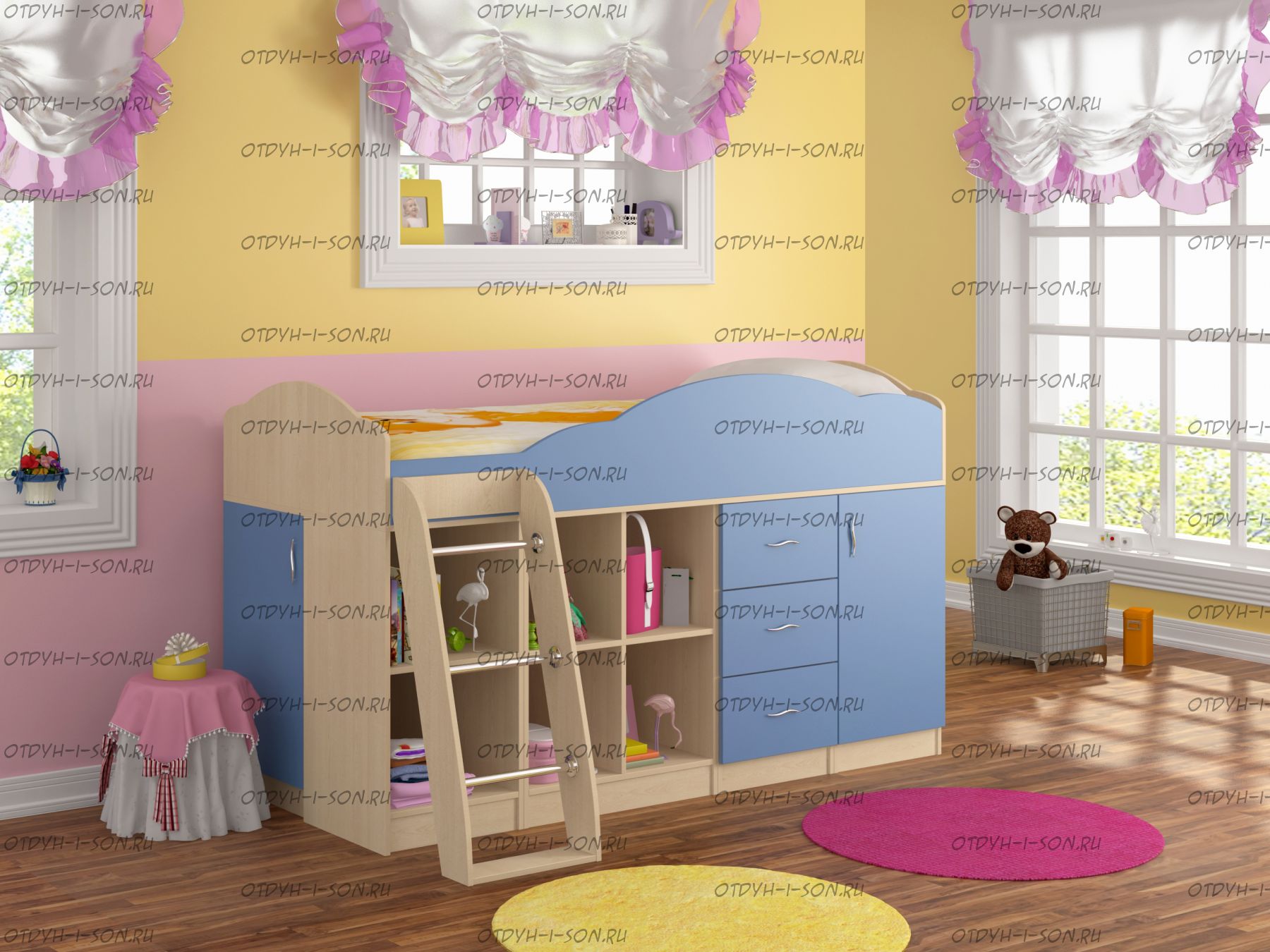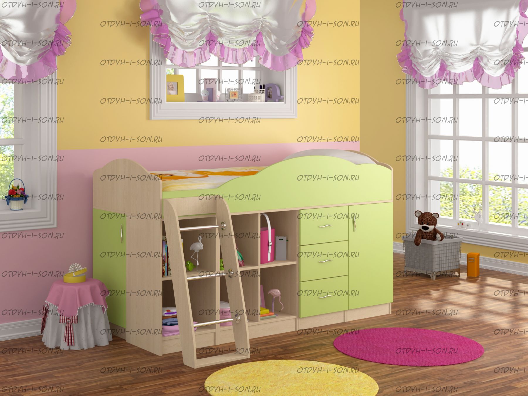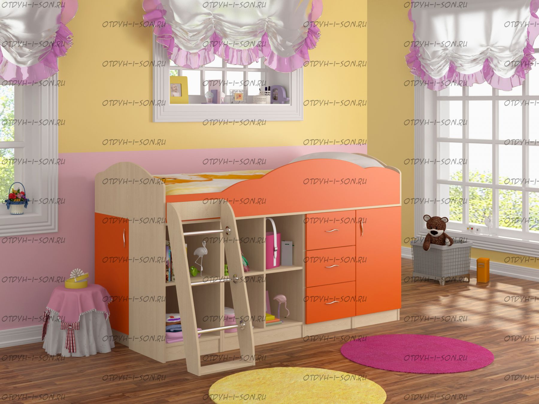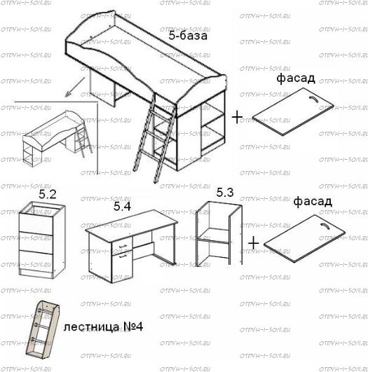 Кровать-чердак Дюймовочка-5.4 Матрац приобретается отдельно. Комплектация: Кровать-чердак базовая Дюймовочка-5 Тумба большая Дюймовочка-5.1 Тумба с ящиками Дюймовочка-5.2 Тумба малая Дюймовочка-5.3 Фасады - 2шт. Характеристики: Размер спального места: 80Х190см. Толщина матраца рекомендуется 8-12 см. Внешние габариты (ШхГхВ): 1950х1240х1150 мм. Материалы: ЛДСП Гарантия: 18 мес. Цвета корпуса: дуб молочный, дуб сонома, венге, орех Цвета фасадов: ольха, оранжевый, орех, дуб молочный, голубой, салатовый, крем ваниль, розовый, салатовый, венге, зеленый текстиль, желтый Кровать чердак с рабочей зоной Дюймовочка при сборке универсальна: ее можно собирать налево или направо