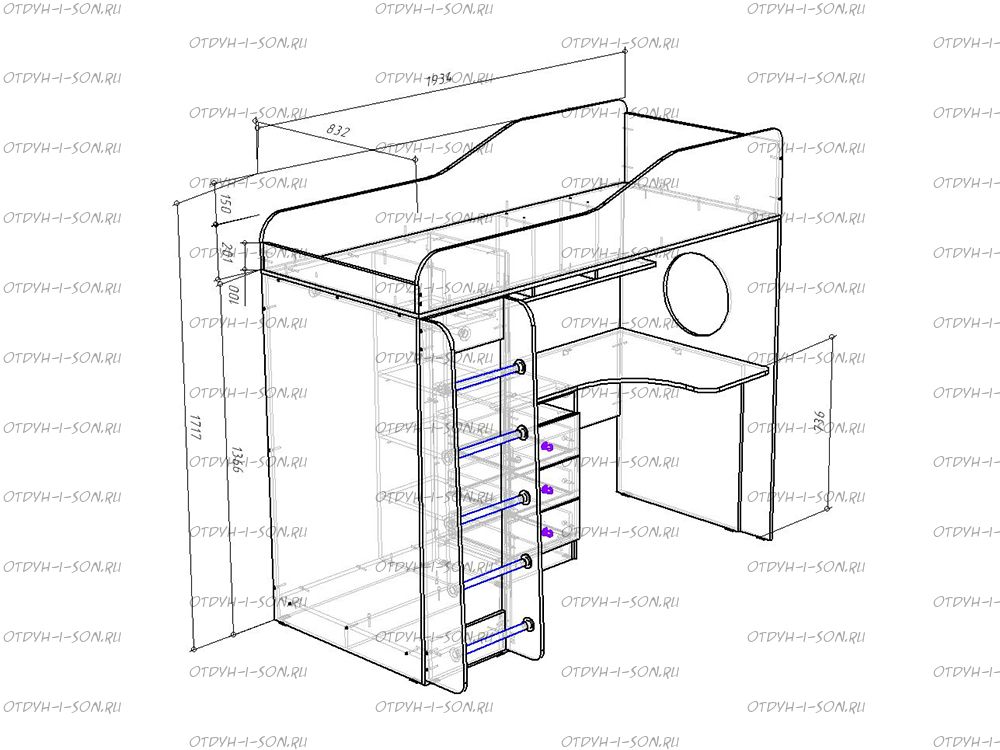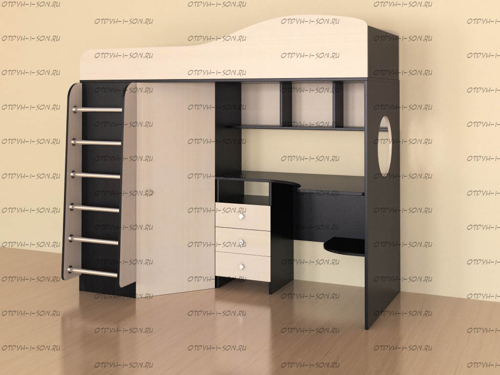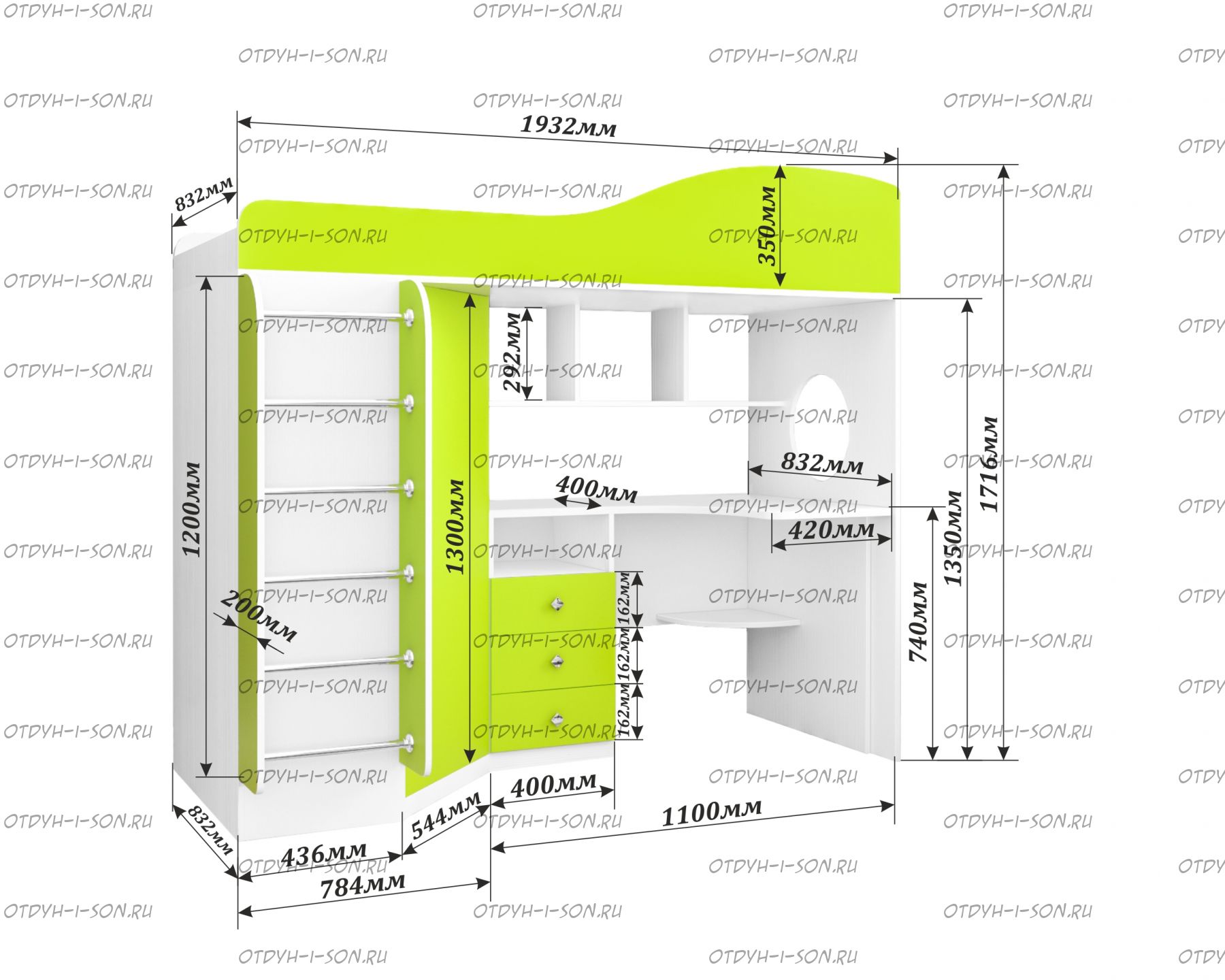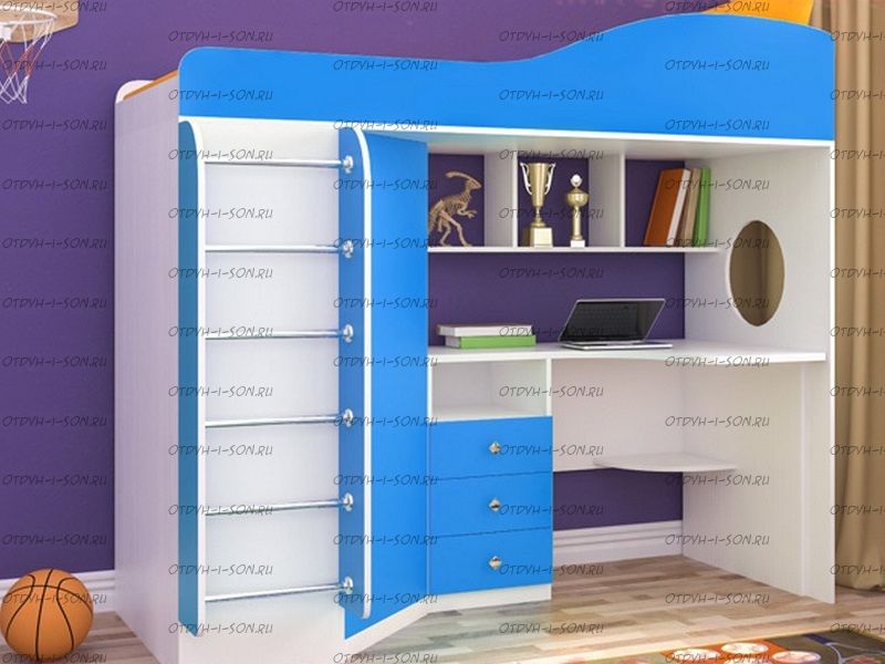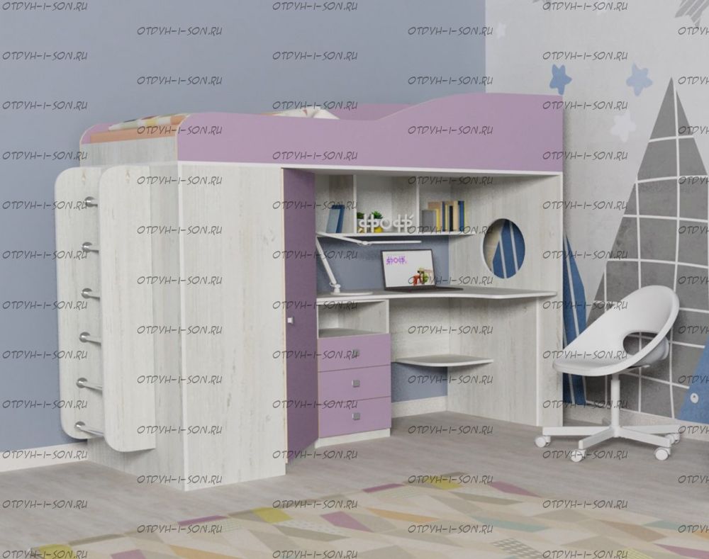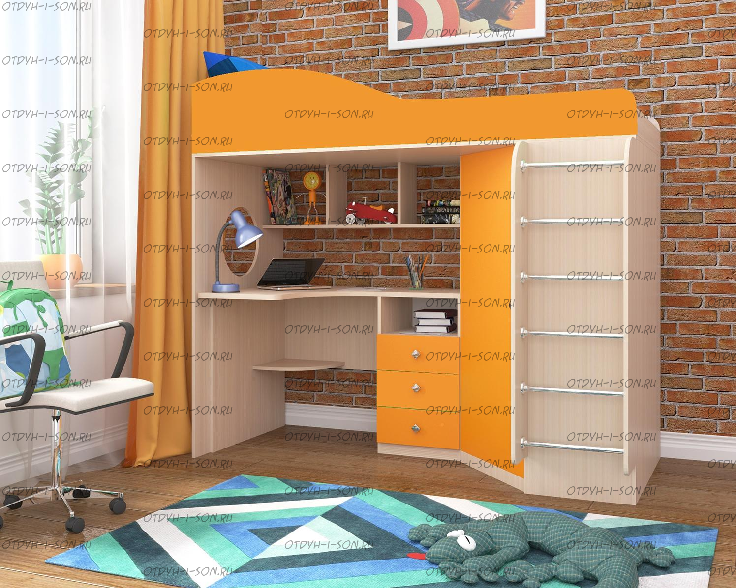 Кровать-чердак Кадет-1А Комплектация: Кровать-чердак КАДЕТ Вместительный, встроенный шкаф, Вместительная тумба-лестница с ящиками для игрушек Характеристики: Верхнее спальное место 80х190 см. Габаритные размеры: Размер: Д2564 × Г832 х В1716 мм. Вес: 240 кг Объем: 0,4м3 Кол-во пакетов: 5шт. Материалы: кромка АБС Цвета корпуса: Дуб молочный, венге, орех донской, орех итальянский, вишня, бодего темный, белое дерево. Цвета фасада: розовый, оранжевый, ирис, лайм, голубой, зеленый, бежевый, красный, бодего темный, дуб молочный, венге, вишня, орех донской, белое дерево.