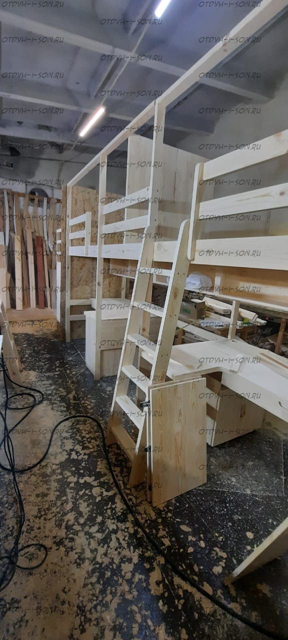Кровать-чердак Кадет №4В с рабочей зоной Характеристики: Размер спального места: 70х190 см, 70х200 см, 80х190 см, 80х200 см, 90х190 см, 90х200 см Материал: сосна Возможны нестандартные размеры Цвет (морилка)(+10%): беленый дуб, средний орех, сосна (натуральный), венге, светлый орех, ольха, орех, бук, красное дерево, клен красный, груша Цвет (эмаль) (+20 % от стоимости): фисташковый, белый, черный, темно-зеленый, слоновая кость (белый в бежевый), сиреневый, синий, светло-зеленый, розовый, красный, желтый, дуб молочный (белый в розовый), голубой Комплектация: Кровать-чердак Кадет-4 Стол, габариты (ШхГхВ): 75 х 50/60 х 180/190/200 см. Тумбочка (ШхГхВ): 45 х 45 х 65 см. Лестница, которая выполняется с любой стороны кровати по Вашему запросу. Расположение лестницы кровати не универсально и указывается. Матрас докупается отдельно Внимание: для любой модели кровати возможно увеличение высоты бортиков кровати! Возможно изготовление кровати нестандартных размеров по вашим замерам, доплата за нестандартный размер: - за кровать + 10% от стоимости изделия; Производство Владимирской мебельной фабрики, кровать доставляется напрямую от производителя, самовывоз ограничен.